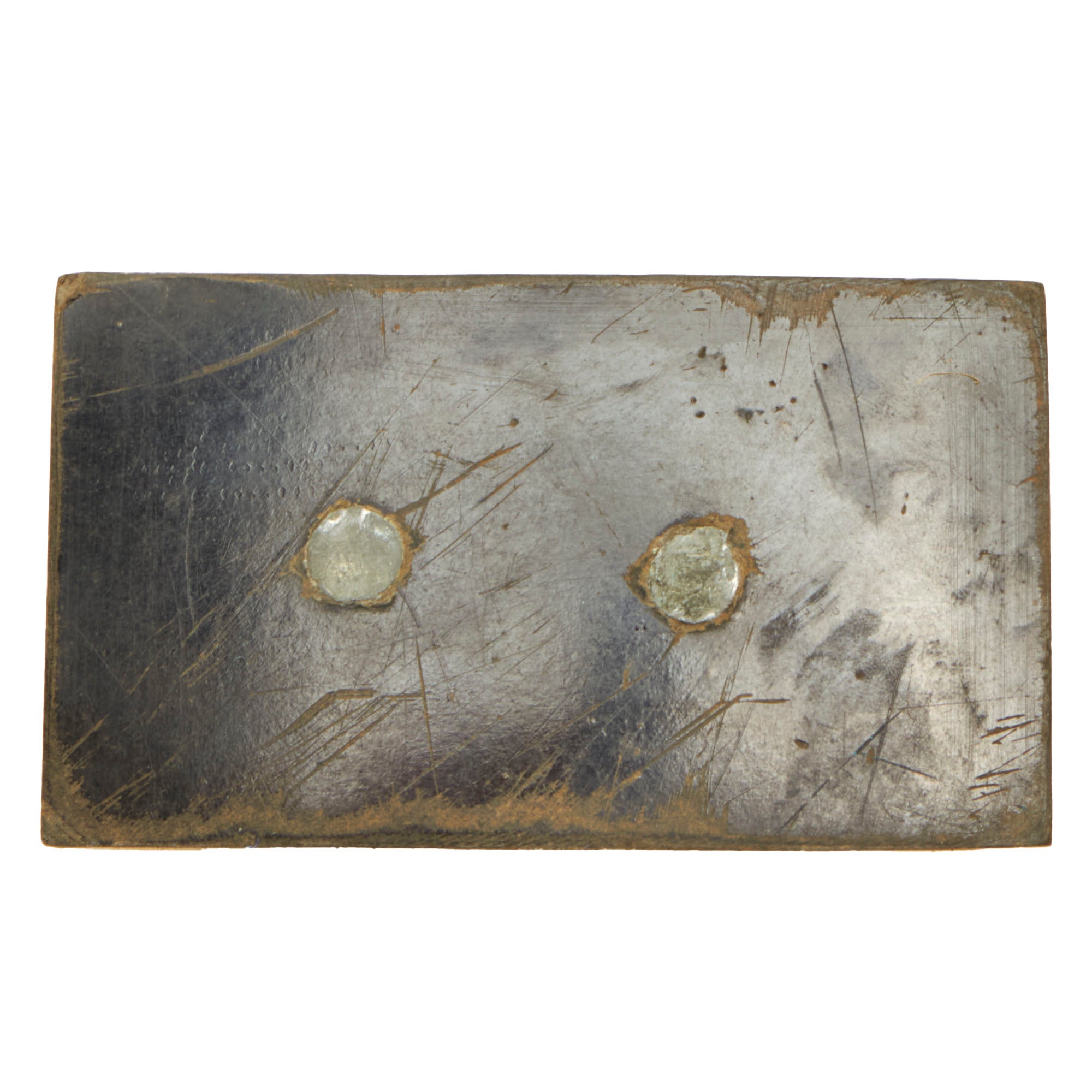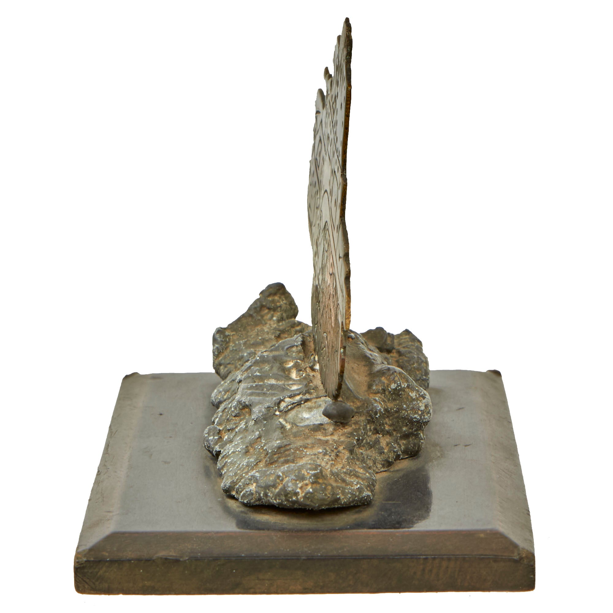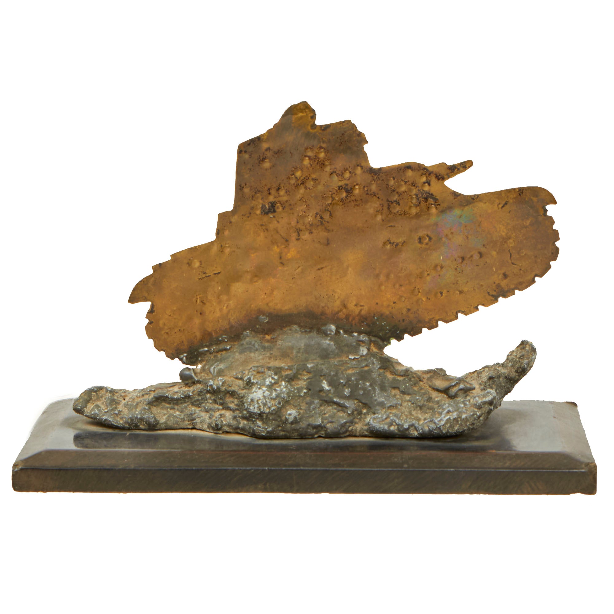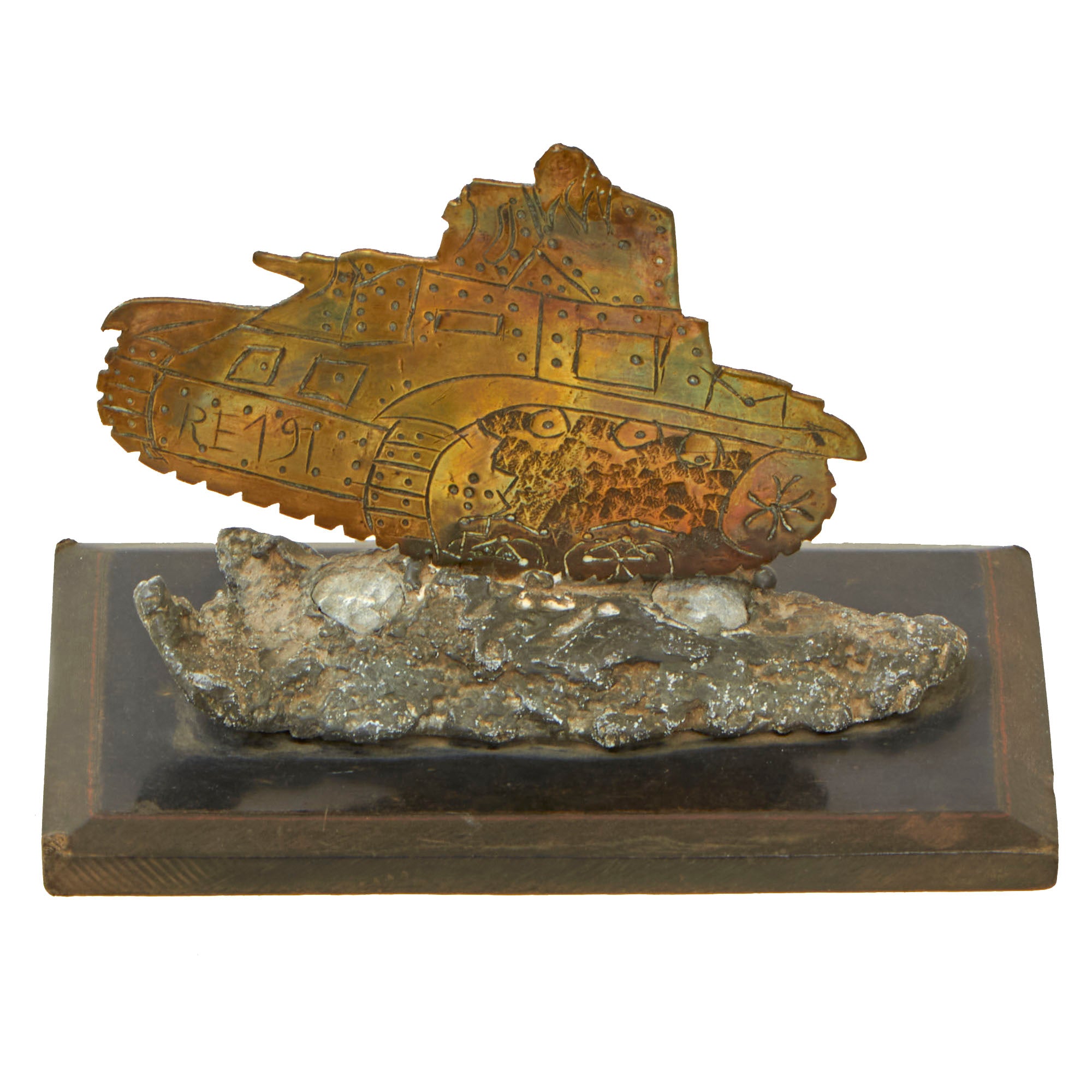 Original Item: Only One Available. This is a fantastic desk top silhouette model of the French Char B1 Tank. It is constructed out of a sheet of Brass, likely a flattened piece of artillery casing, and mounted on lump of shrapnel over a wood base. The front of the tank reads RE 197.
