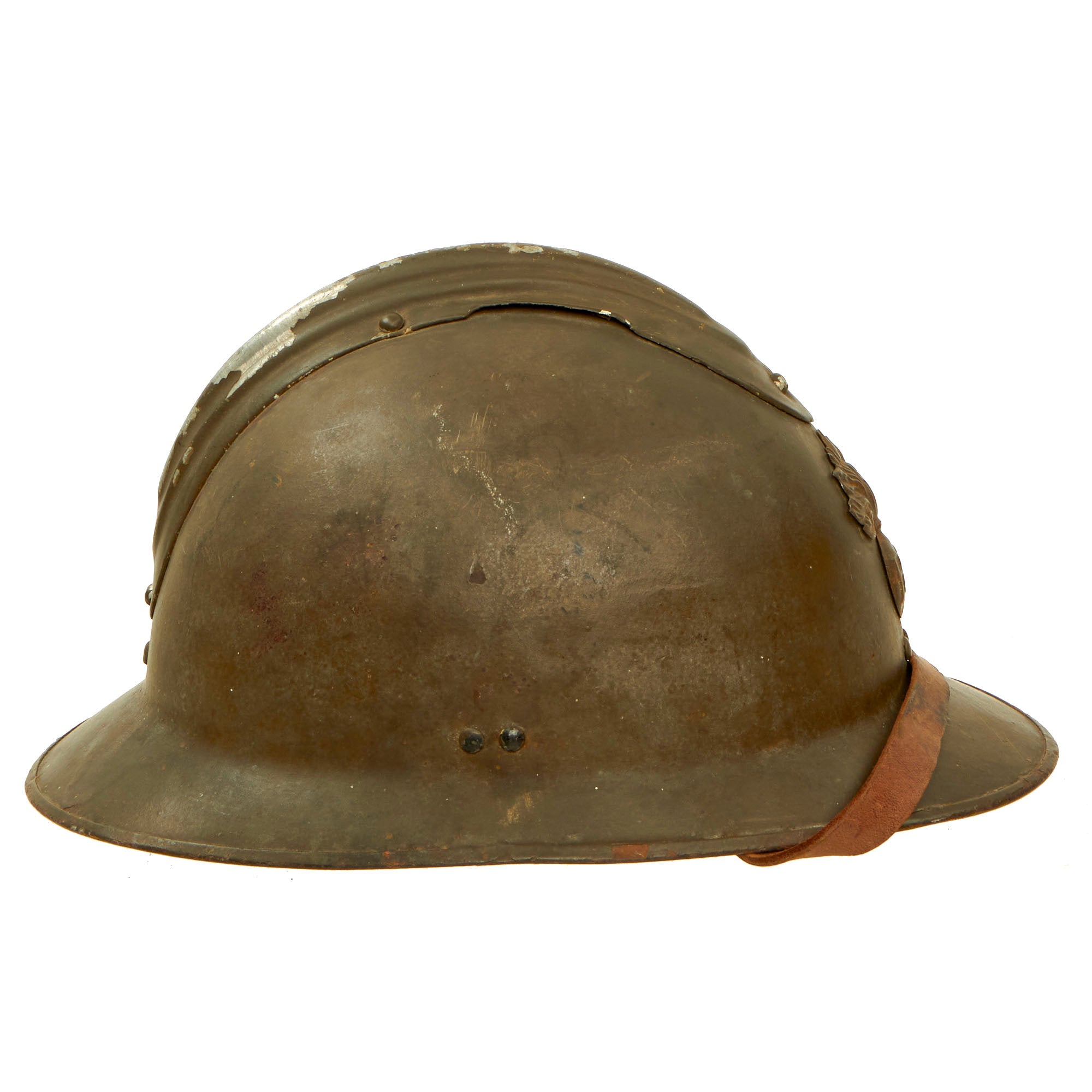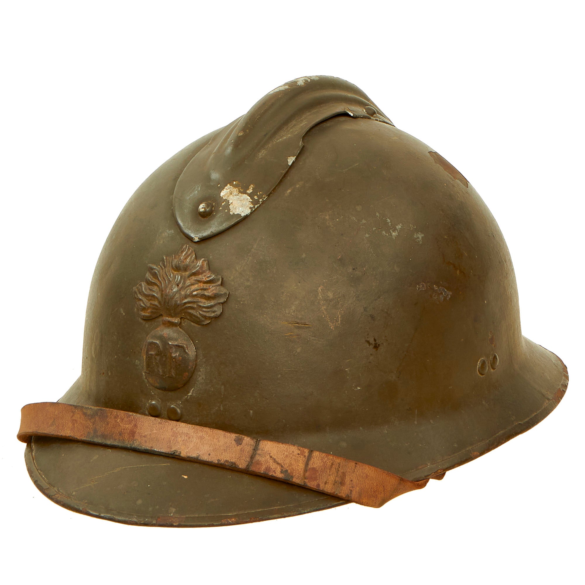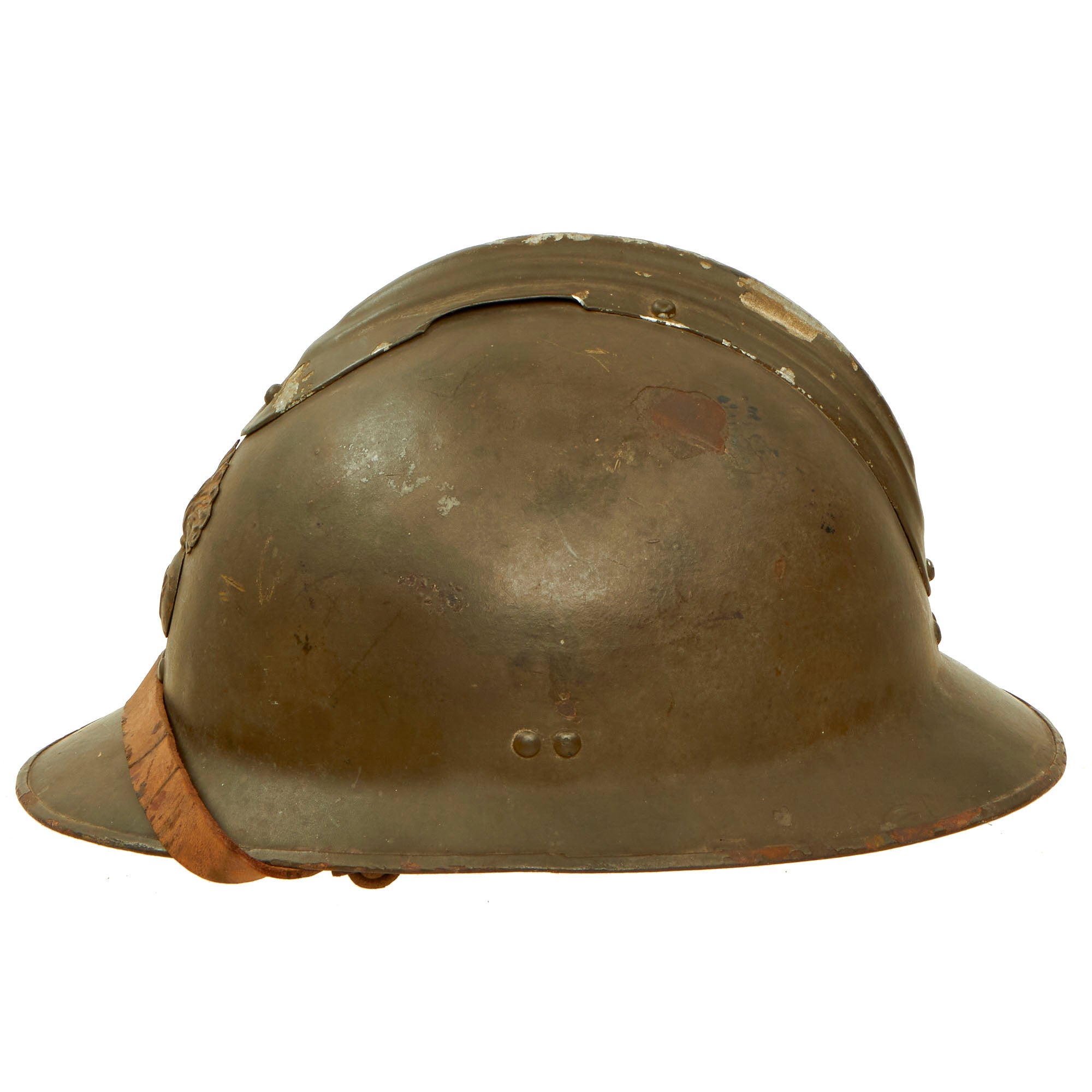 Original Item: Only One Available. This is a very good condition genuine World War II M1926 French Army Infantry "Adrian" helmet. The helmet retains the original olive green paint and has the original RF (République Française) "Flaming Bomb" marked Infantry badge attached to the front, which is of the WWI variation. There are definitely some dents in the top of the shell, and the helmet has a period repaint over this damage, after which it has had additional wear and oxidation to the shell, especially around the rim.