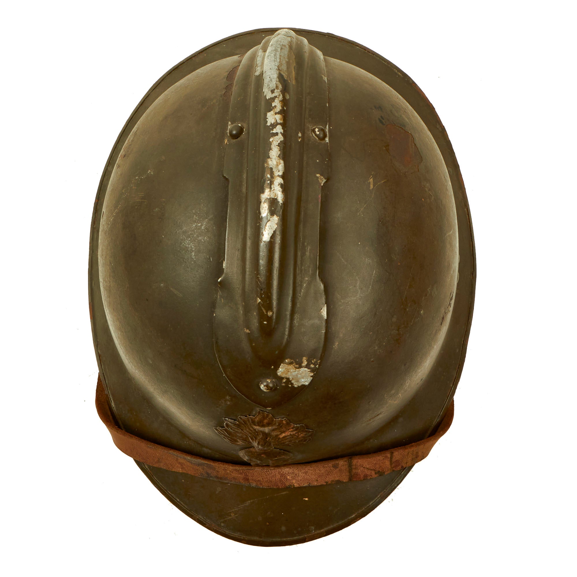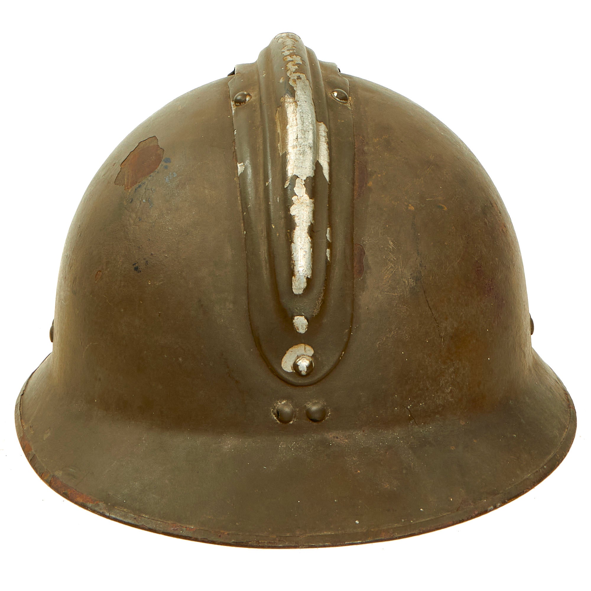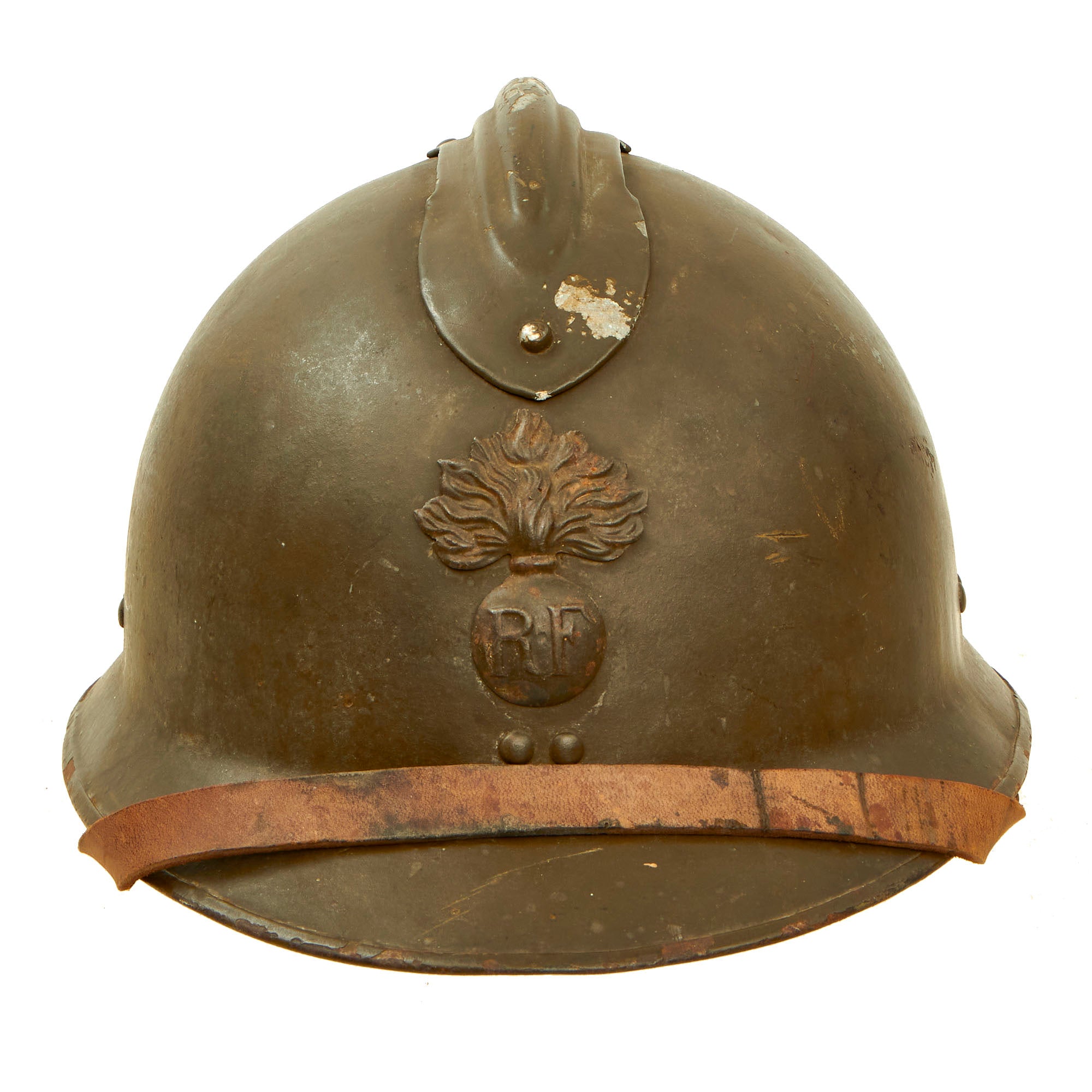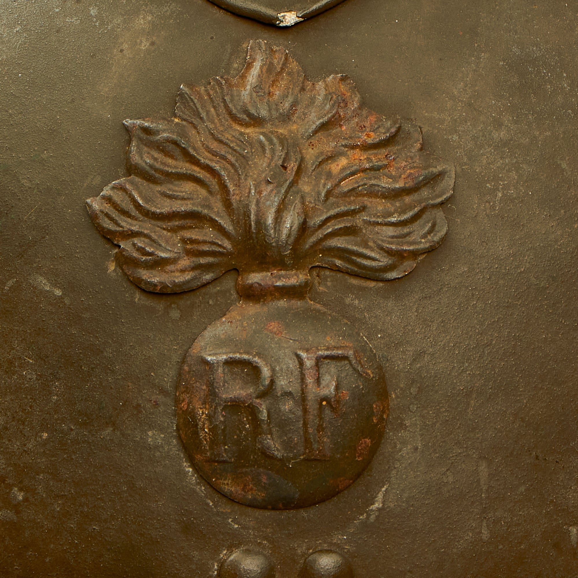 Original Item: Only One Available. This is a very good condition genuine World War II M1926 French Army Infantry "Adrian" helmet. The helmet retains the original olive green paint and has the original RF (République Française) "Flaming Bomb" marked Infantry badge attached to the front, which is of the WWI variation. There are definitely some dents in the top of the shell, and the helmet has a period repaint over this damage, after which it has had additional wear and oxidation to the shell, especially around the rim.