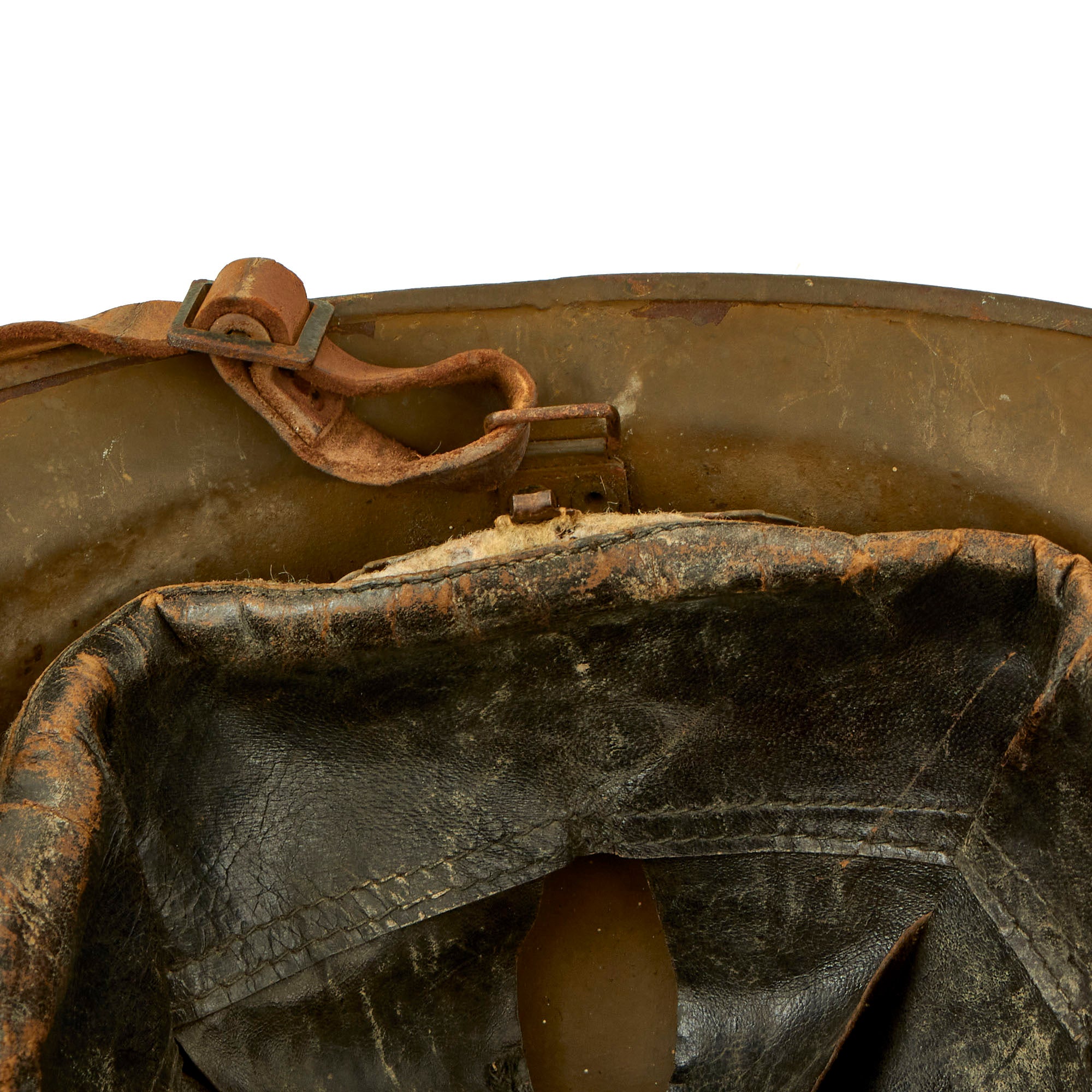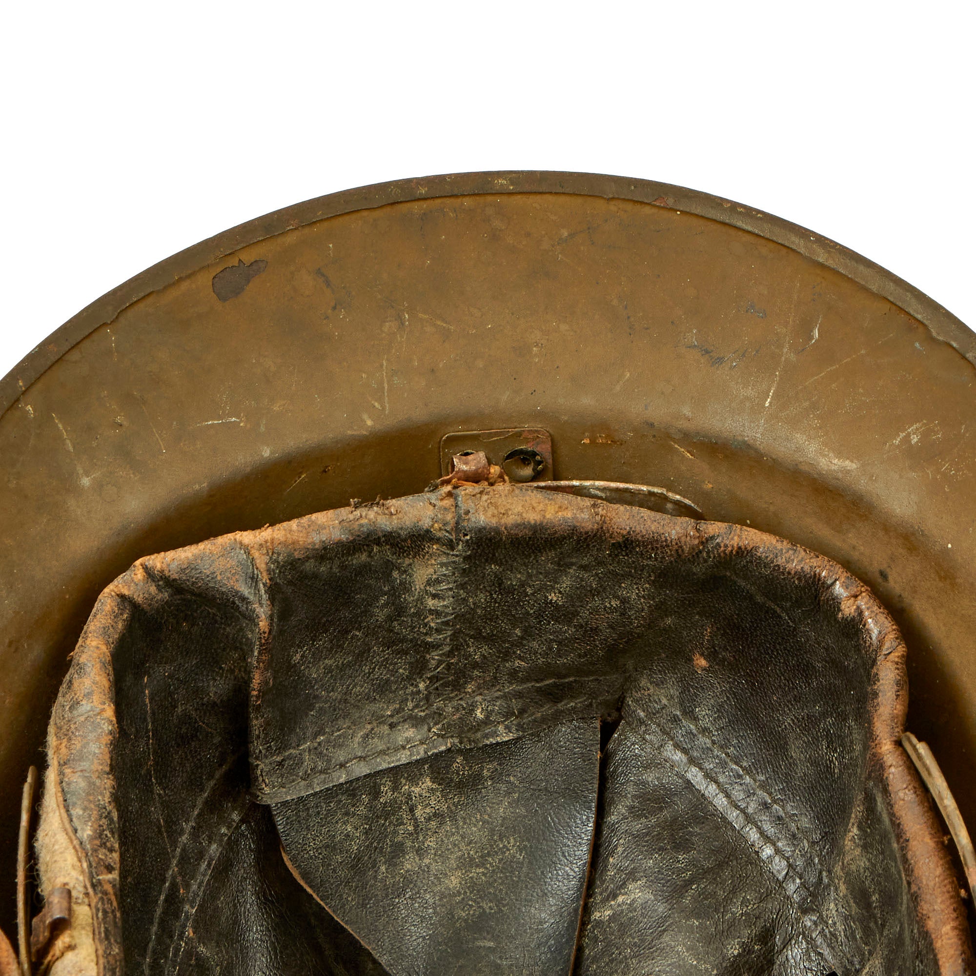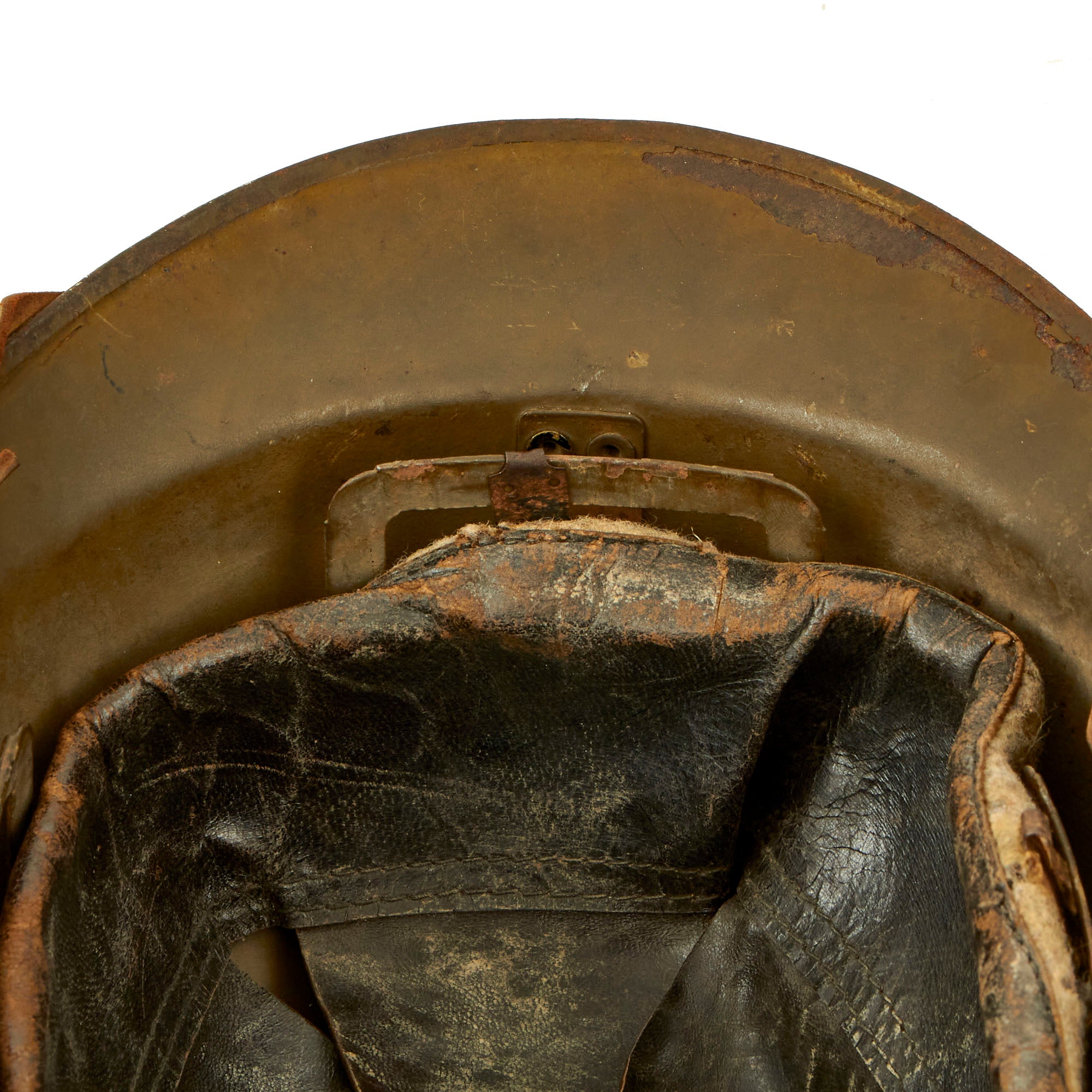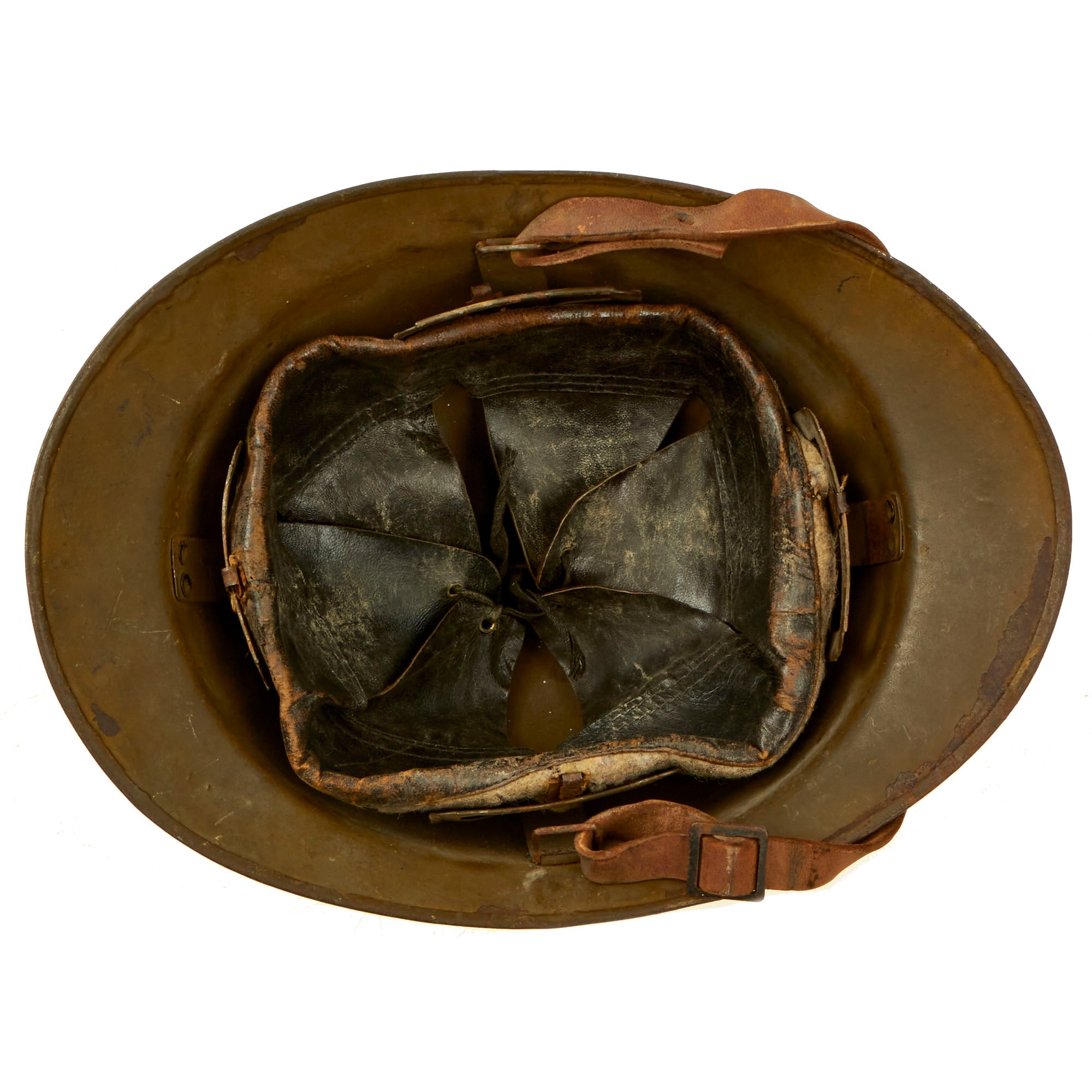 This is an early model 1926 that was arsenal refinished, quite hastily as you can see paint spray on the chinstrap. This helmet was more than likely refinished, refitted and then reissued to the Free French Army forces in the liberated areas of France.