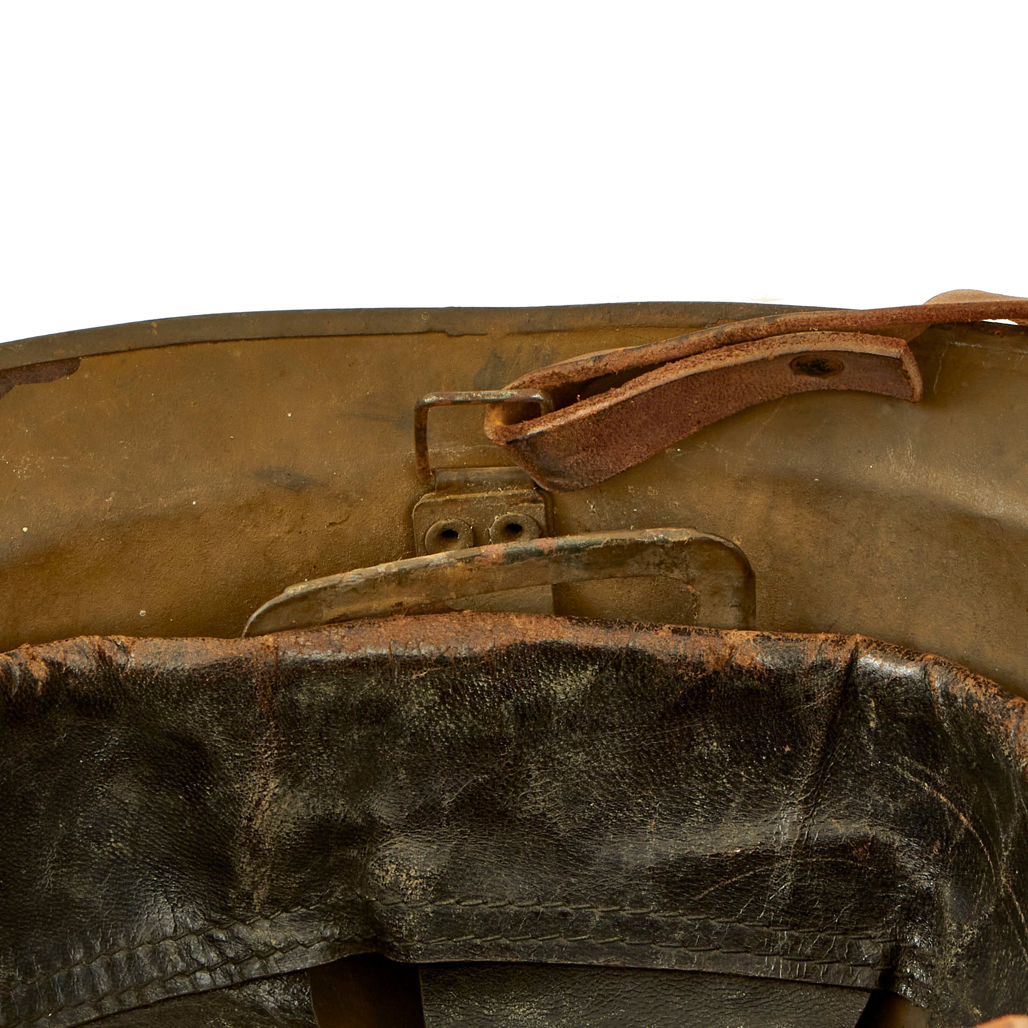 Size is approximately US 7 (56cm). Features an original oil cloth liner in very good condition, though some of the attachment stitches are a bit loose. The chin strap is also present, and in very good condition.