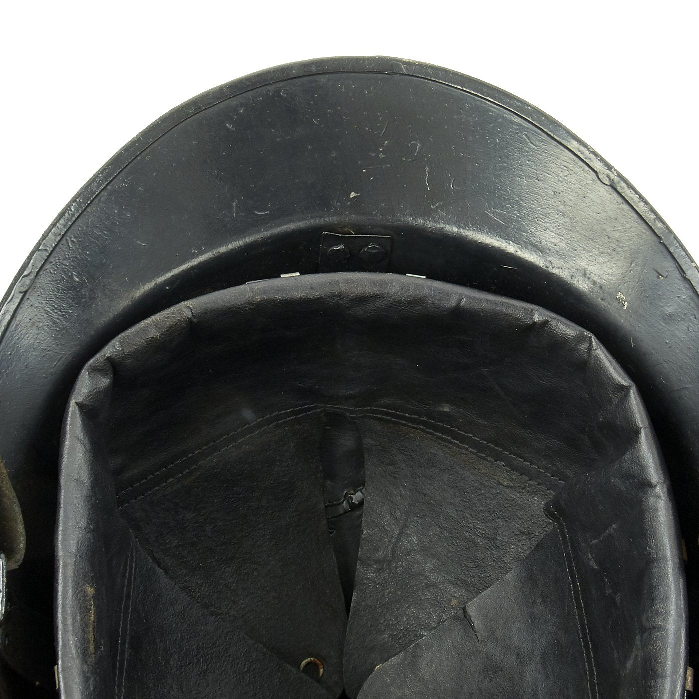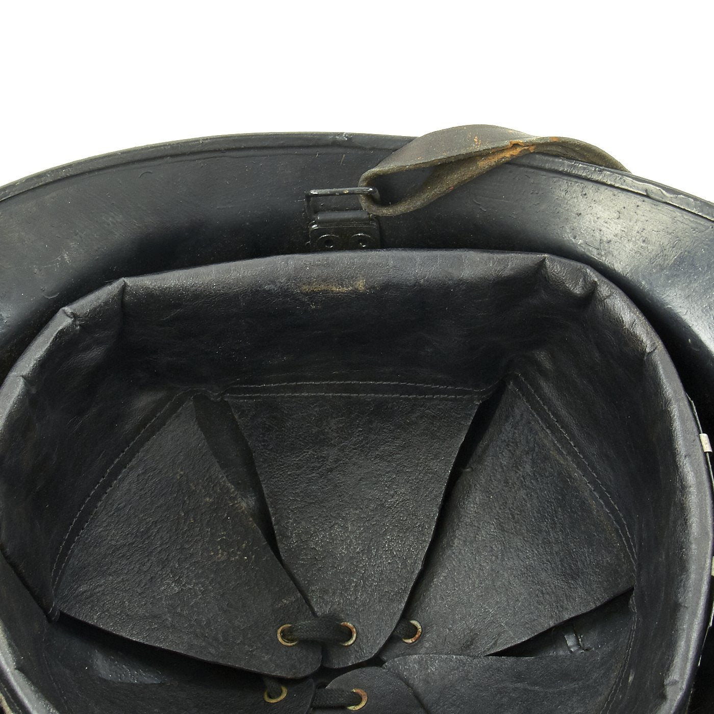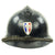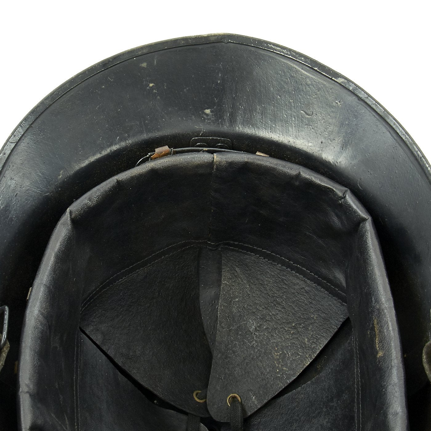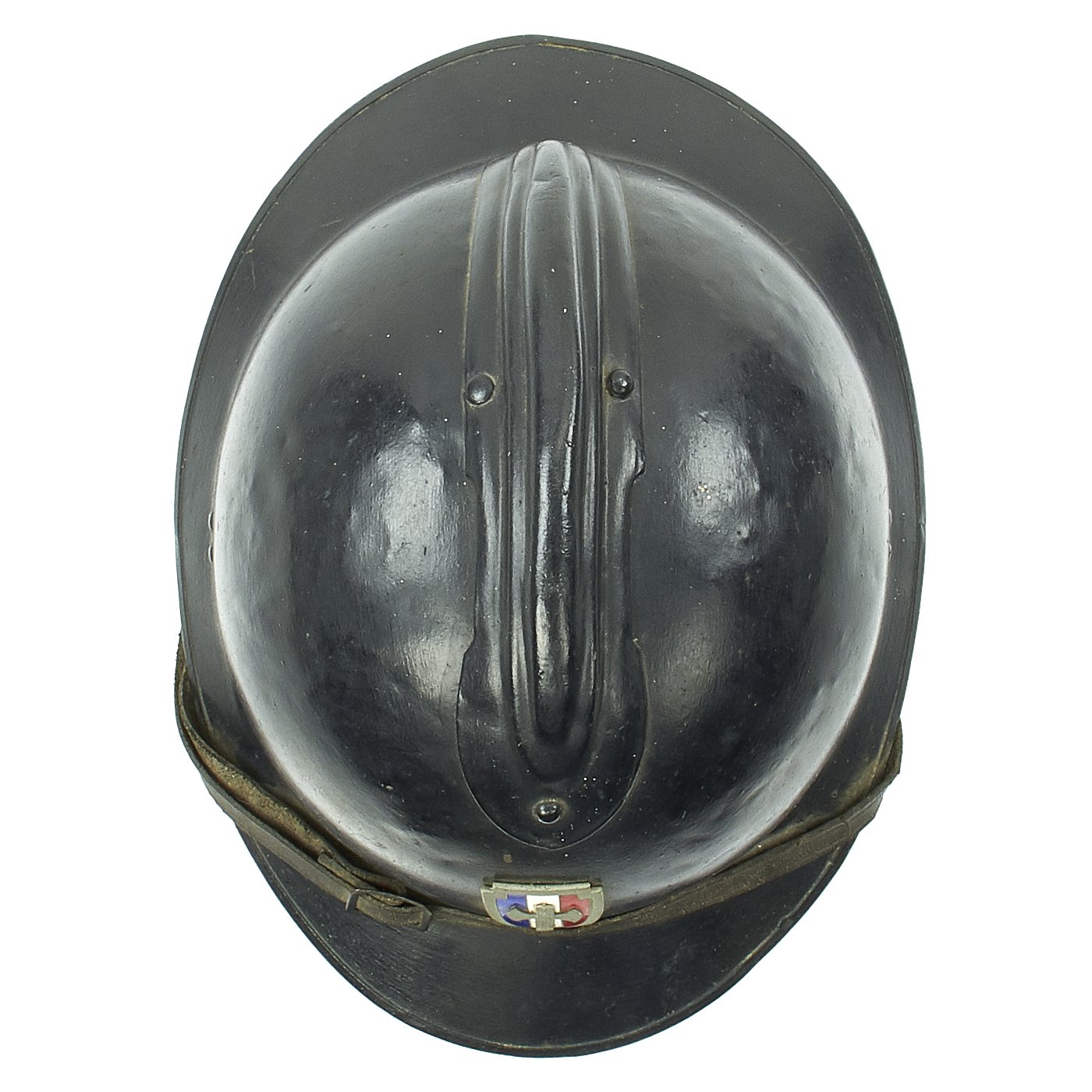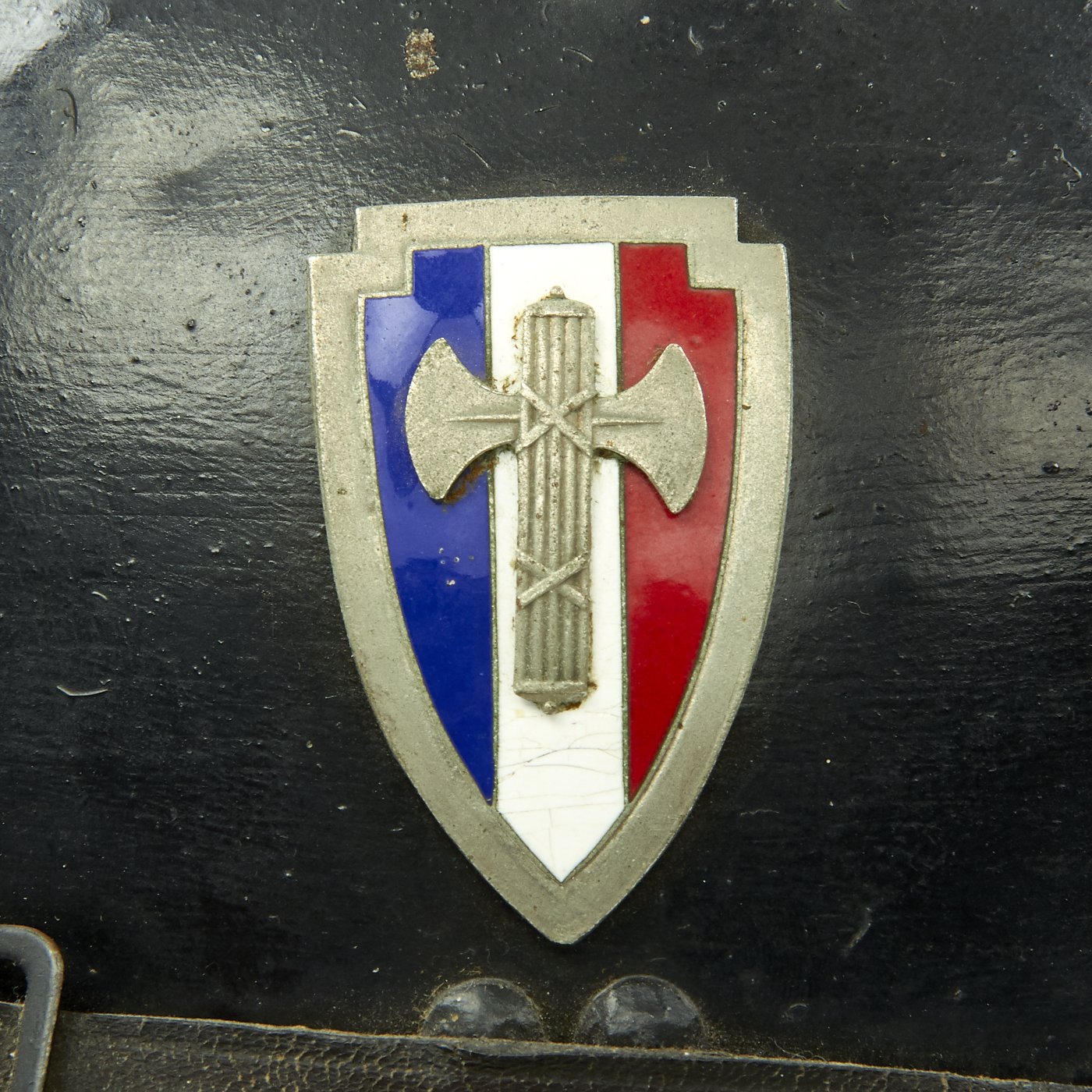 This helmet was converted from the original configuration to instead be a helmet for Vichy France, which involved painting the helmet black, and installing a new tri-color French shield, with a double bladed Fasces in the middle, the symbol of the Italian Fascist party. This replaced the original "RF" logo of the French Republic.