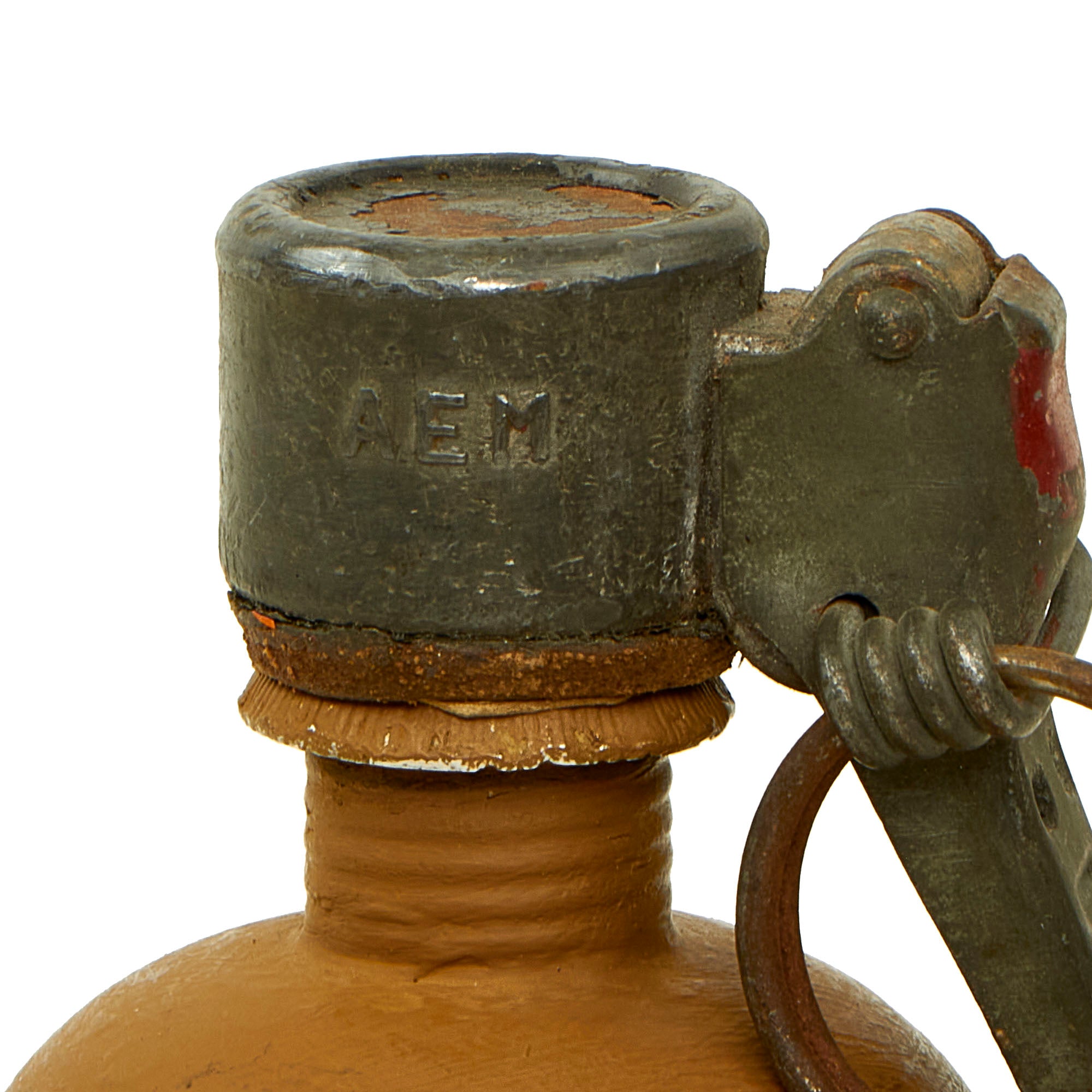 This is a tan painted “Little Brown Jug” version of the OF37, which originally would have been filled with 90g of pulverized Tolite.. It has a correct Mle.35 fuze, marked on the side with AEM and on the lever with AFM / 65 / 39. The body itself is not marked. The grenade designation would usually be on the top half of the grenade, but on this example it has been painted all brown.