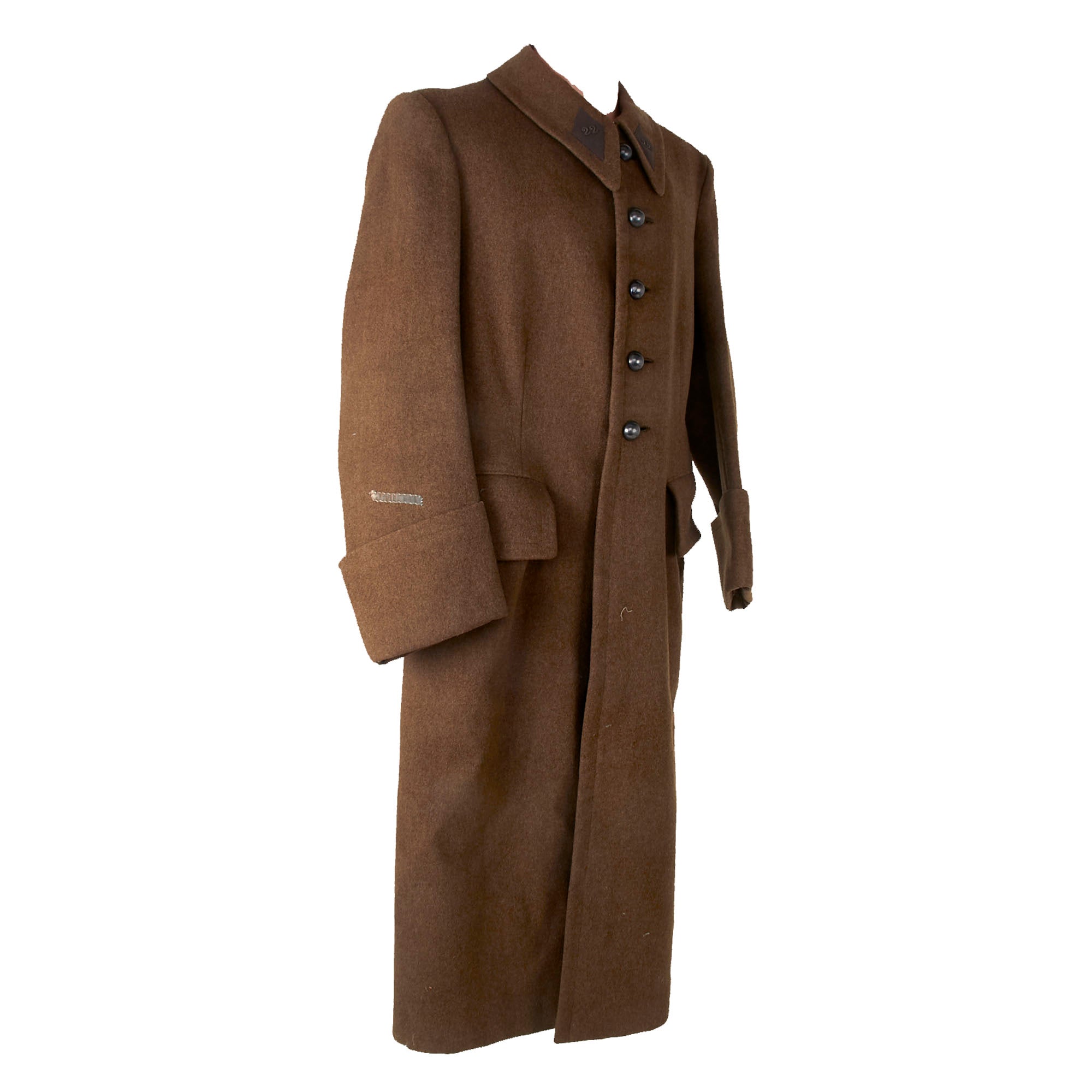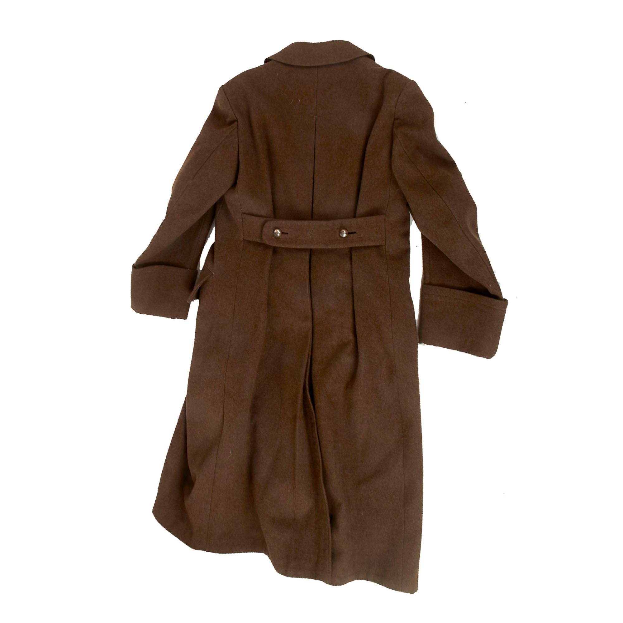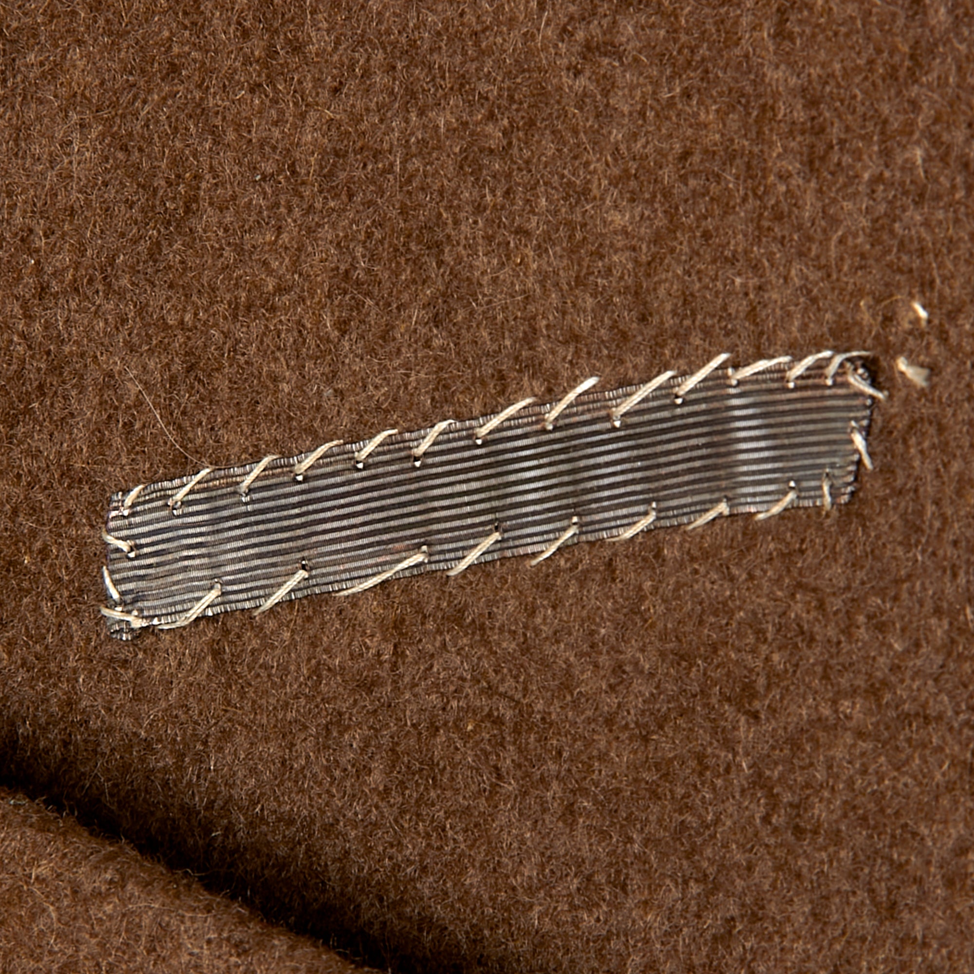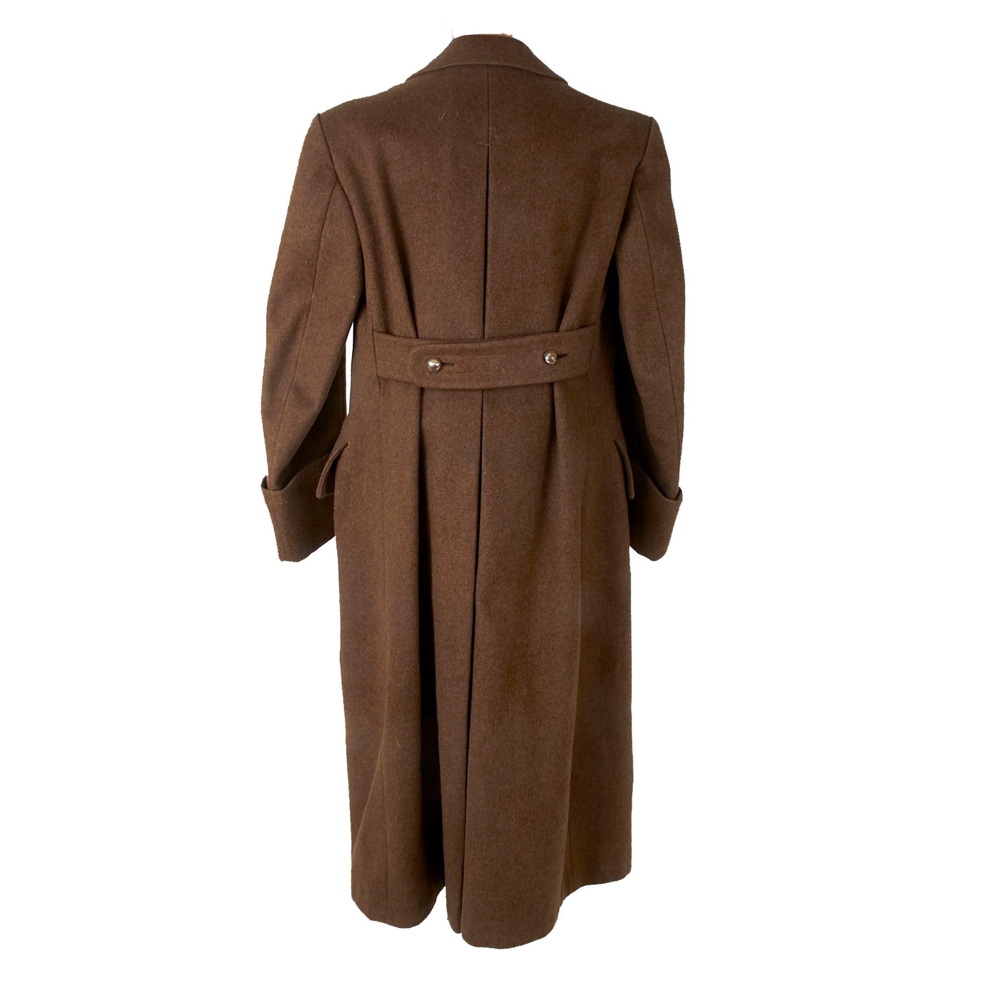 The greatcoat is enormous and still bears the six plain brass buttons at the front. The original tightening strap on the back is present, as are the buttons. There are no markings on the interior that we could find. There is some light moth tracking on the interior, but nothing terribly serious.