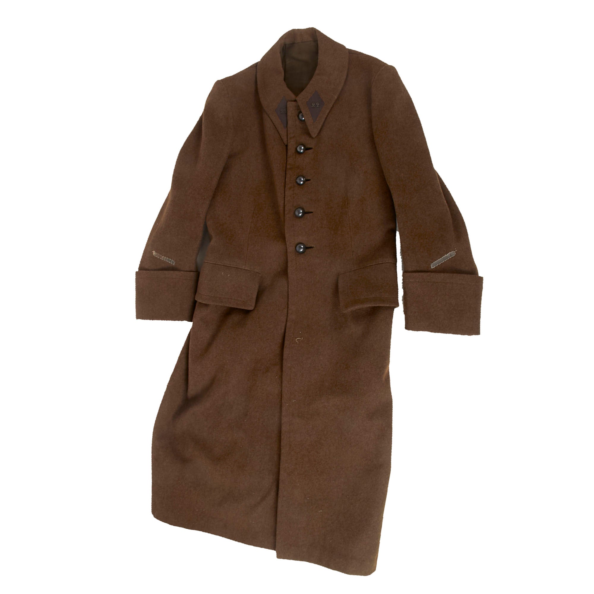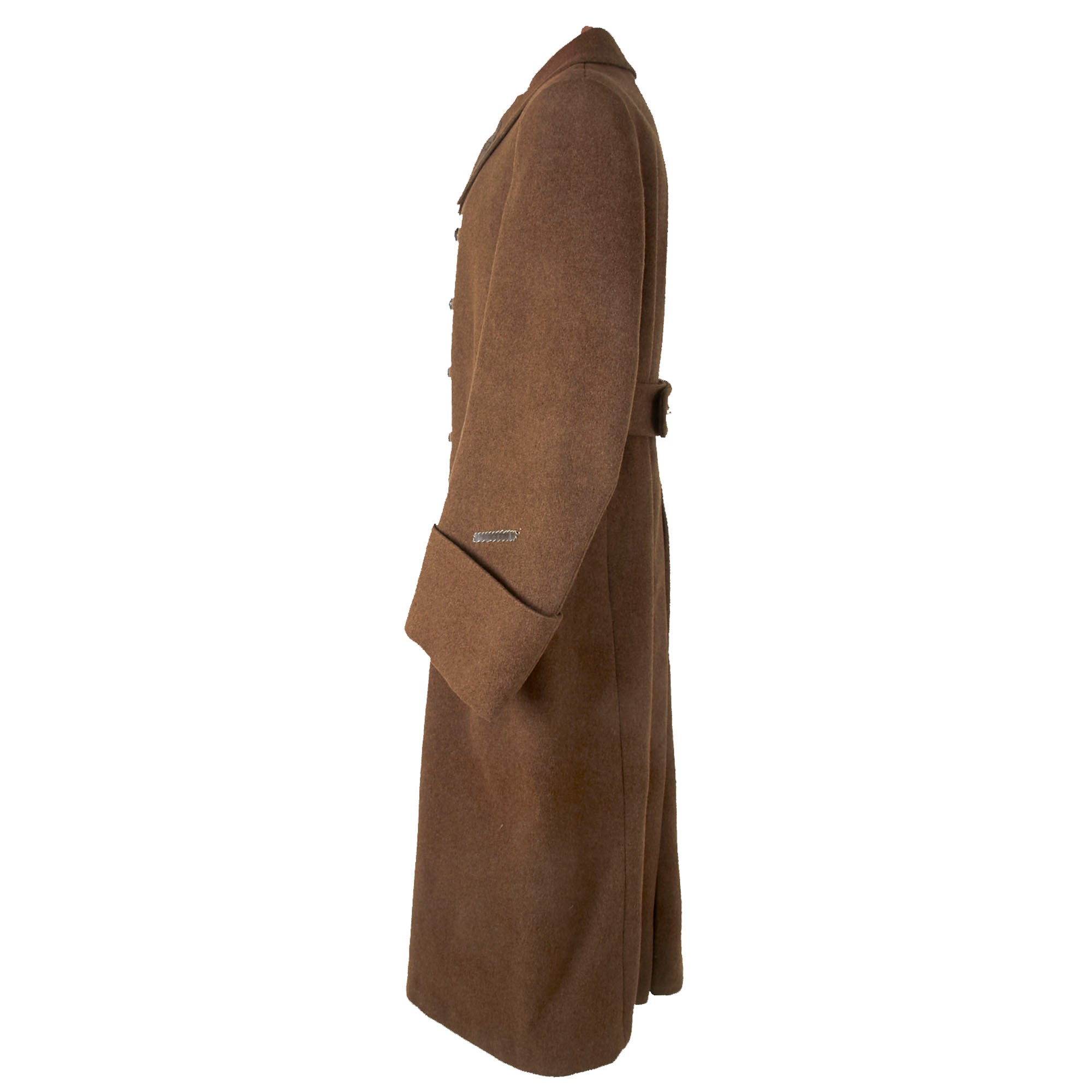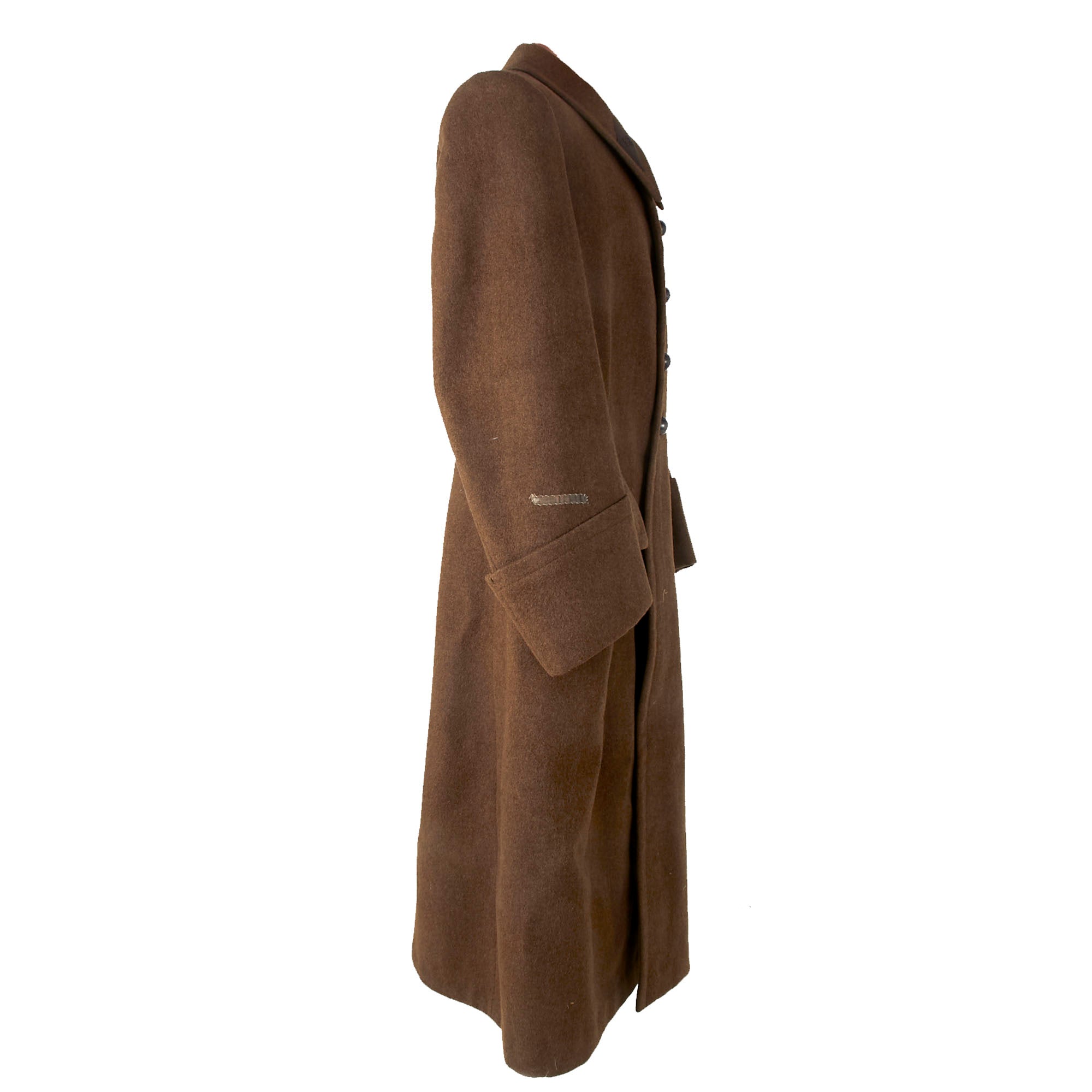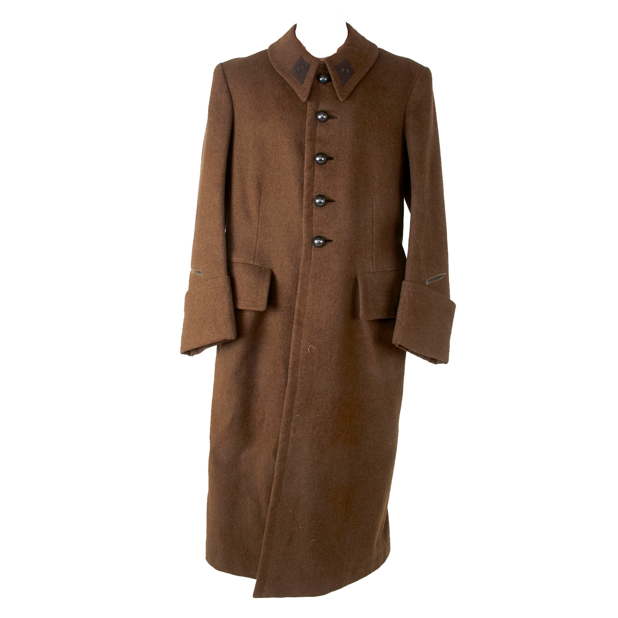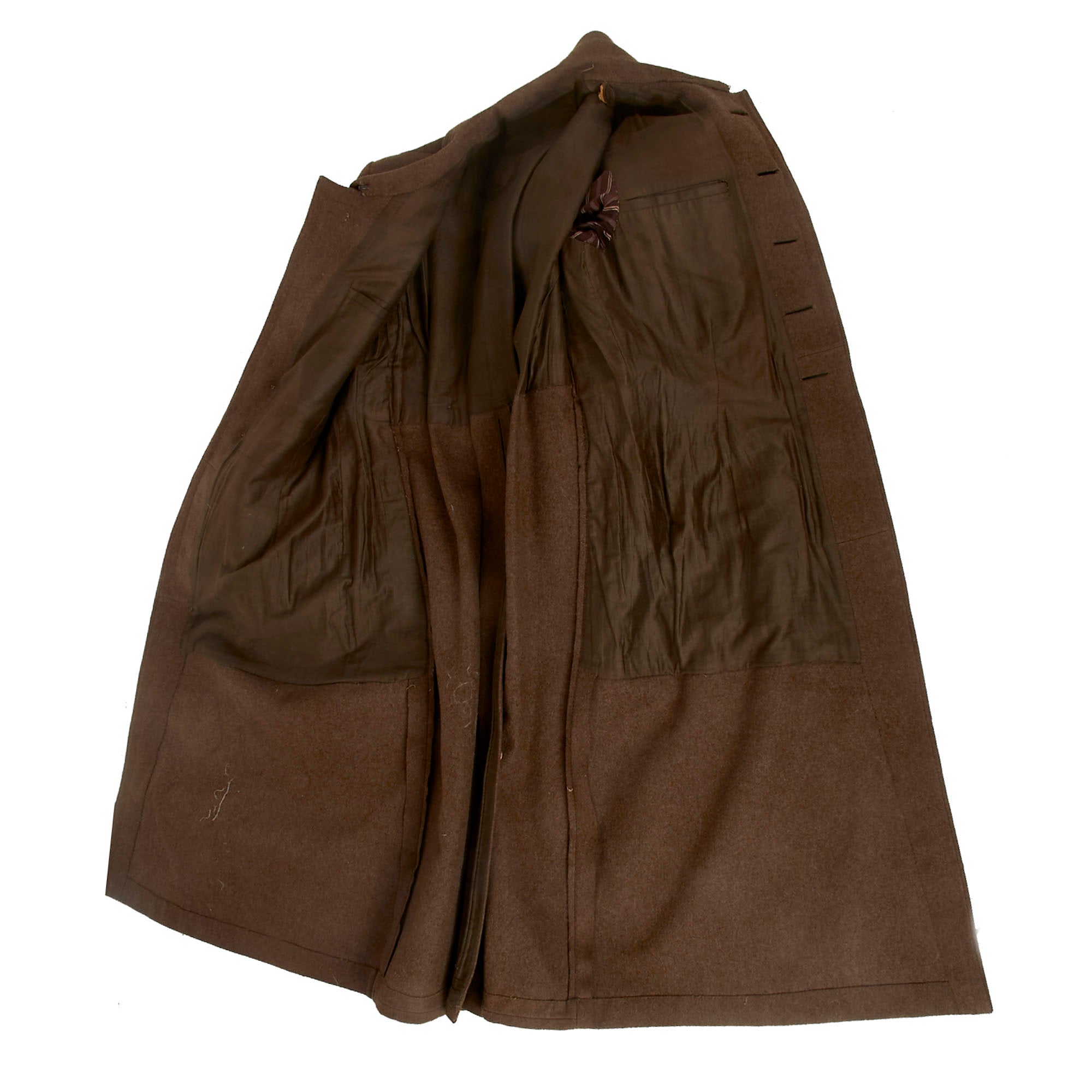 The greatcoat is enormous and still bears the six plain brass buttons at the front. The original tightening strap on the back is present, as are the buttons. There are no markings on the interior that we could find. There is some light moth tracking on the interior, but nothing terribly serious.