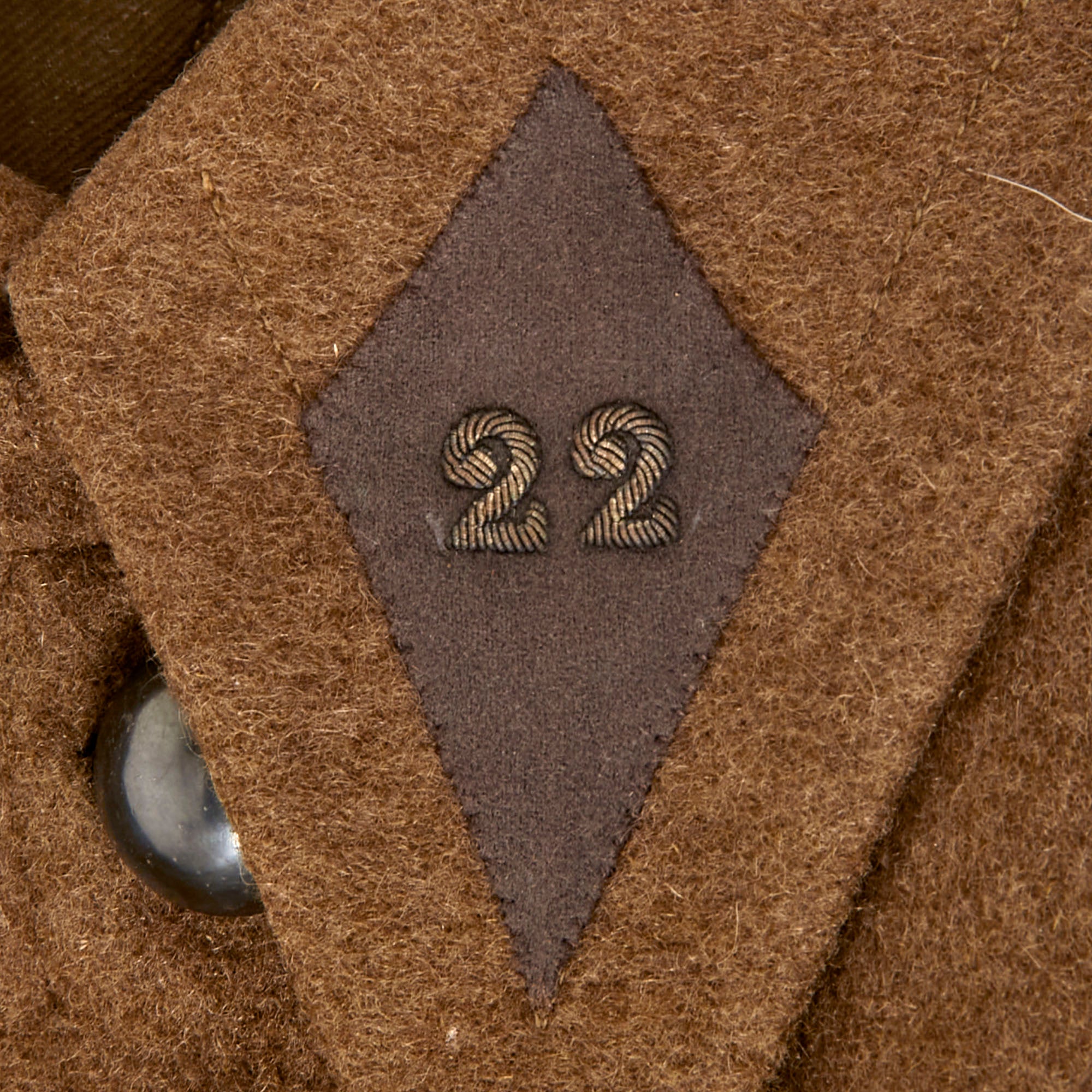 Original Item. Only One Available. This is a tremendous example of a scarce French officer’s greatcoat from World War II. This example has cuff ranks for a 2nd Lieutenant, and collar tabs denoting the 22nd Regiment.