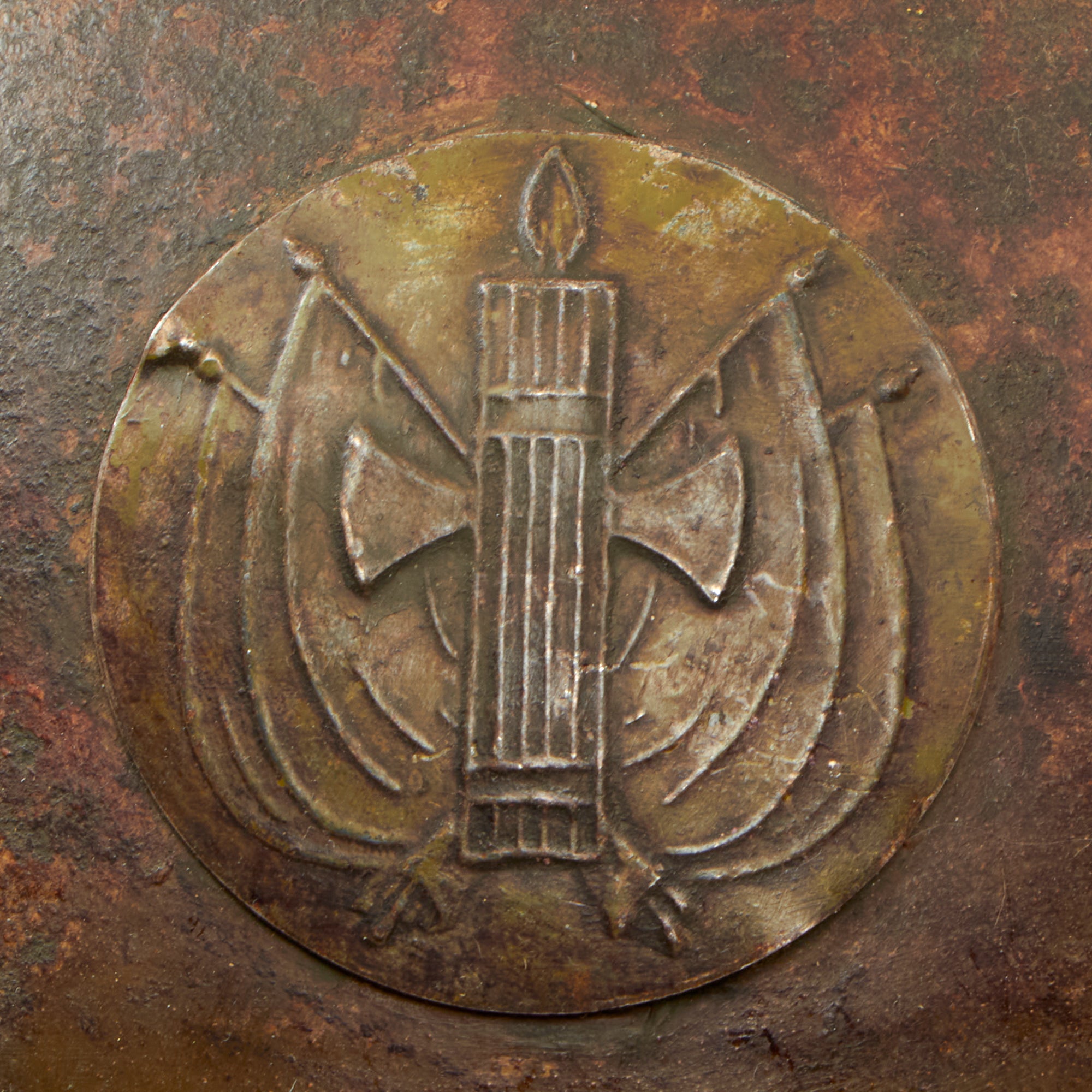 The helmet is in rough condition overall with about 50% of its original olive green paint remaining, There is a very rare badge for the government of Vichy which features the fascist fasces insignia, a bundle of wooden rods and an axe bound together by leather thongs. Fasces represented that a man held imperium, or executive authority. The fasces is in front of several flags, representing Fascist ideology reigning supreme over all others.