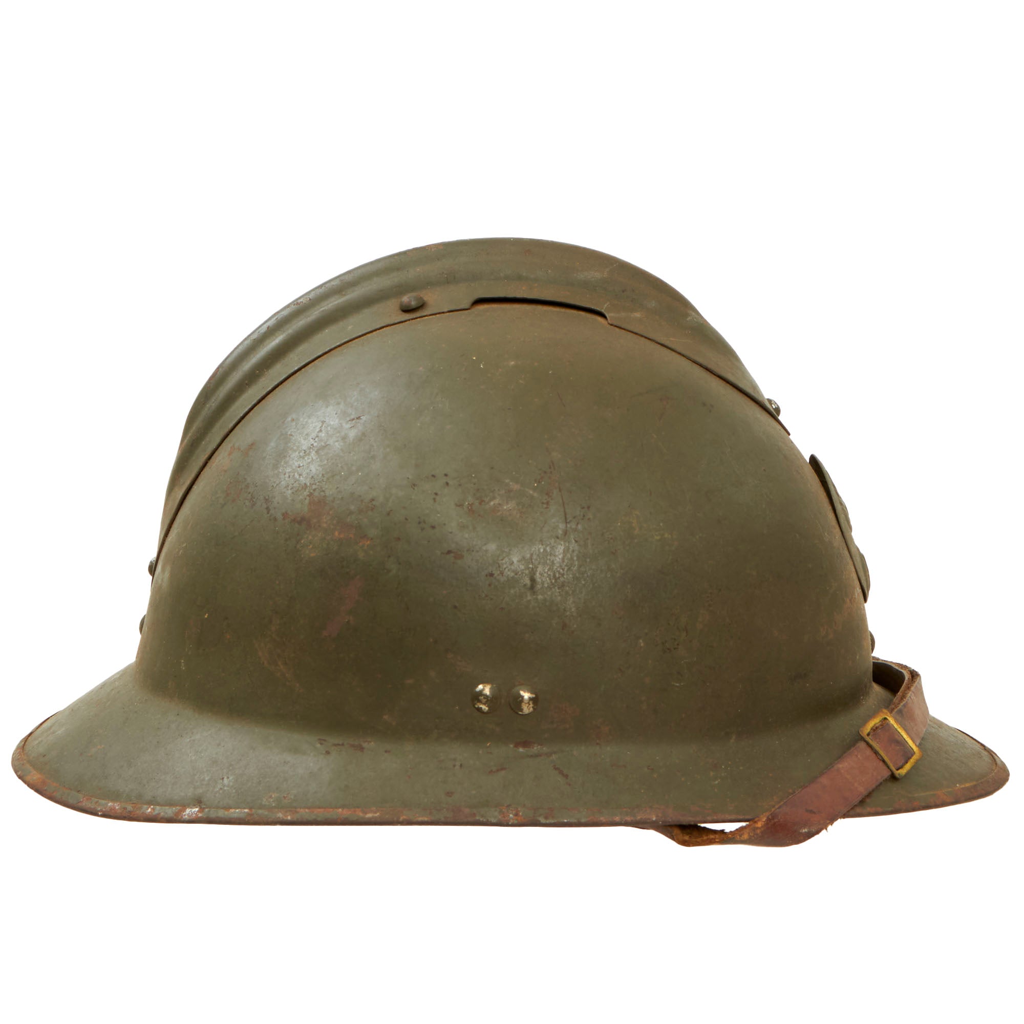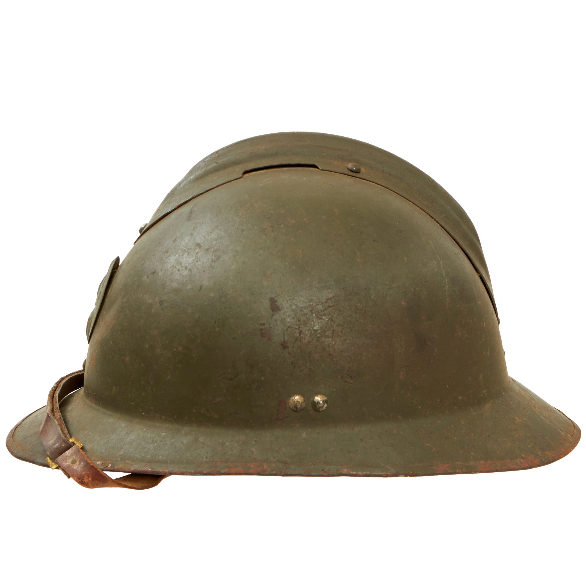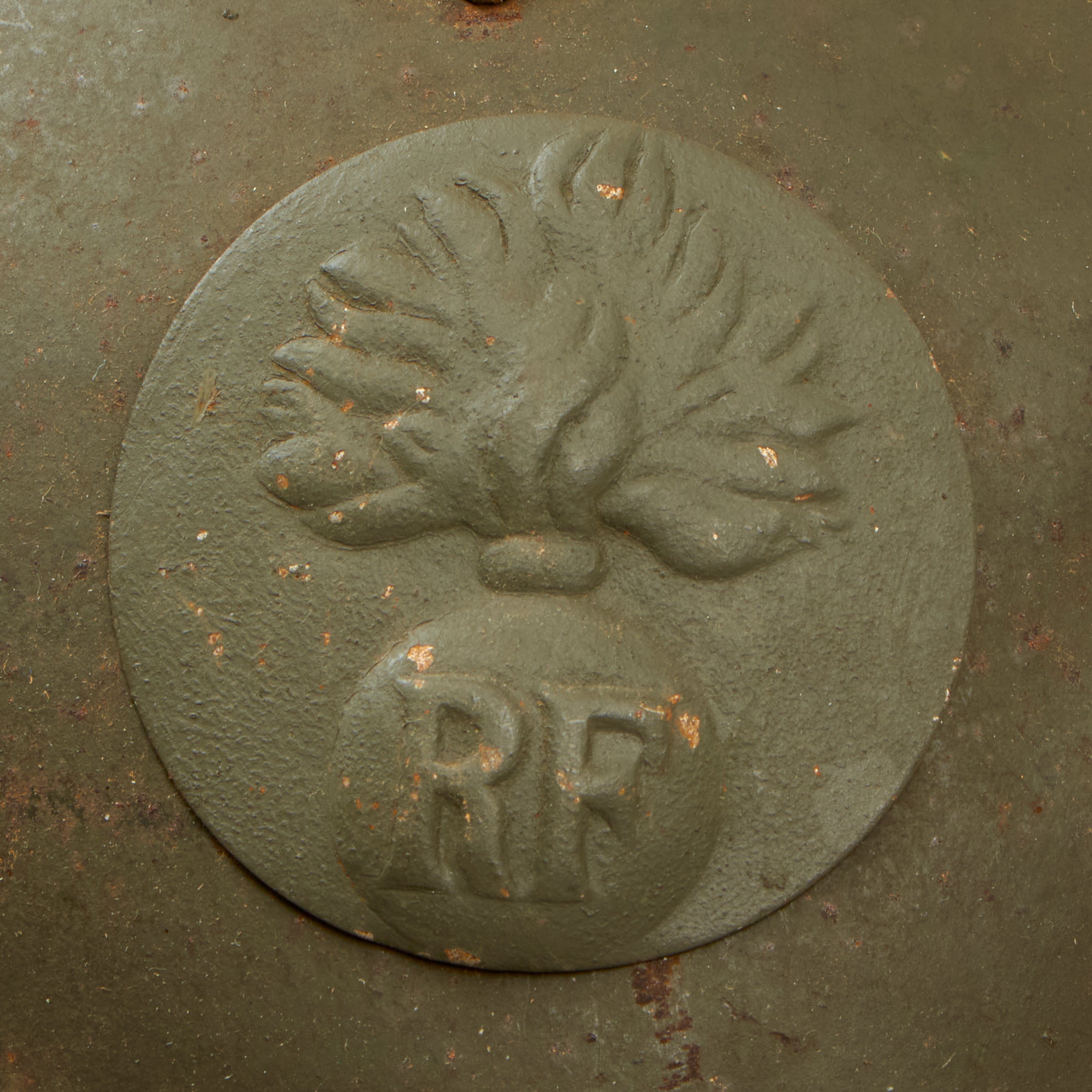 Original Item: Only One Available. This is a very nice condition genuine World War II M1926 French Army Infantry "Adrian" helmet. The helmet retains the original olive green paint and has an original WWI era RF (République Française) "Flaming Bomb" marked Infantry badge attached to the front. The helmet shell does look to have seen some past oxidation that was cleaned away, and probably was repainted at some point during the war.
