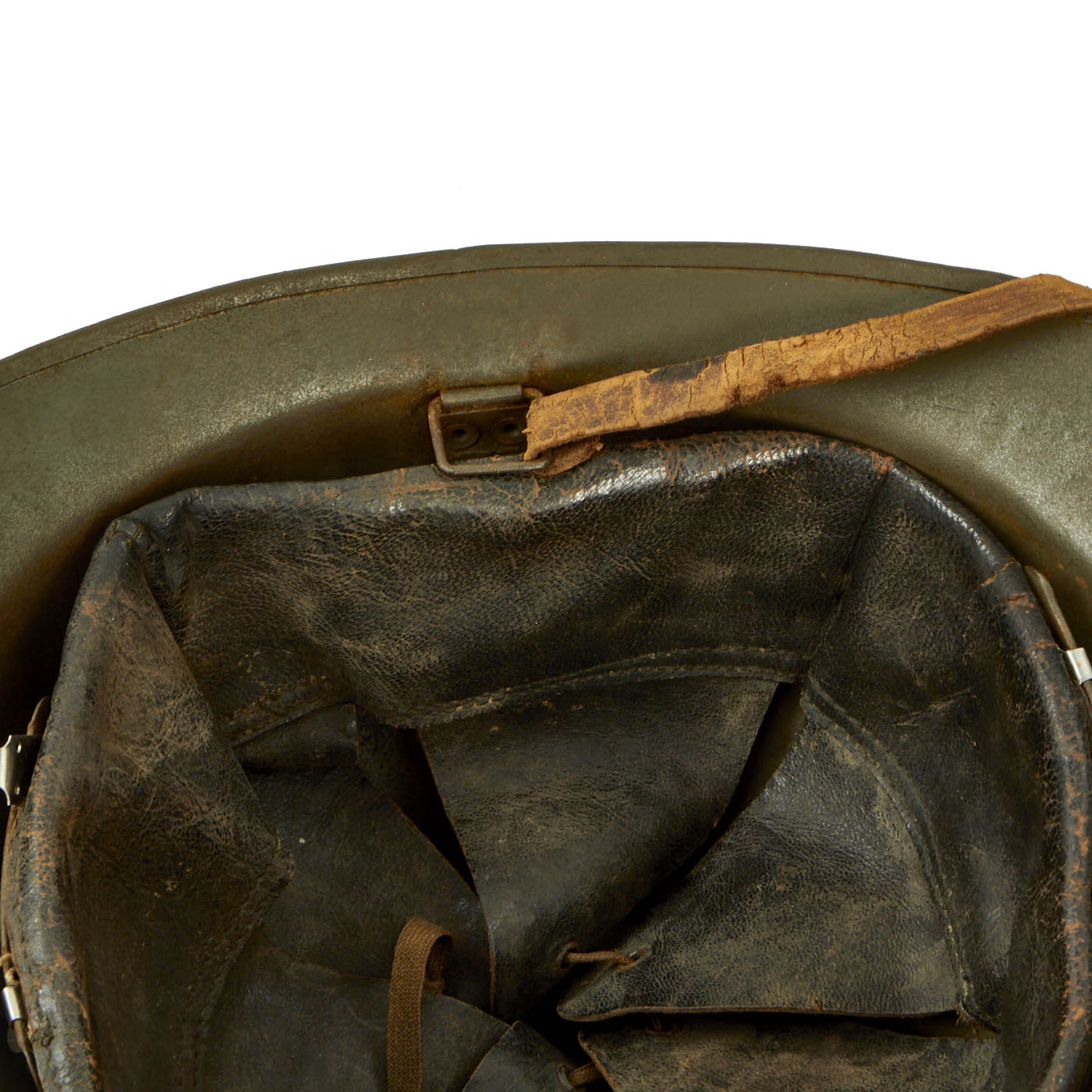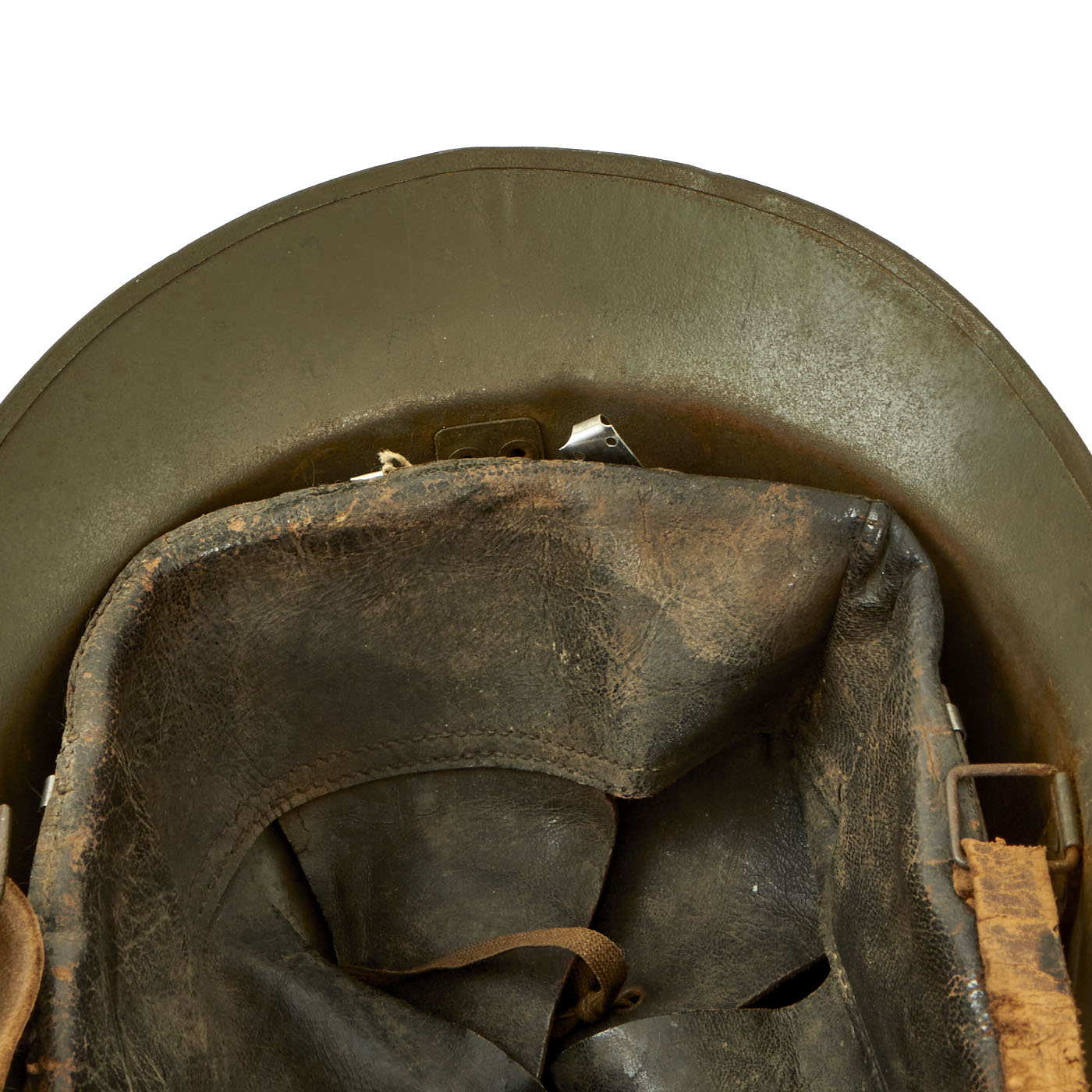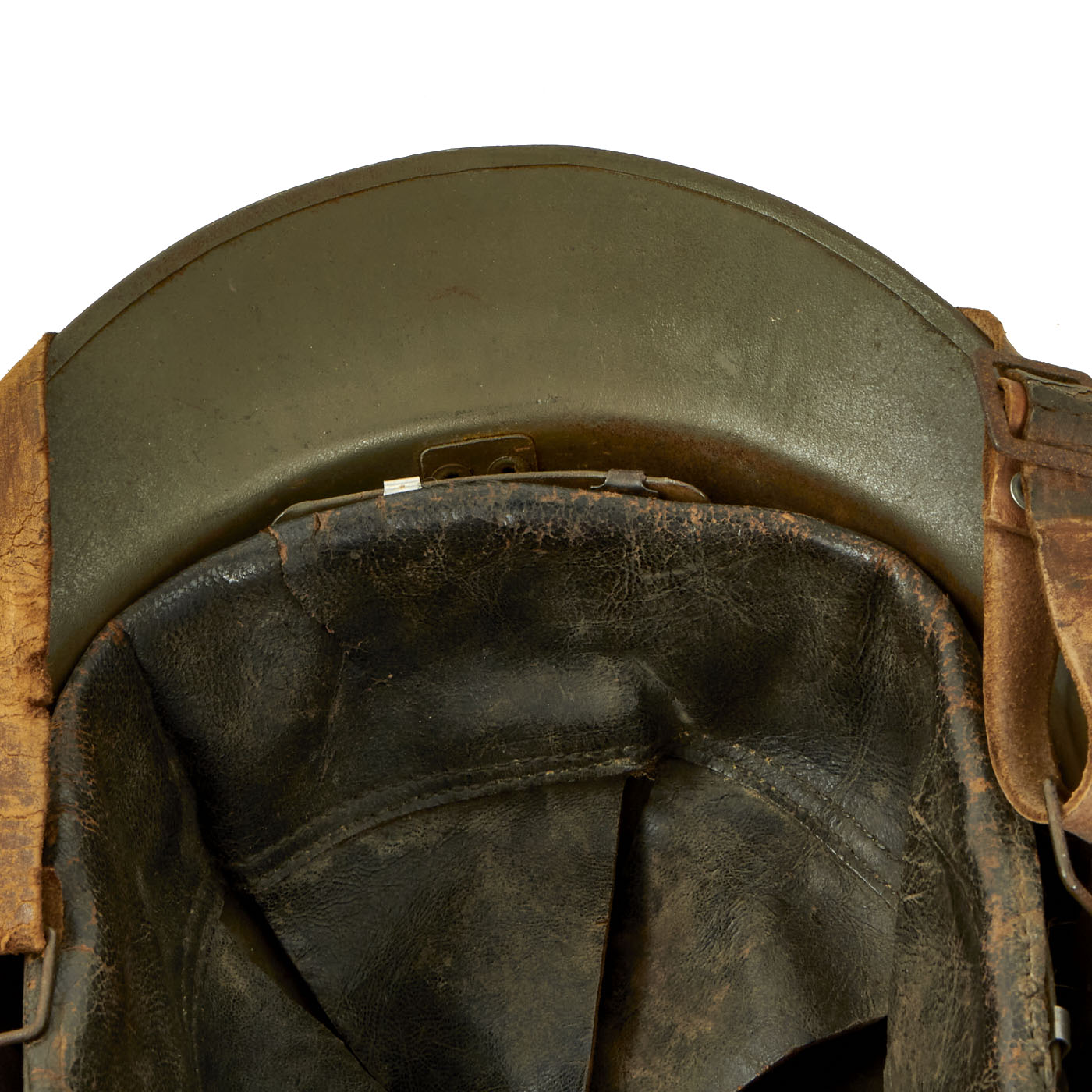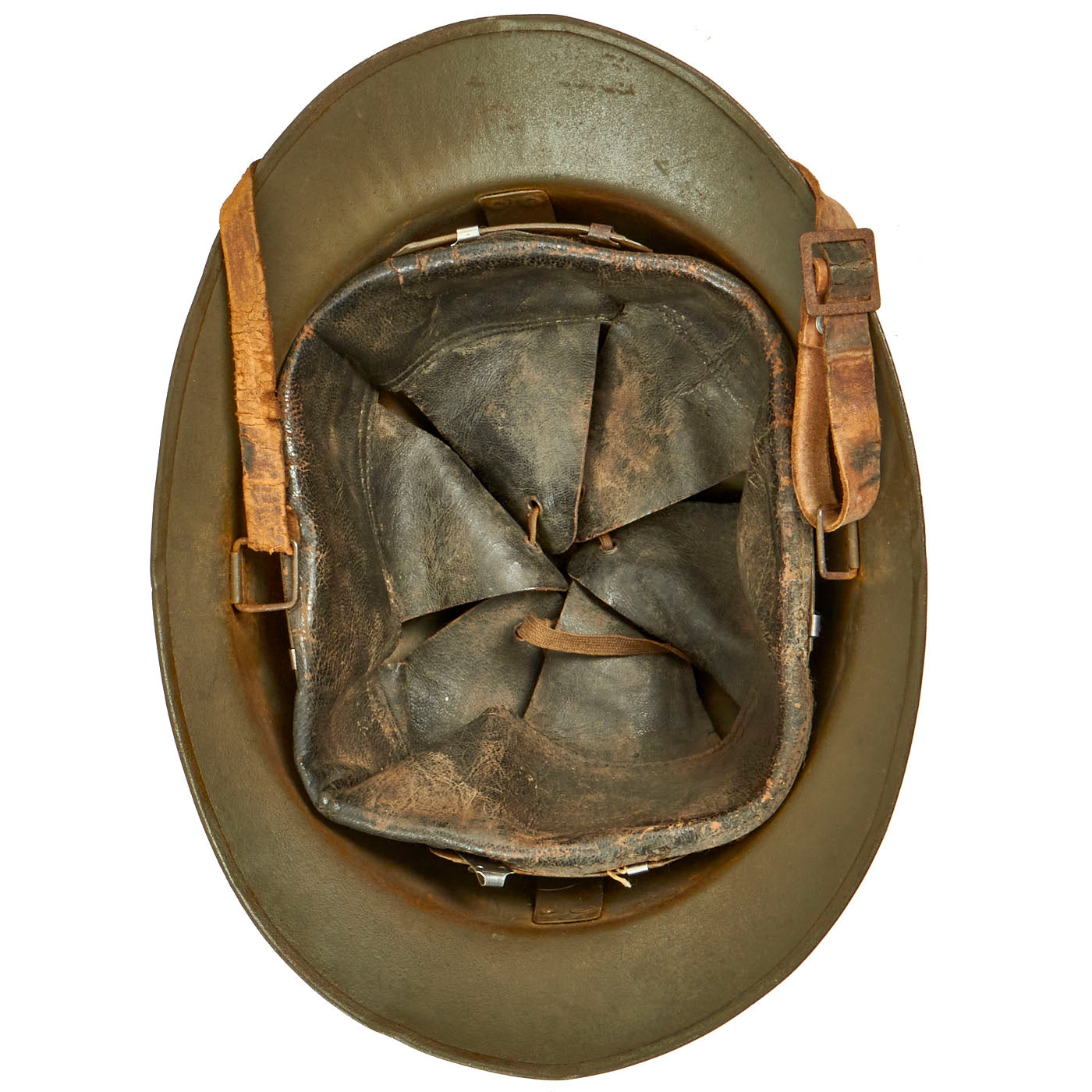 Size is approximately US 7.25 (58cm). Features a wonderful complete original leather liner in excellent condition, complete with its original drawstring. The chinstrap is present, and mostly intact with a portion being broken off. The chinstrap still retains its original brown finish, however the leather is slightly dry from age. The overall condition of the helmet is excellent. These helmets are getting more and more hard to find on the market.