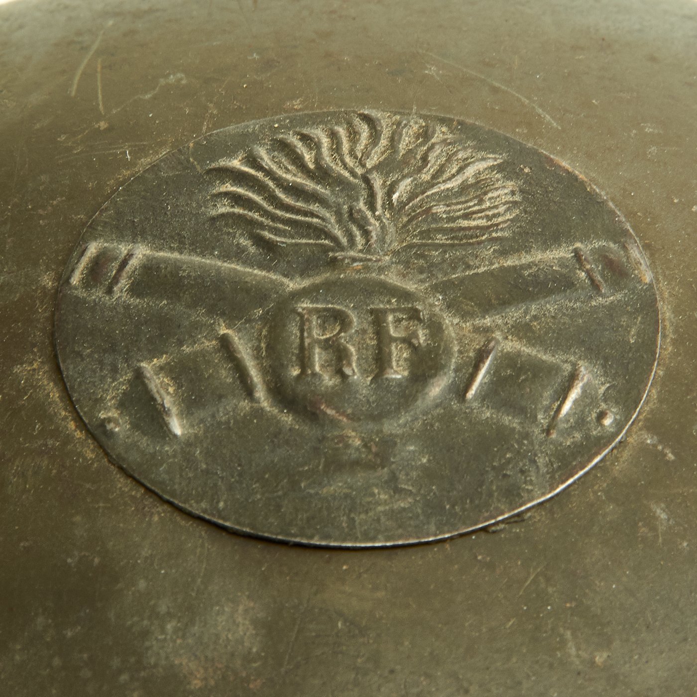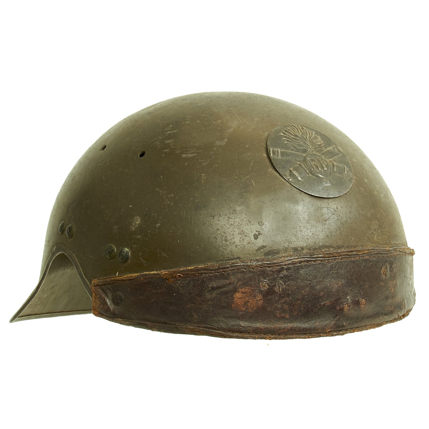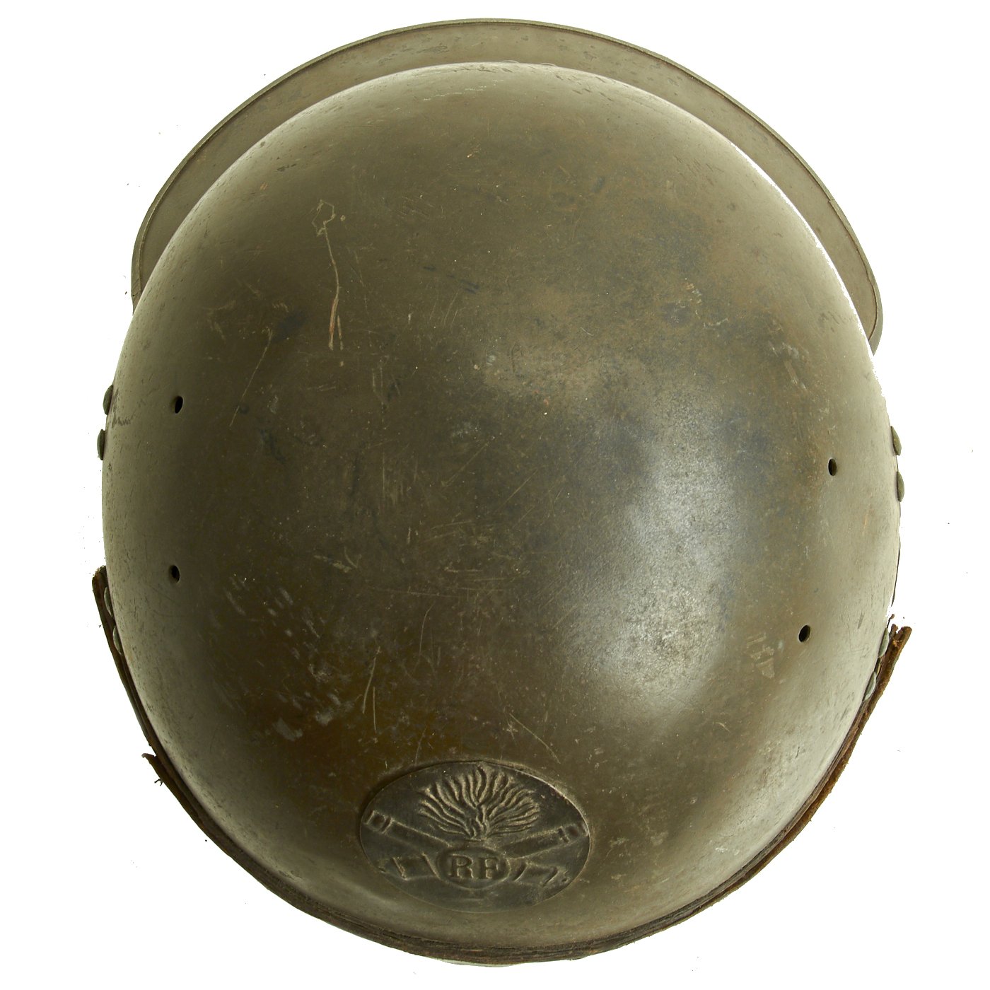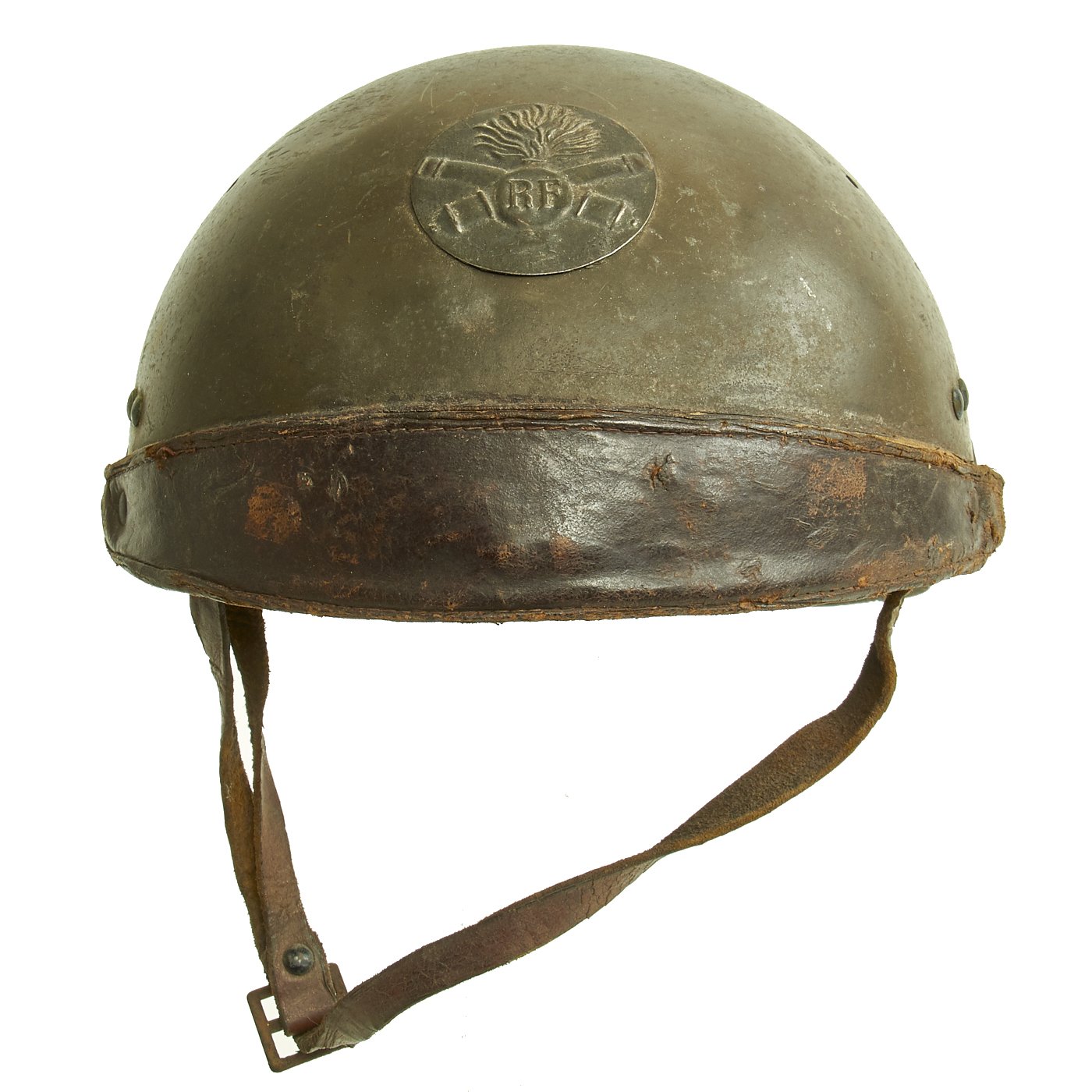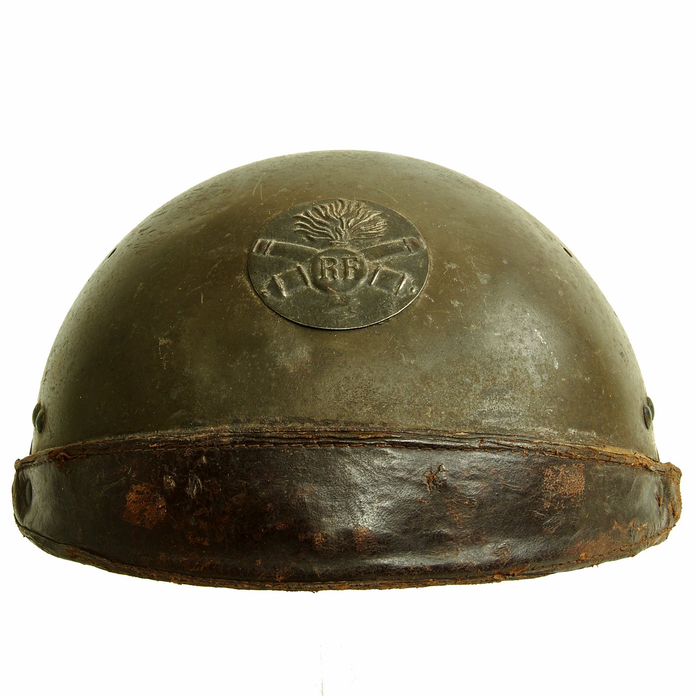 The helmet is dent free and features much of its original paint and has an RF (République Française) flaming bomb badge with "Crossed Cannons", the emblem for artillery. Some of the tank forces were considered artillery, and this badge shows no signs of replacement, so it is definitely original to the helmet. We have found other examples of this type of helmet with the Artillery badge.