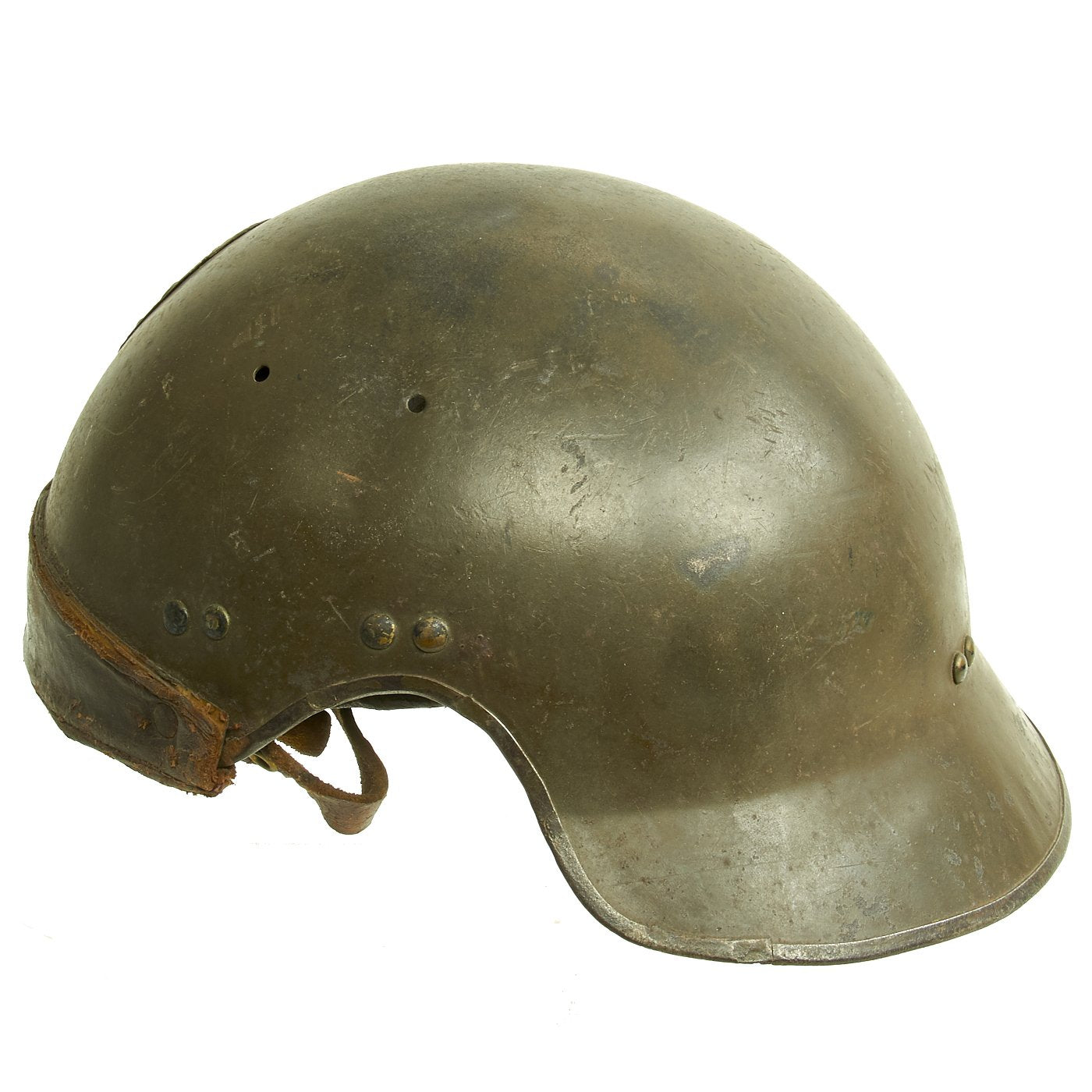 Original Item: Only One Available. This is very difficult type of helmet to find, known as the Chars de Combat helmet or Armored vehicle helmet. Features a steel skull shell with rear visor and front leather brow pad. These helmets were issued to armored vehicle and tank crews in the French military before and during Word War Two. This particular example has ear cutouts in the shell, something we have not seen before!