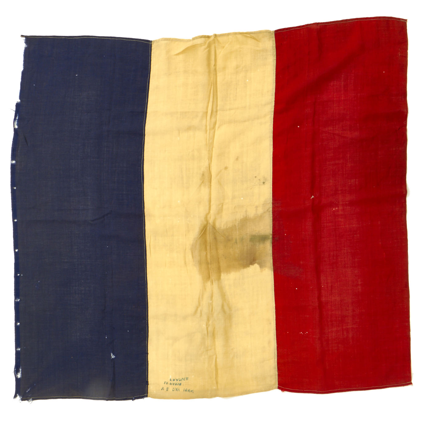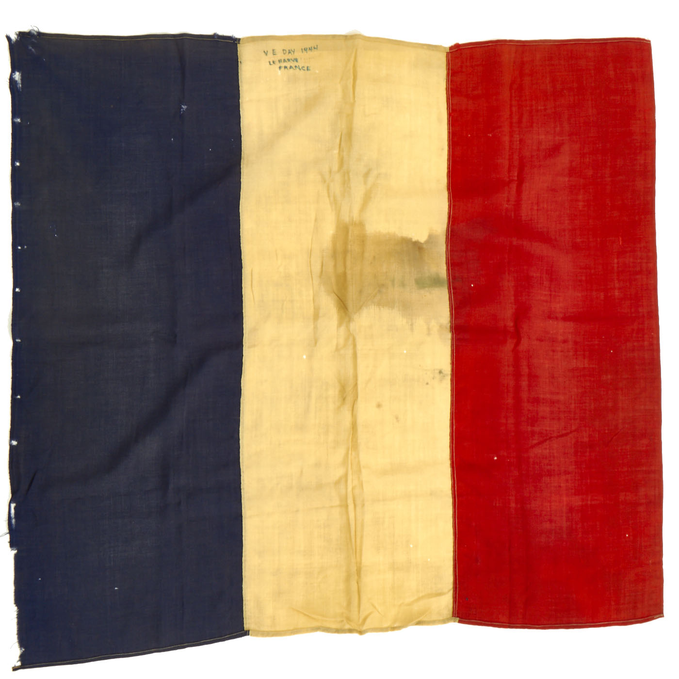 Original Item: One-of-a-kind. This wool constructed French National Flag measures approximately 48 inches x 52 inches. Genuine WW2 issue French national flag multi-piece wool construction offered in good but yellowed and used condition consistent with its age and use in Europe during WWII. Shows areas of moth, but overall it is sturdy and solid.