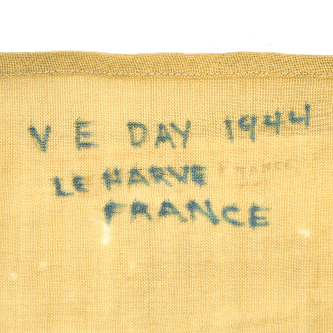 The most interesting aspect of this flag is that it was marked VE DAY 1944 LE HARVE FRANCE in what appears to be a WWII U.S. issue laundry marker.