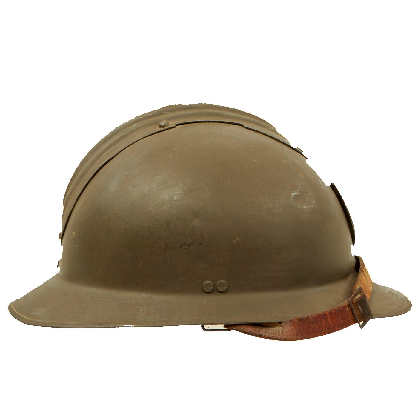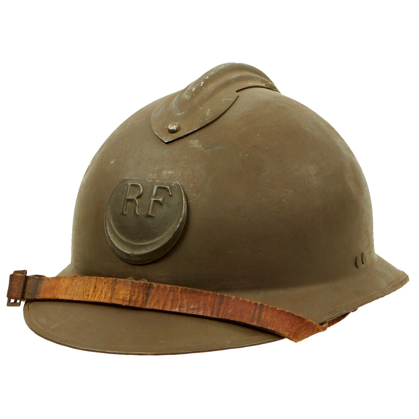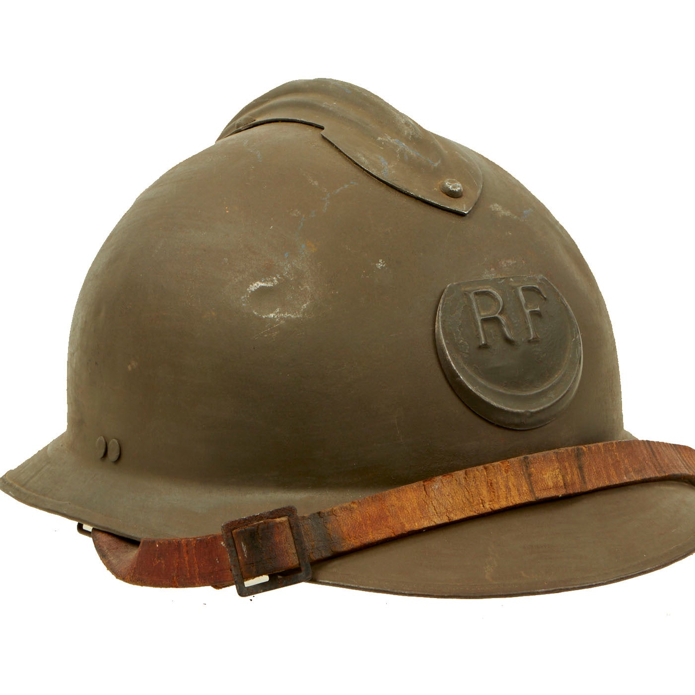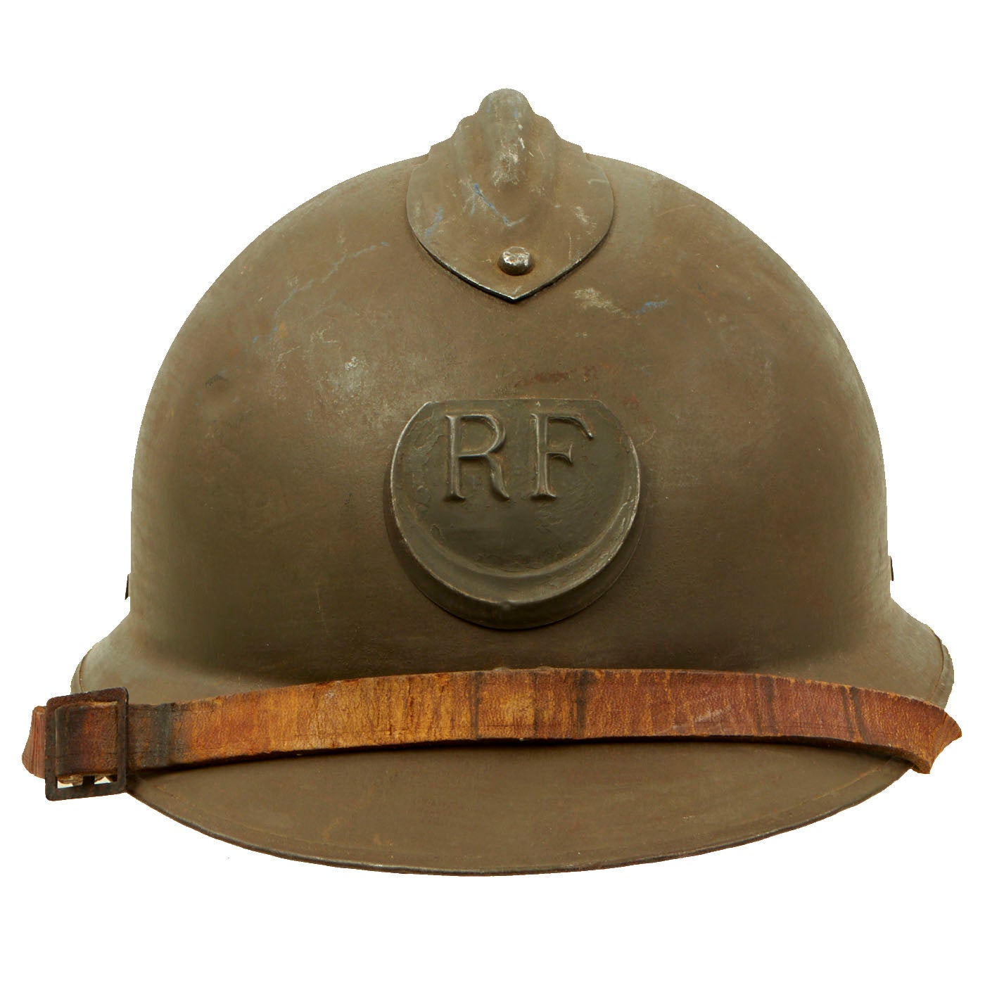 Original Item: Only One Available. Excellent genuine World War II model 1926 French North African campaign Zouave helmet. The helmet retains the original olive green paint and is complete with the French North African Zouave RF (République Française) badge to front. Size is approximately US 7.25 (58cm). Features a wonderful complete original leather liner in a heavily worn condition. The liner finish is cracking around the rim of the liner band and one of the fingers is torn. The chinstrap is present and in one piece, however the leather is dry and worn due to age and wear. Overall condition of the helmet is very good, shell shows some minor dings, scratches and paint loss consistent with age. These helmets are rare and very hard to find in such good condition.
