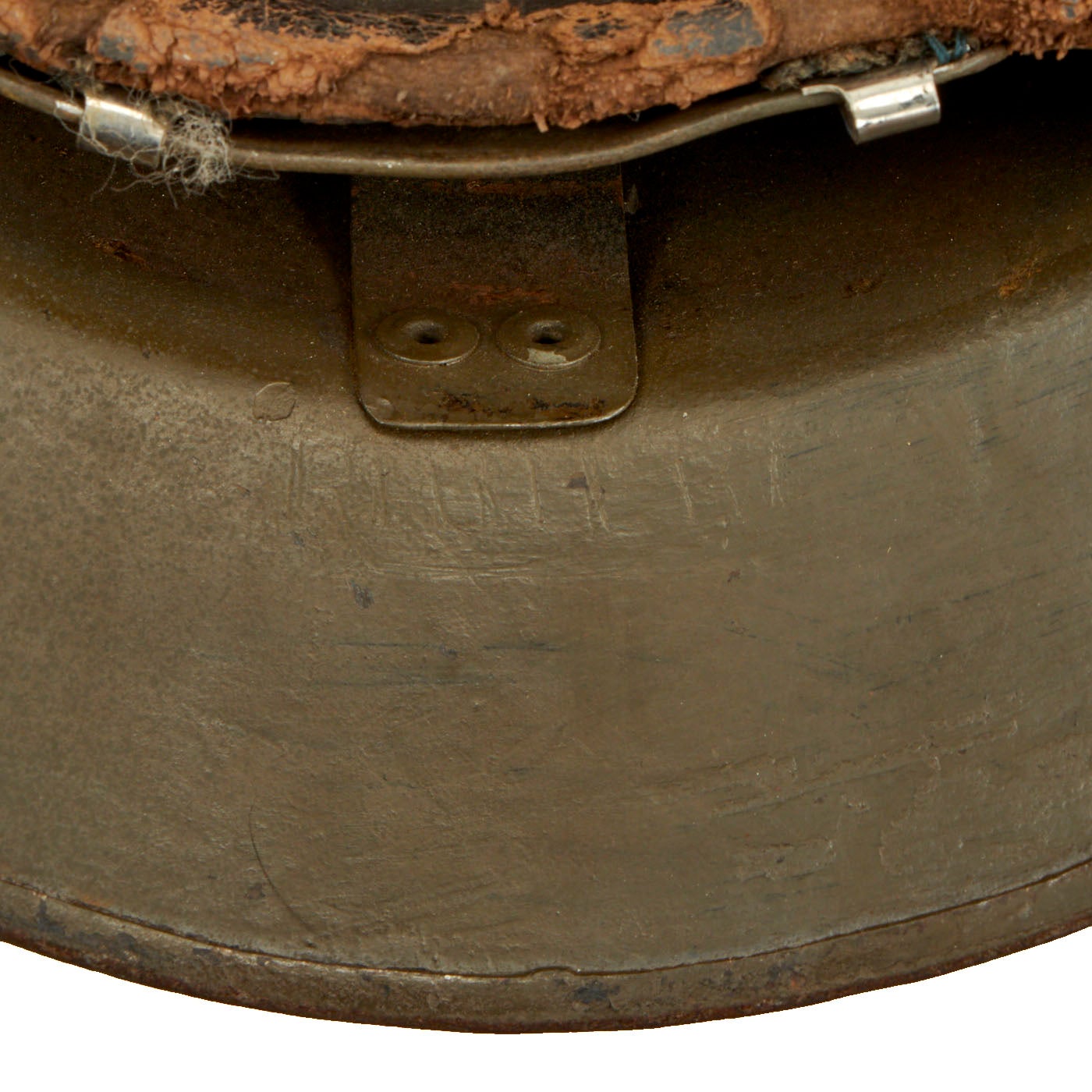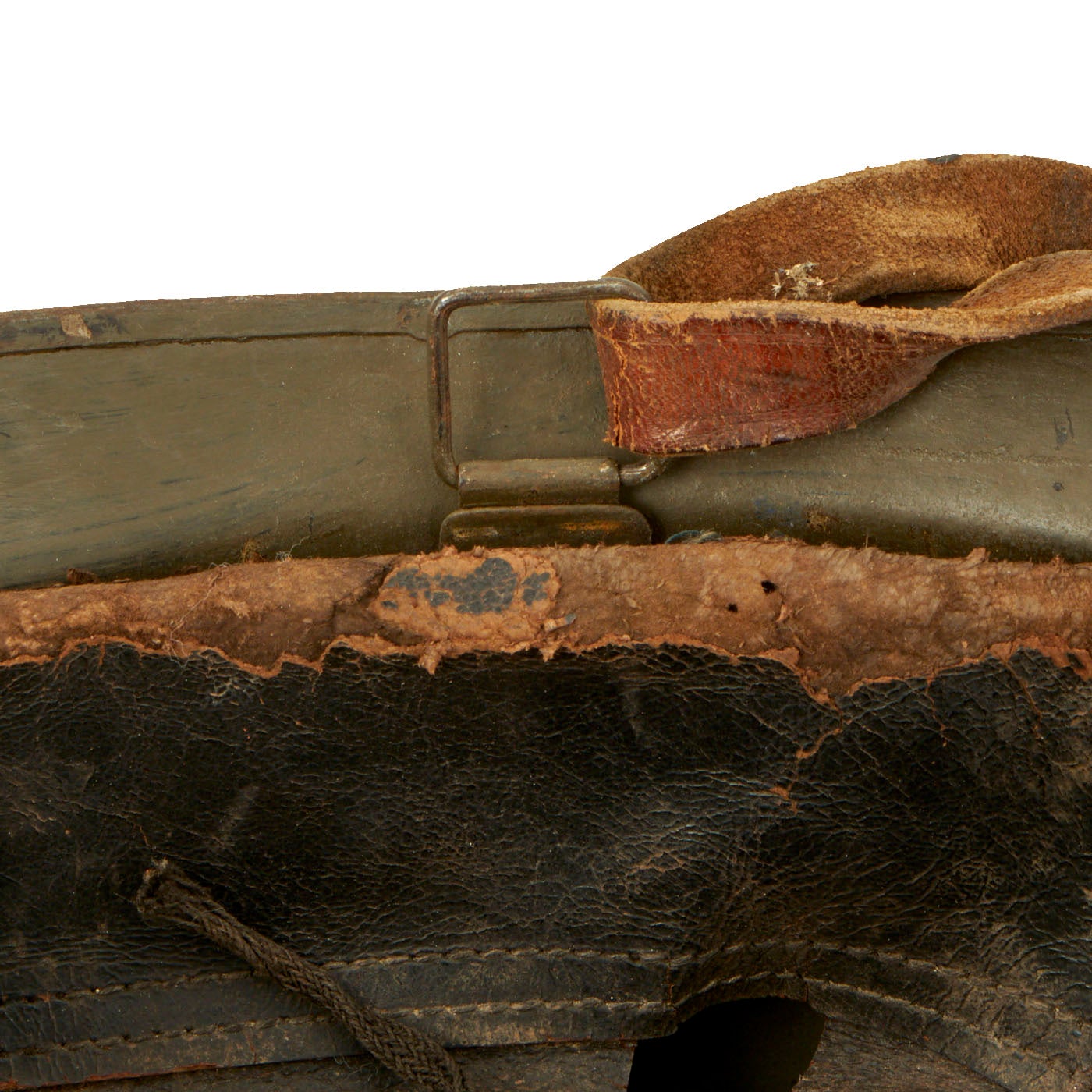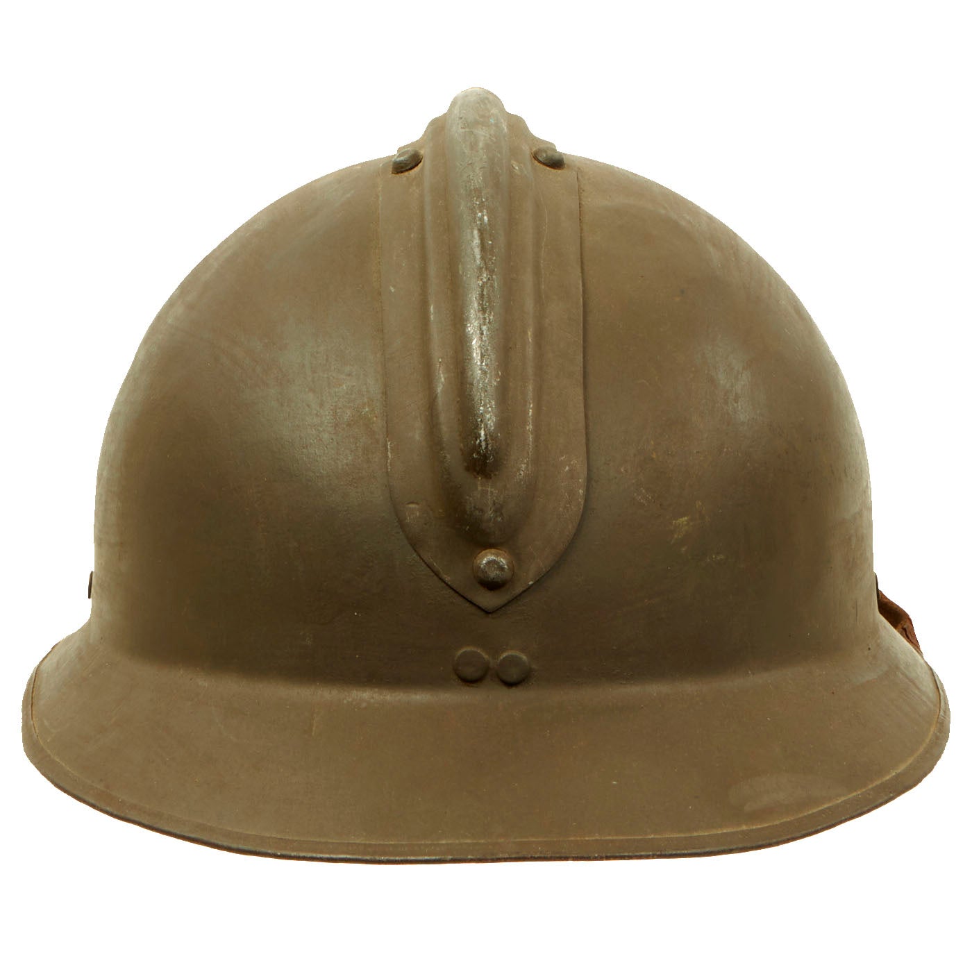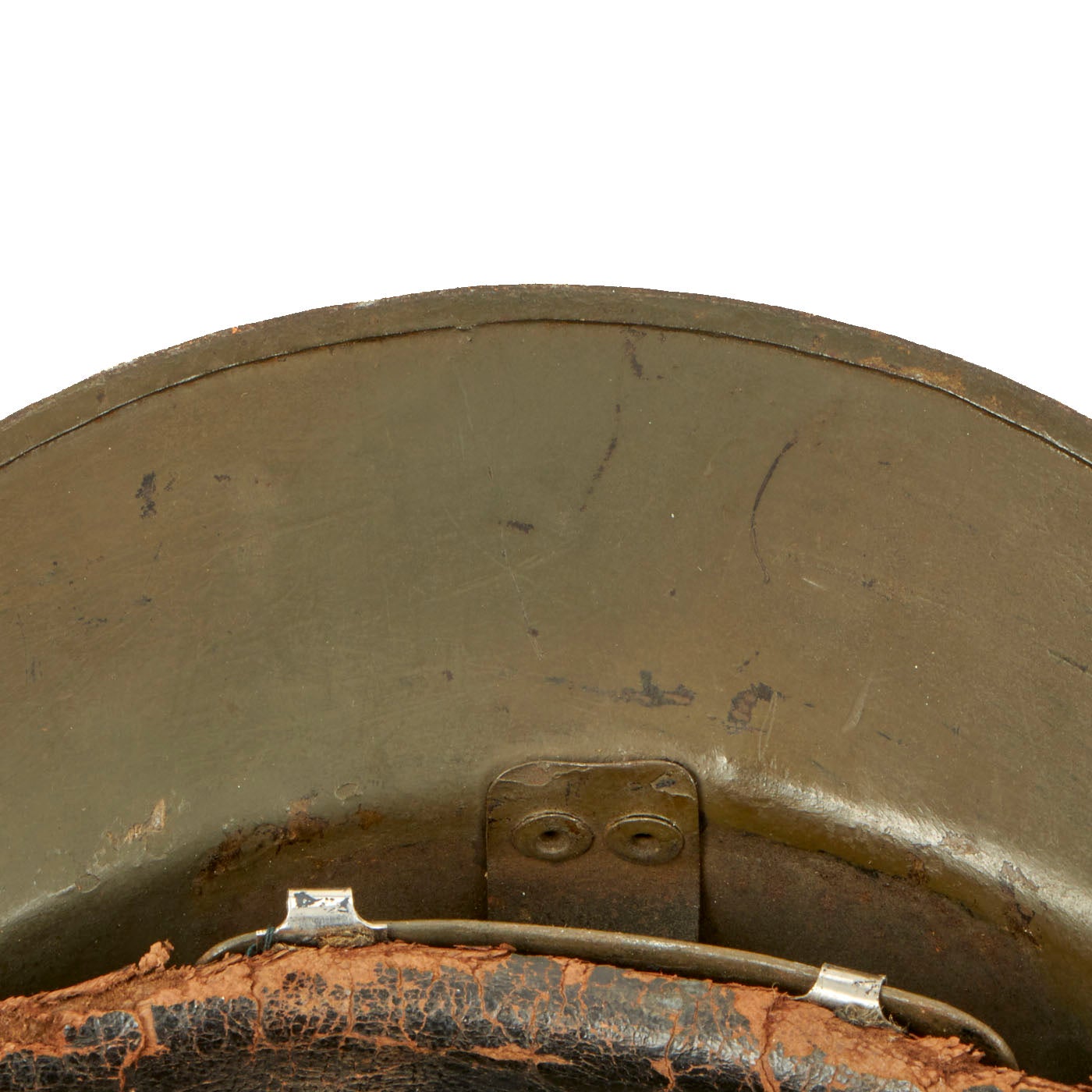 Original Item: Only One Available. Excellent genuine World War II model 1926 French North African campaign Zouave helmet. The helmet retains the original olive green paint and is complete with the French North African Zouave RF (République Française) badge to front. Size is approximately US 7.25 (58cm). Features a wonderful complete original leather liner in a heavily worn condition. The liner finish is cracking around the rim of the liner band and one of the fingers is torn. The chinstrap is present and in one piece, however the leather is dry and worn due to age and wear. Overall condition of the helmet is very good, shell shows some minor dings, scratches and paint loss consistent with age. These helmets are rare and very hard to find in such good condition.