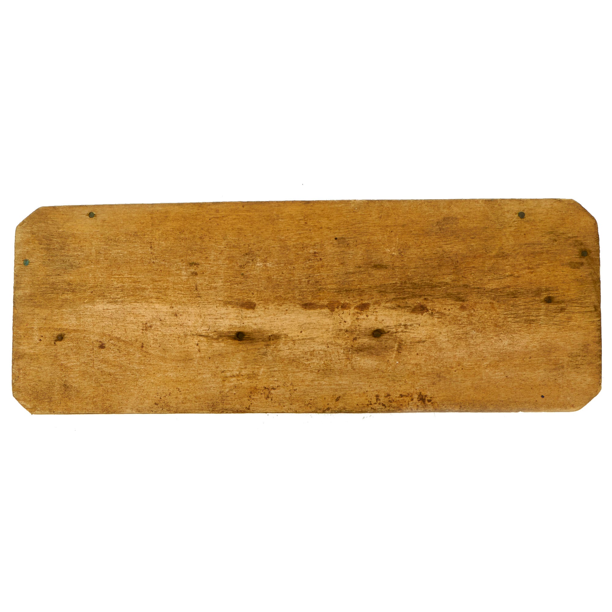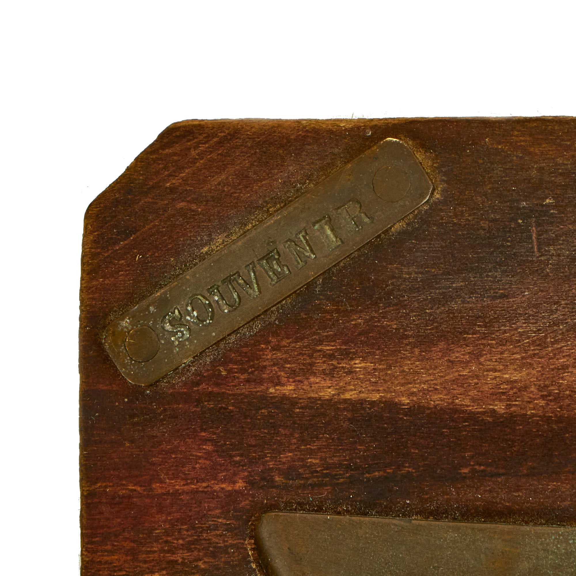 During the siege and after the German surrender, local businesses started making and selling souvenir items for the servicemen to take home, and this is one such example. It is a 4"H x 11"W wooden plaque, which has a brass U-boat attached to the front, with smaller brass tags reading SOUVENIR and LA PALLICE in the corners. The U-boat is made from two piece of brass, and looks like a generic German submarine, and not any particular variant that we were able to identify. It is also from the waterline up.