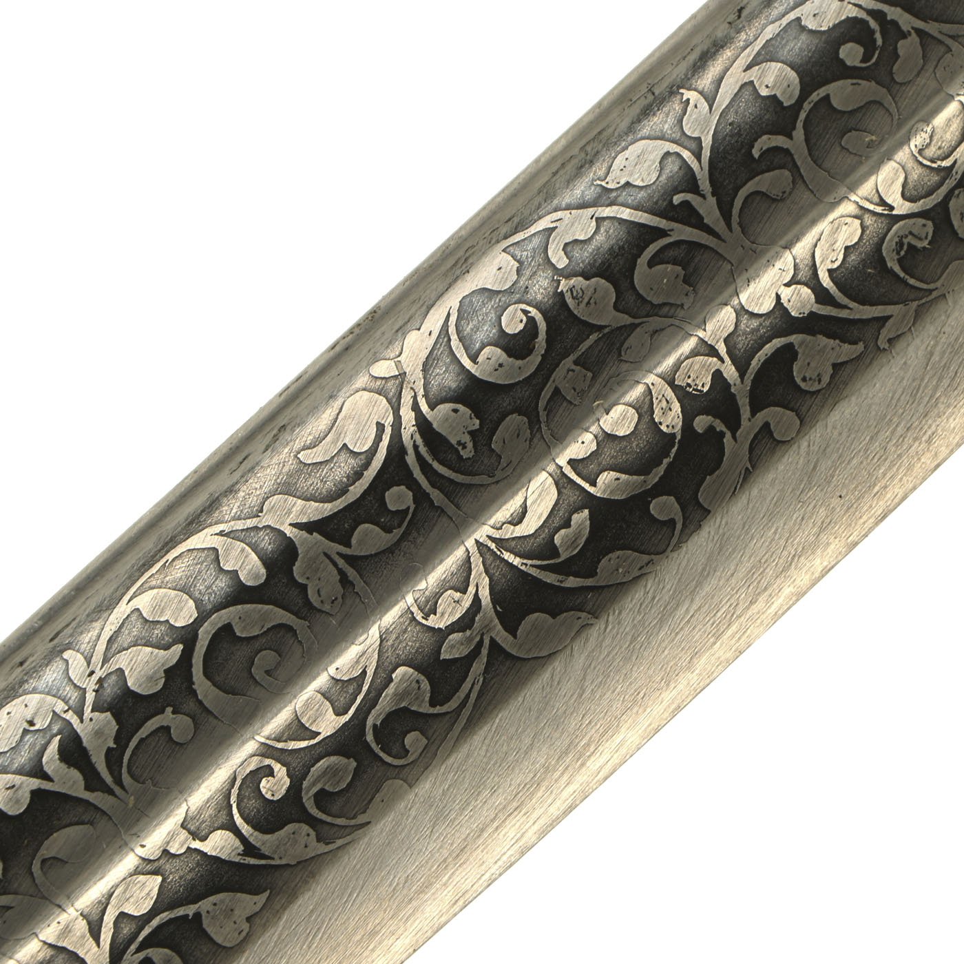 In total length it measures 37" with a 31 1/2" curved blade, which has two large fullers running its entire length, typical of the style. The blade looks to be made of Persian-style "Wootz" steel, a form of laminated crucible steel, and the fullers are heavily etched with floral designs on both sides on the lower half of the blade.