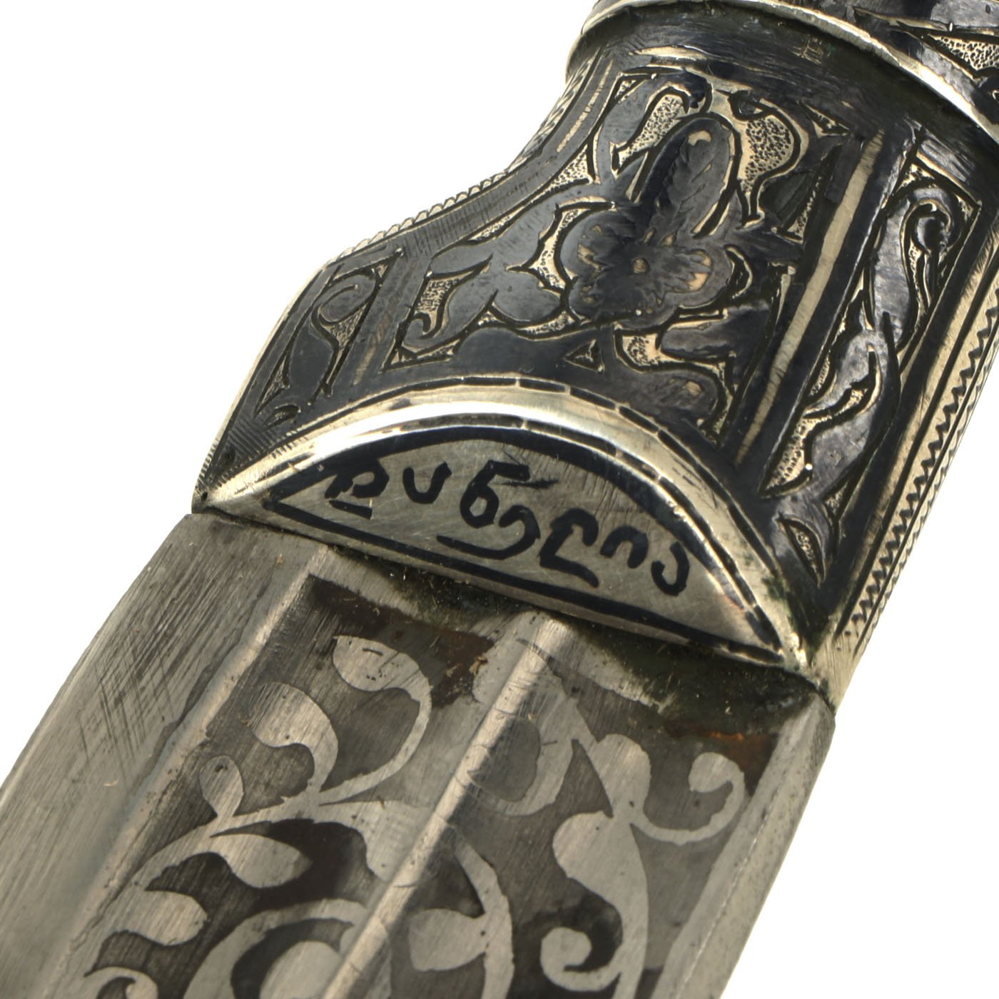 The hilt is SIGNED in Georgian script which translates to "SIMON DANELLA", a well documented Sword Maker of the Victorian era circa 1860-1880. This signature is located on the sloped bolster where the hilt meets the blade on the right hand side of the sword.