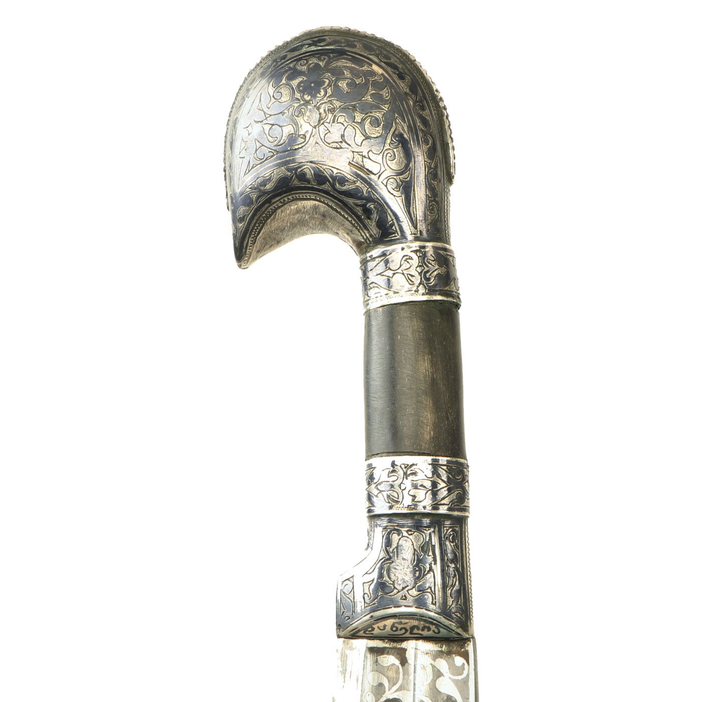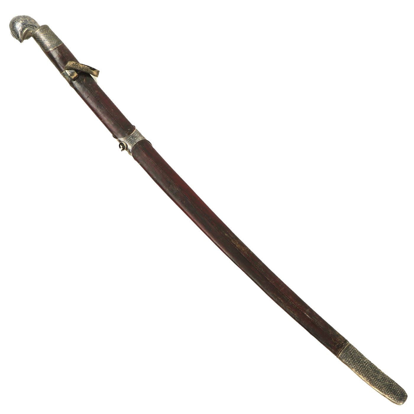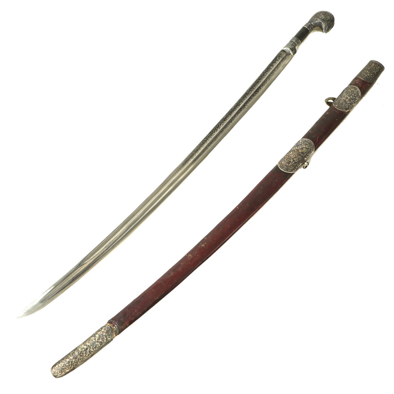 The scabbard in leather covered wood in a rich plumb color with FOUR Niello Silver mounts, the second from top retaining its original leather belt loop, the third from top retaining it's original suspension ring. Together with the substantial top and bottom mounts all decorated to match with the most intricate Niello Silver scroll engravings.