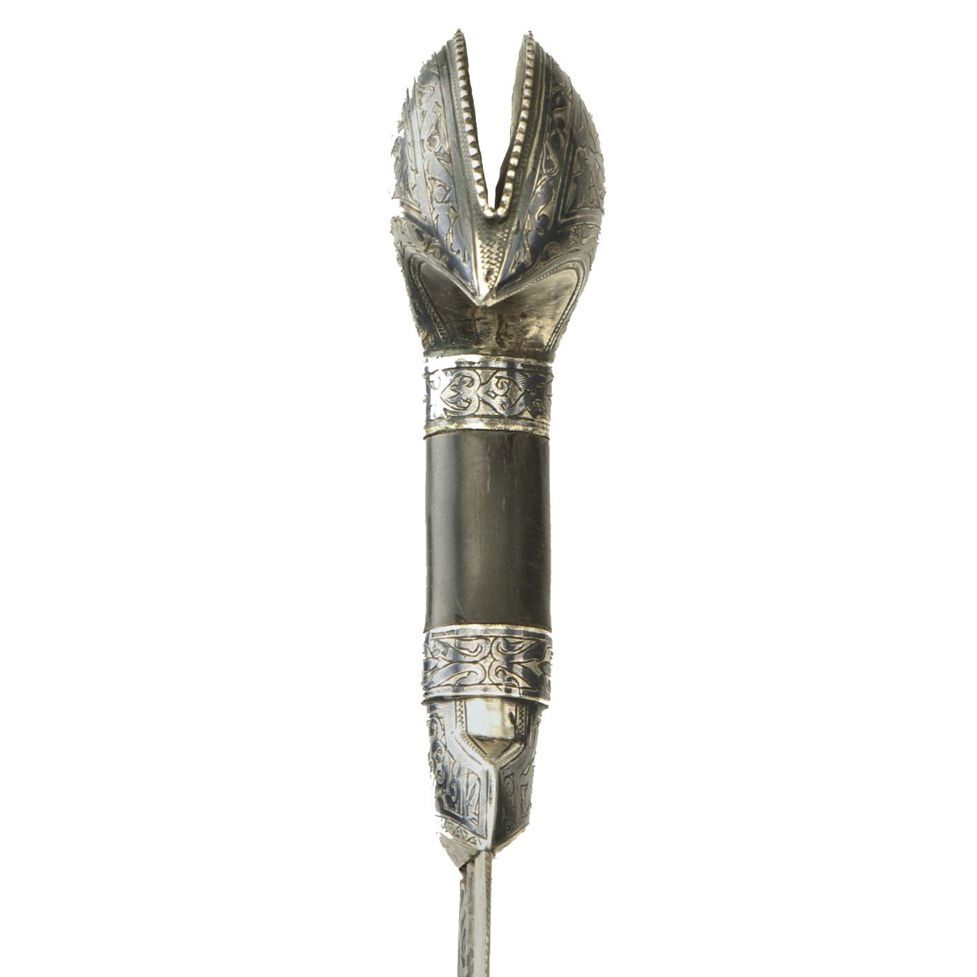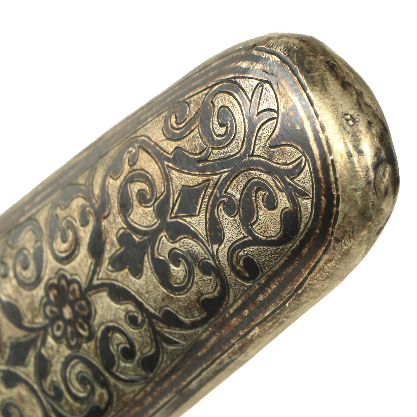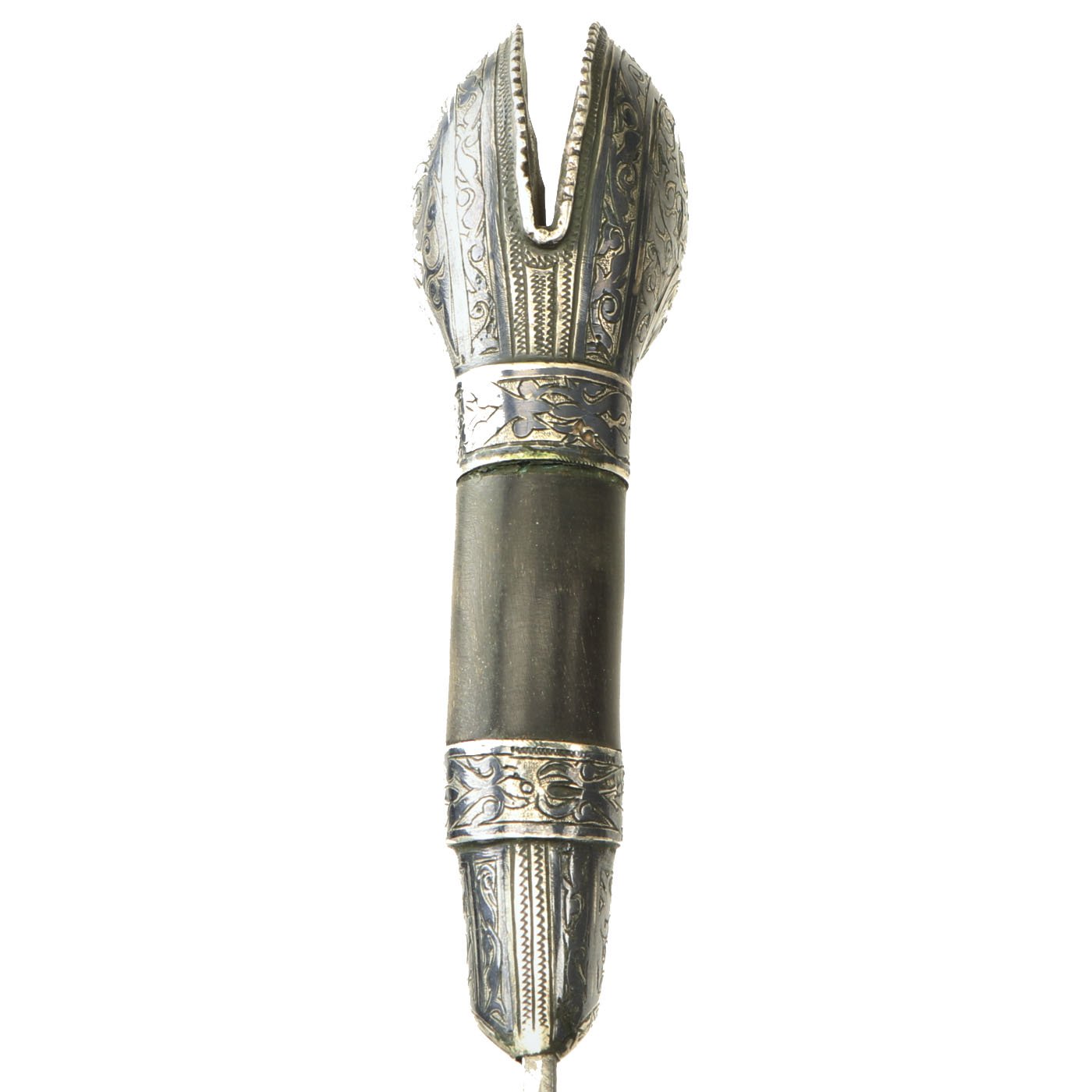 The scabbard in leather covered wood in a rich plumb color with FOUR Niello Silver mounts, the second from top retaining its original leather belt loop, the third from top retaining it's original suspension ring. Together with the substantial top and bottom mounts all decorated to match with the most intricate Niello Silver scroll engravings.