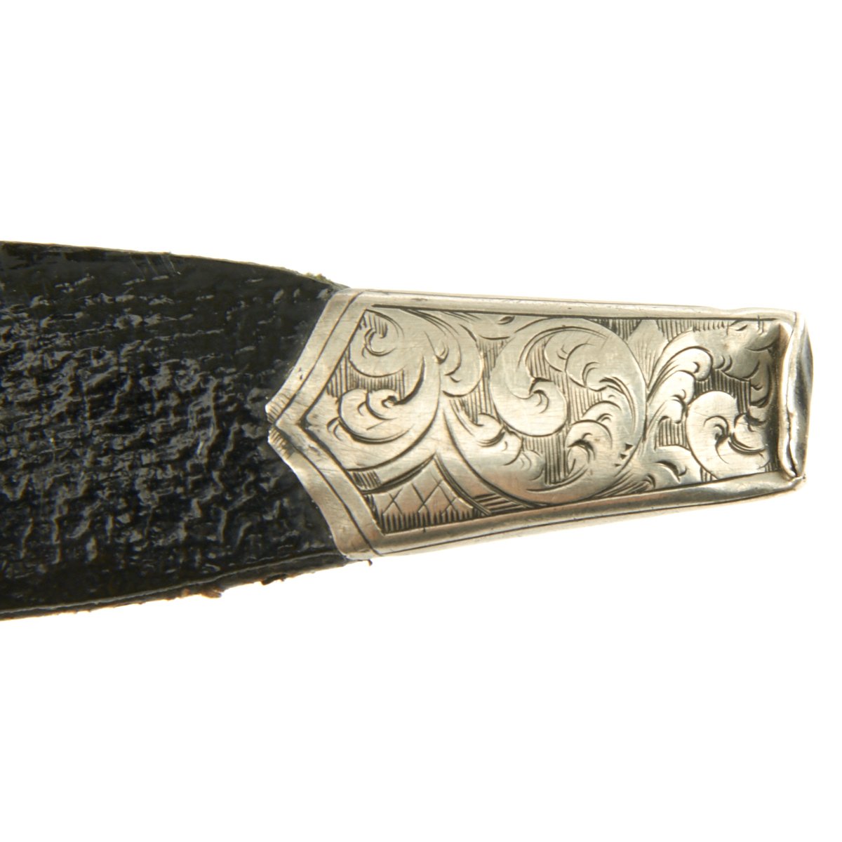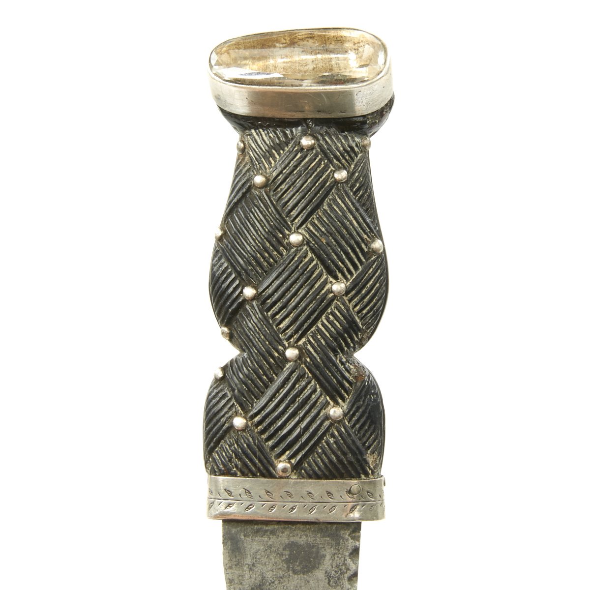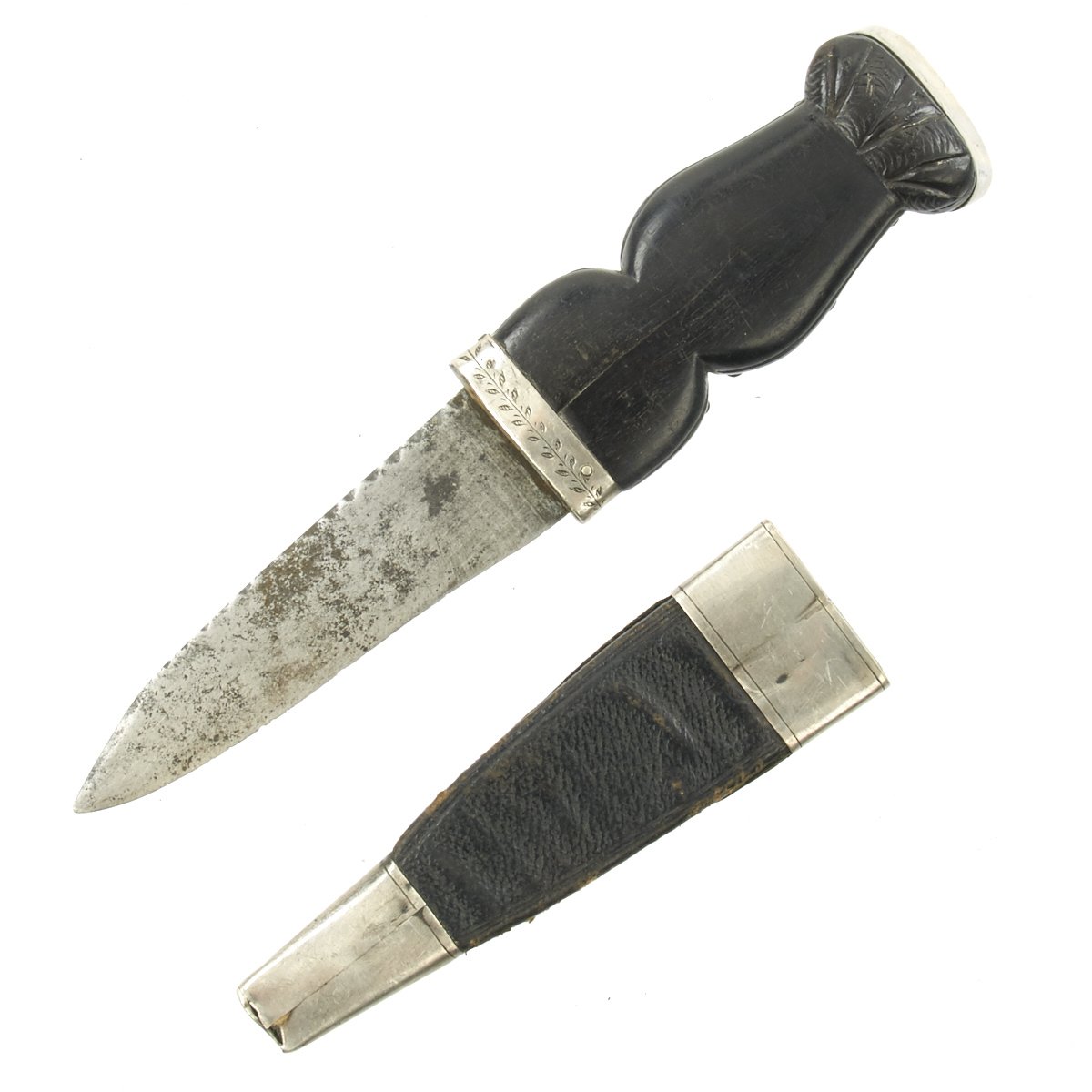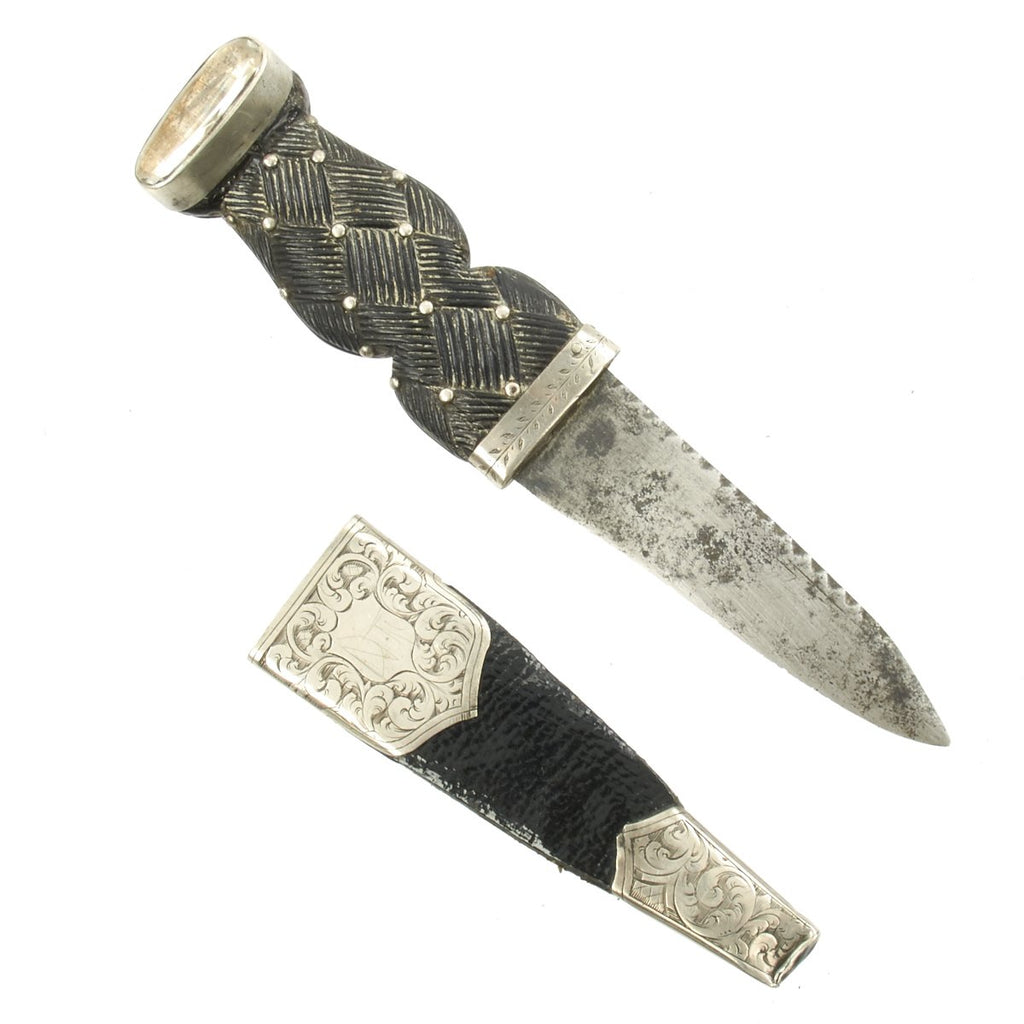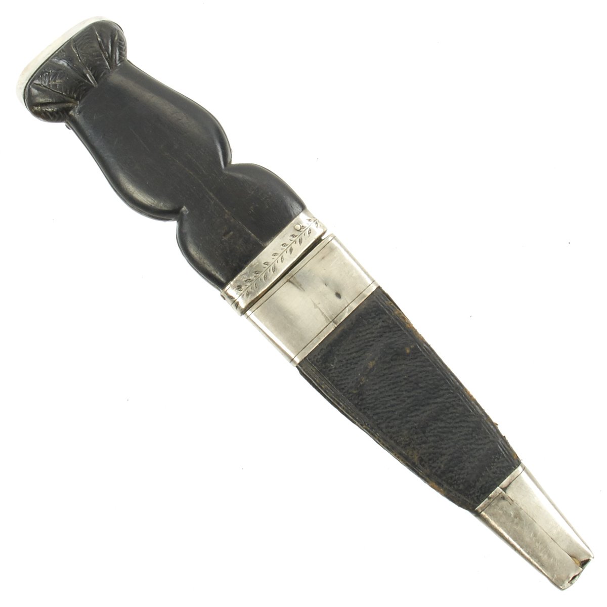 This is definitely a charming example, measuring just 3" in blade length and an overall length of a tad more than 6". The hilt made of a hard black wood, perhaps Ebony or Bog Oak which has been carved with grammatical lines and decorated with silver studs. The pommel sports a clear semi precious stone and the mounts are all of white metal, very possibly silver. Again the mounts have all been decorated with floral engravings. Originally intended to assist in carving a chunk off the Clan's Roast, we suppose they were even pressed into some sort of self defense.