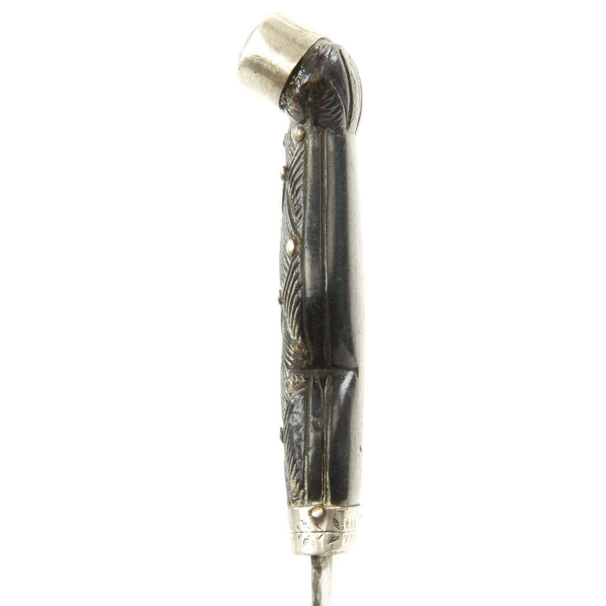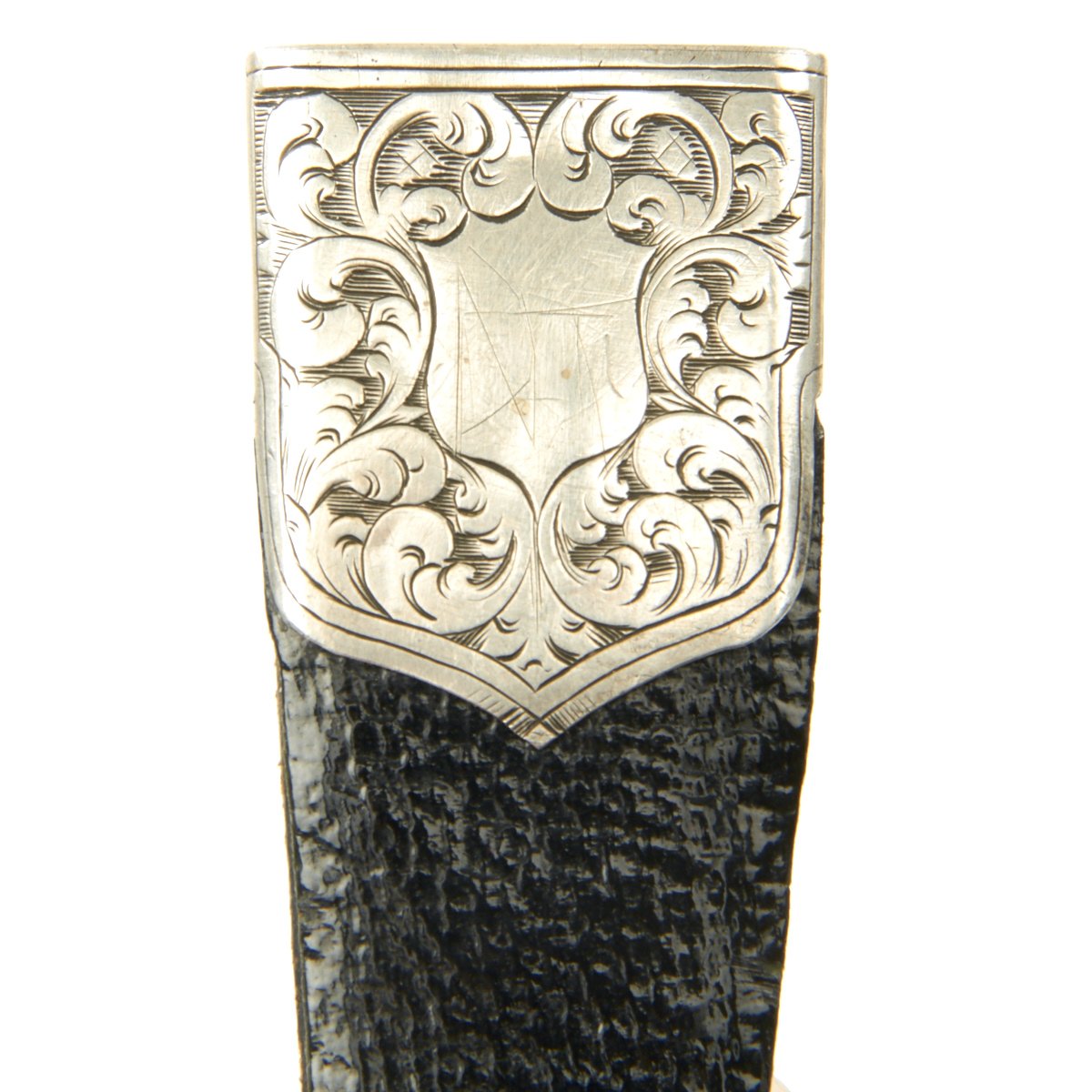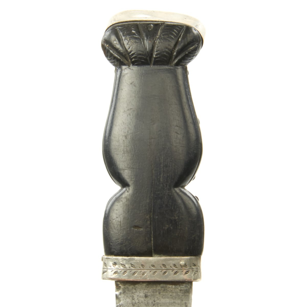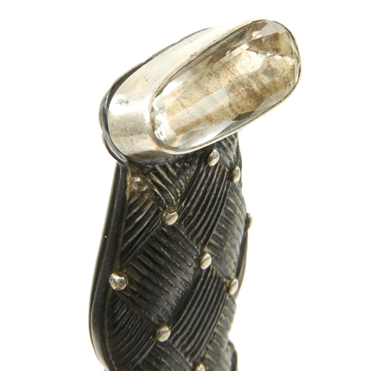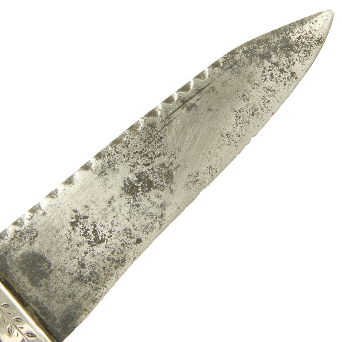 This is definitely a charming example, measuring just 3" in blade length and an overall length of a tad more than 6". The hilt made of a hard black wood, perhaps Ebony or Bog Oak which has been carved with grammatical lines and decorated with silver studs. The pommel sports a clear semi precious stone and the mounts are all of white metal, very possibly silver. Again the mounts have all been decorated with floral engravings. Originally intended to assist in carving a chunk off the Clan's Roast, we suppose they were even pressed into some sort of self defense.