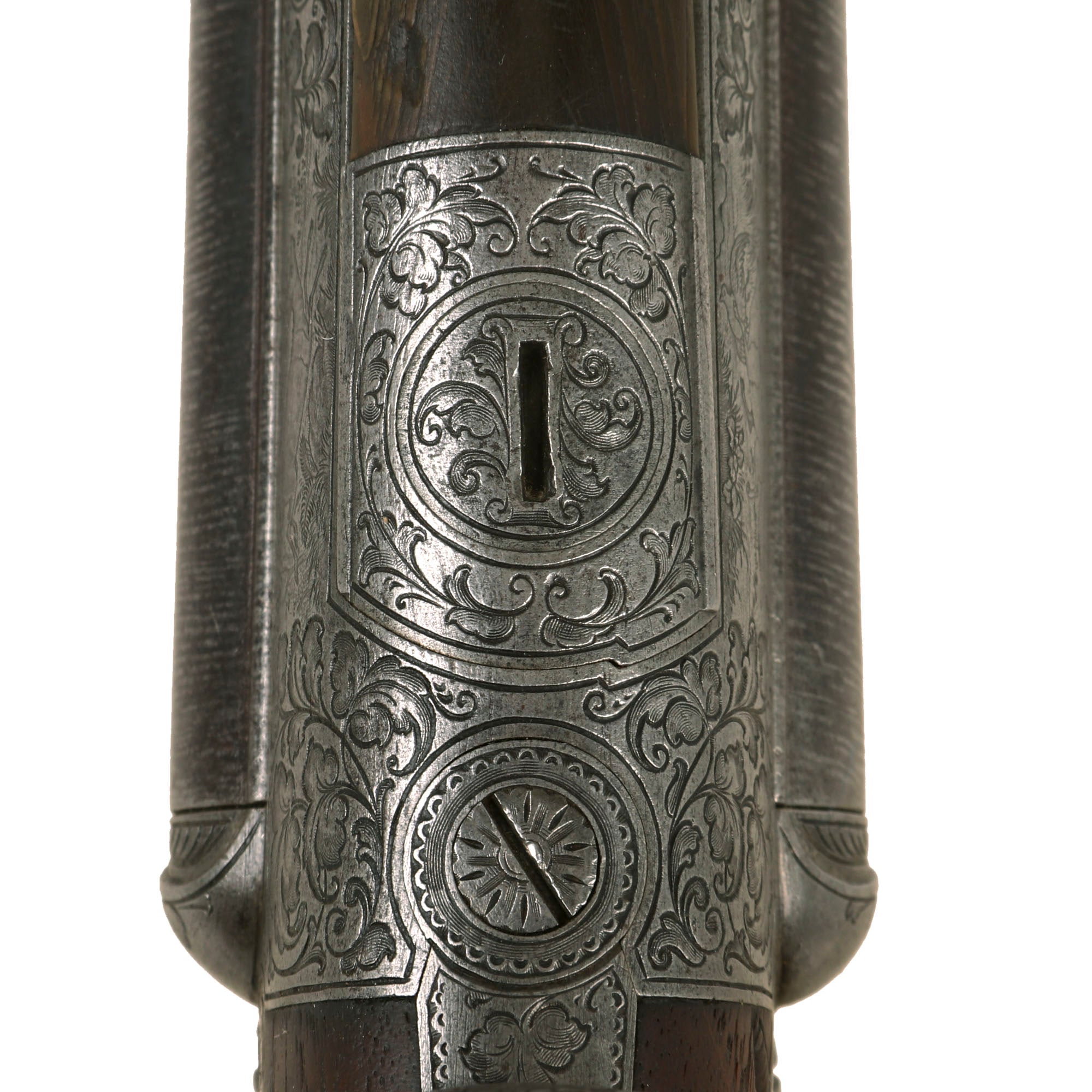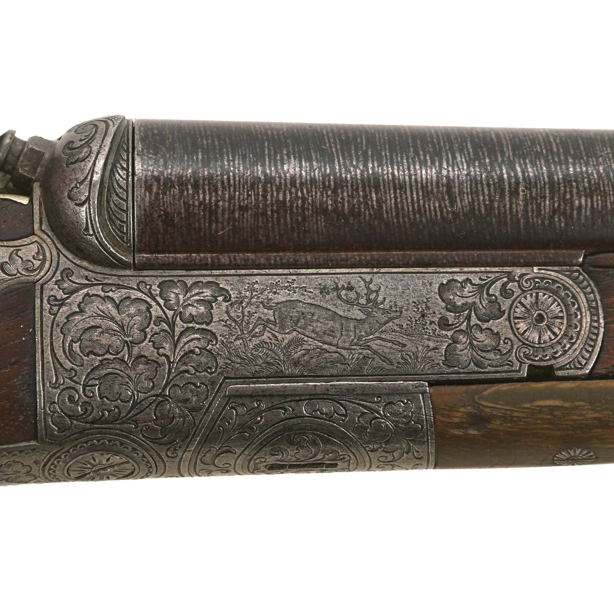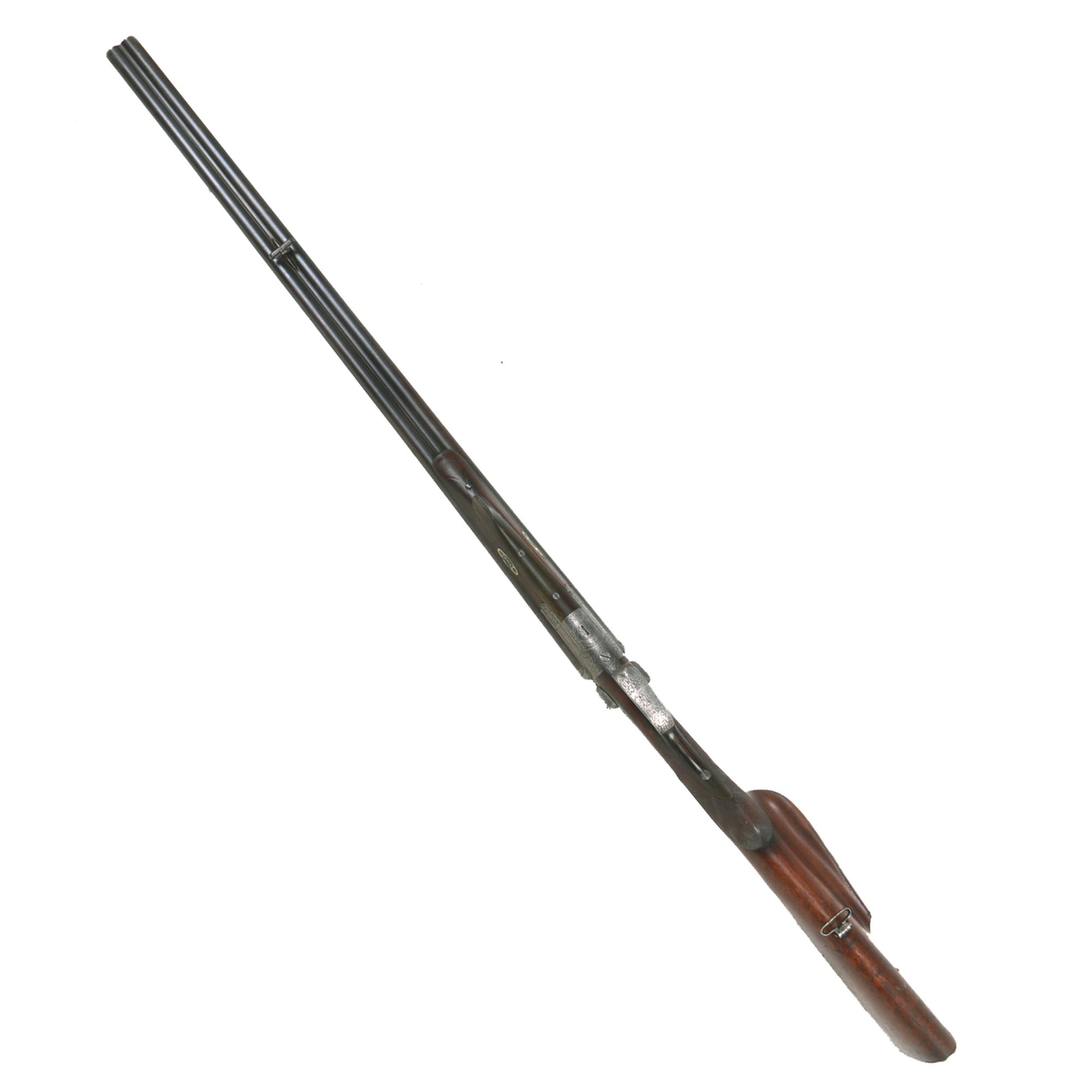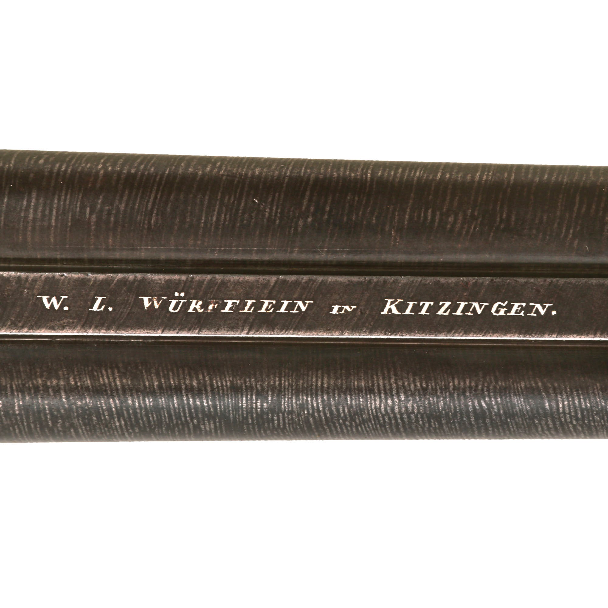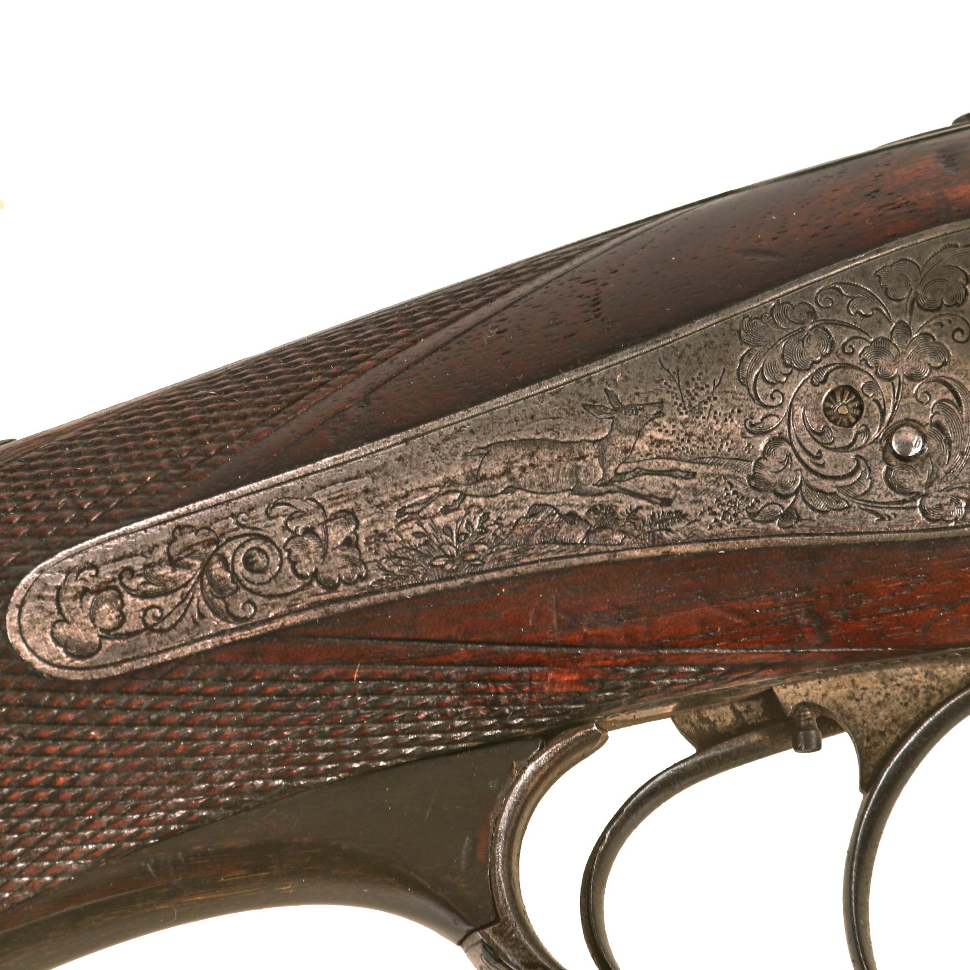 Original Item: Only One Available. Here we have a very upmarket German-made Double Barreled Hammer shotgun manufactured by W.L. Würfflein in Kitzingen, as is inlaid in silver on top of the barrels. It features ornate designs embossed and engraved on virtually the entire frame / receiver area. There is lots of foliate work, with game animals shown on both sides: fowl being eaten by a fox, and another hunted by a dog, and a buck & doe on the right side. The decoration extends onto both the top and bottom of the receiver, with the wood stock given heavy checkering around these areas and on the forestock. The trigger guard is heavily decorated as well, with even the gorgeous retractable sight being given some engraving.