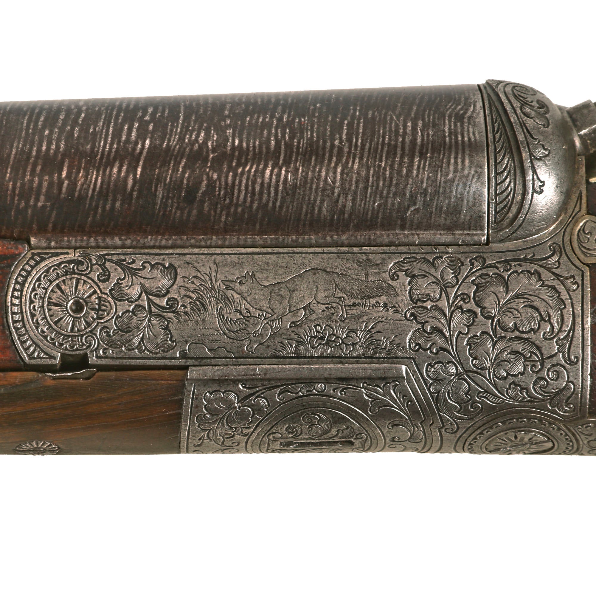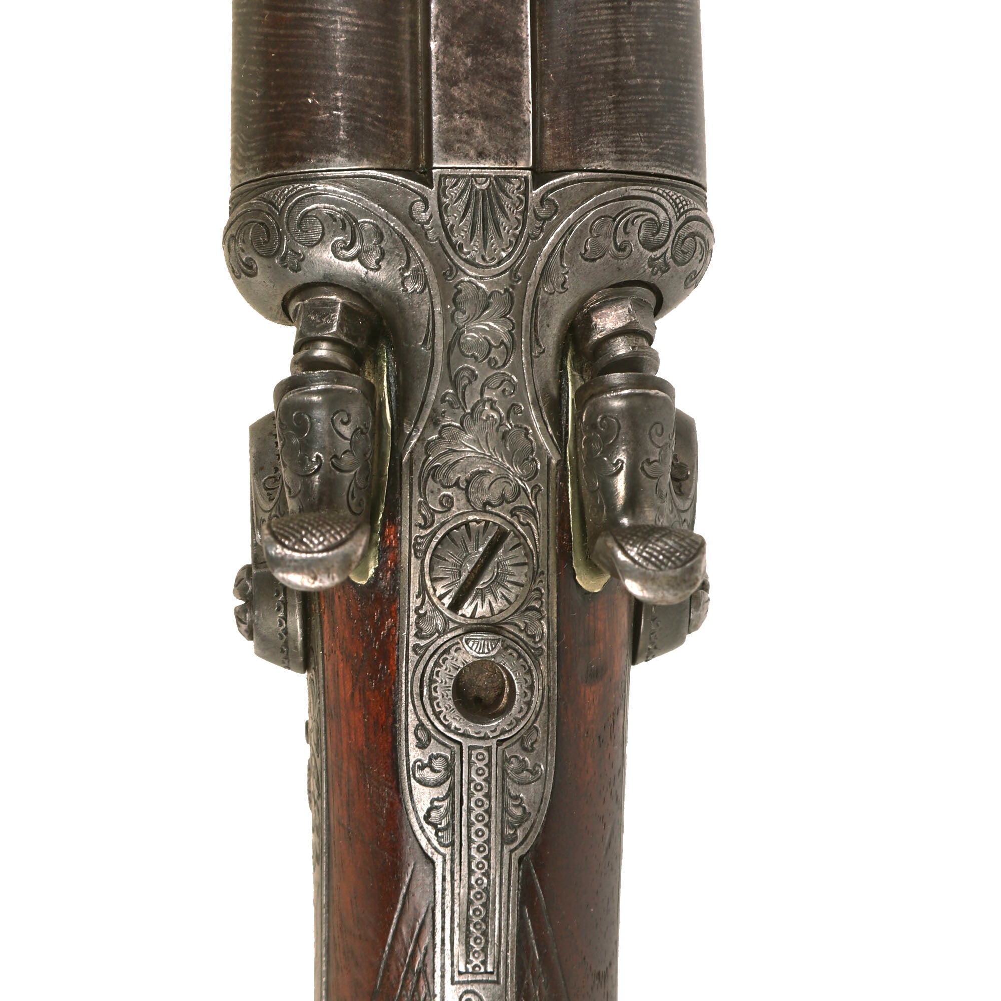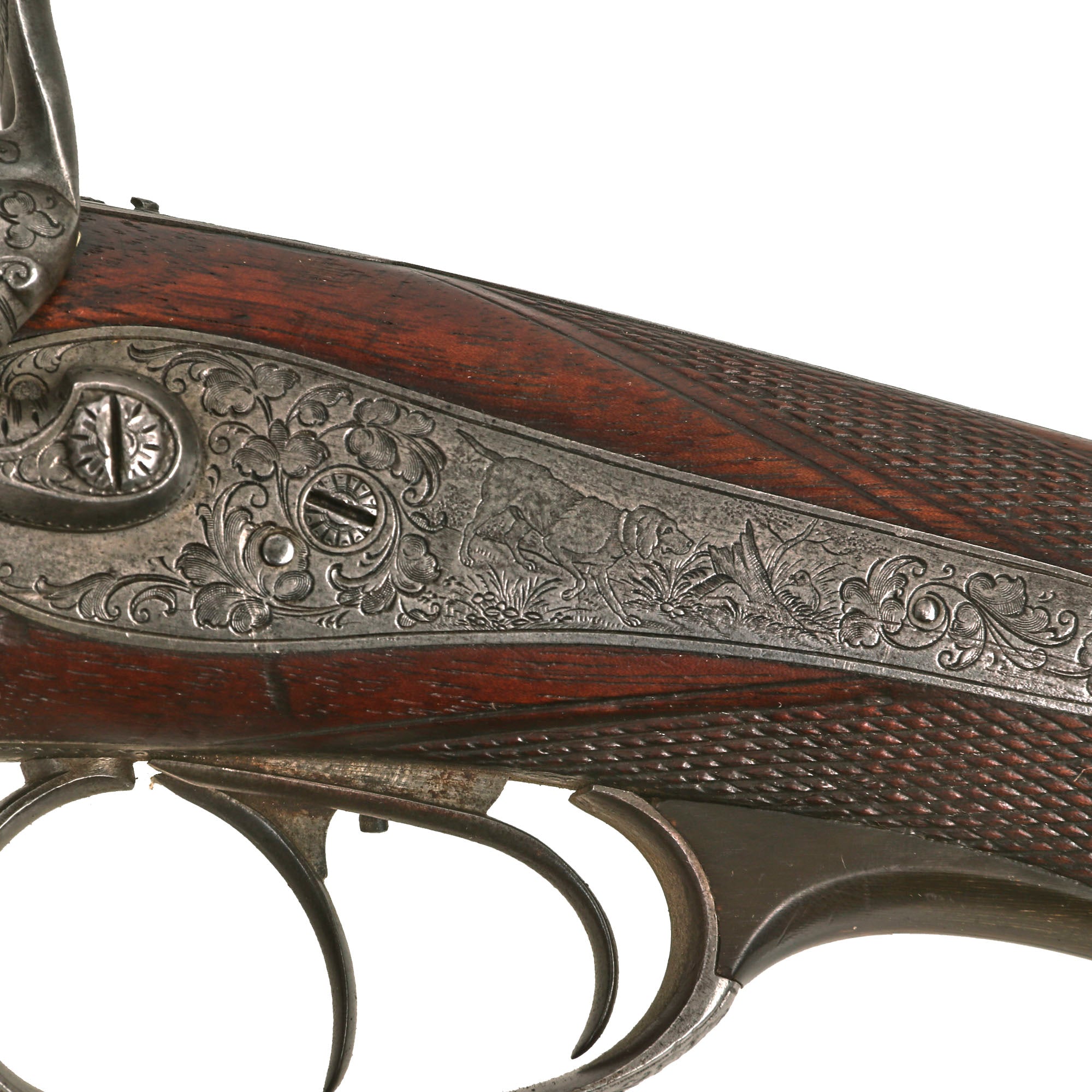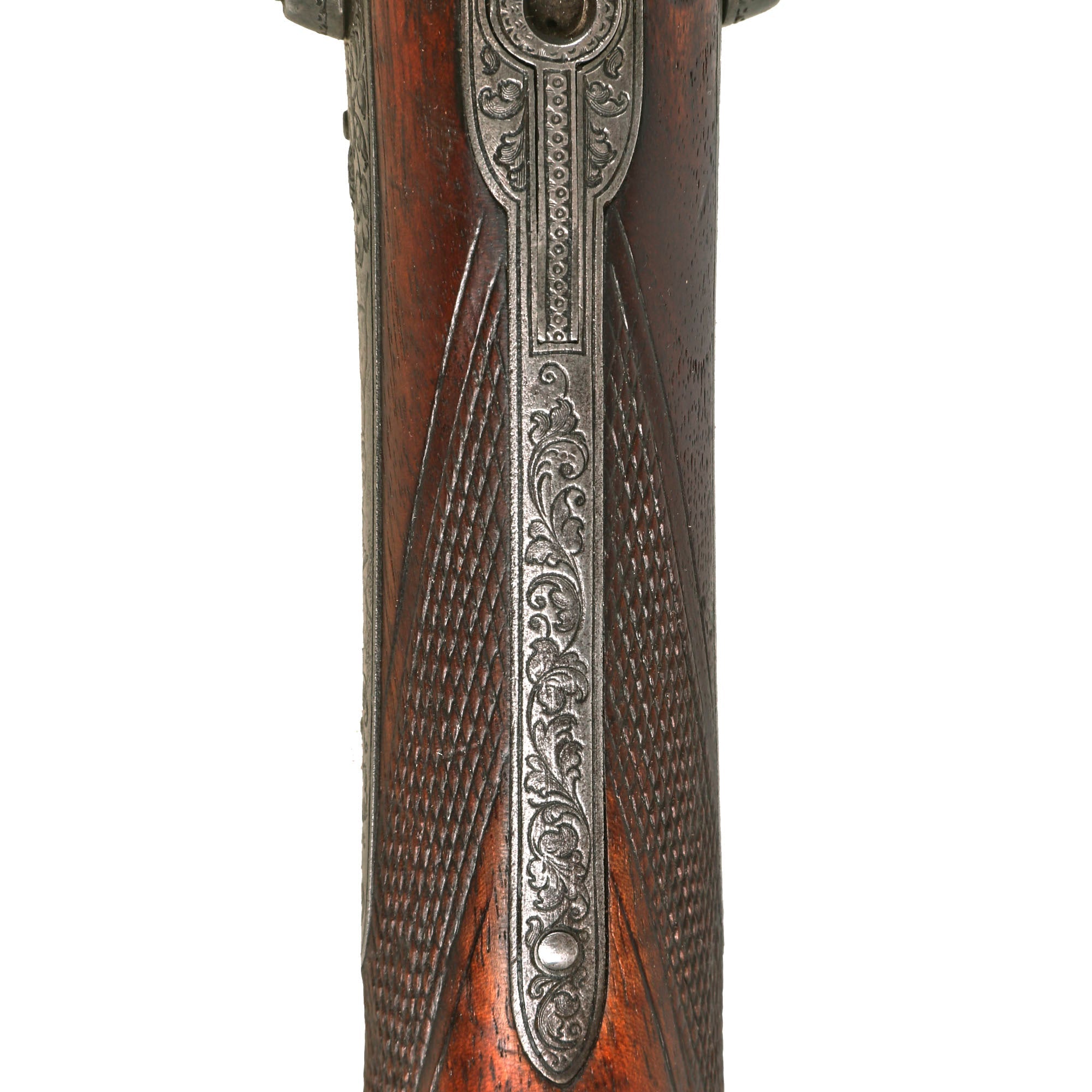 Original Item: Only One Available. Here we have a very upmarket German-made Double Barreled Hammer shotgun manufactured by W.L. Würfflein in Kitzingen, as is inlaid in silver on top of the barrels. It features ornate designs embossed and engraved on virtually the entire frame / receiver area. There is lots of foliate work, with game animals shown on both sides: fowl being eaten by a fox, and another hunted by a dog, and a buck & doe on the right side. The decoration extends onto both the top and bottom of the receiver, with the wood stock given heavy checkering around these areas and on the forestock. The trigger guard is heavily decorated as well, with even the gorgeous retractable sight being given some engraving.