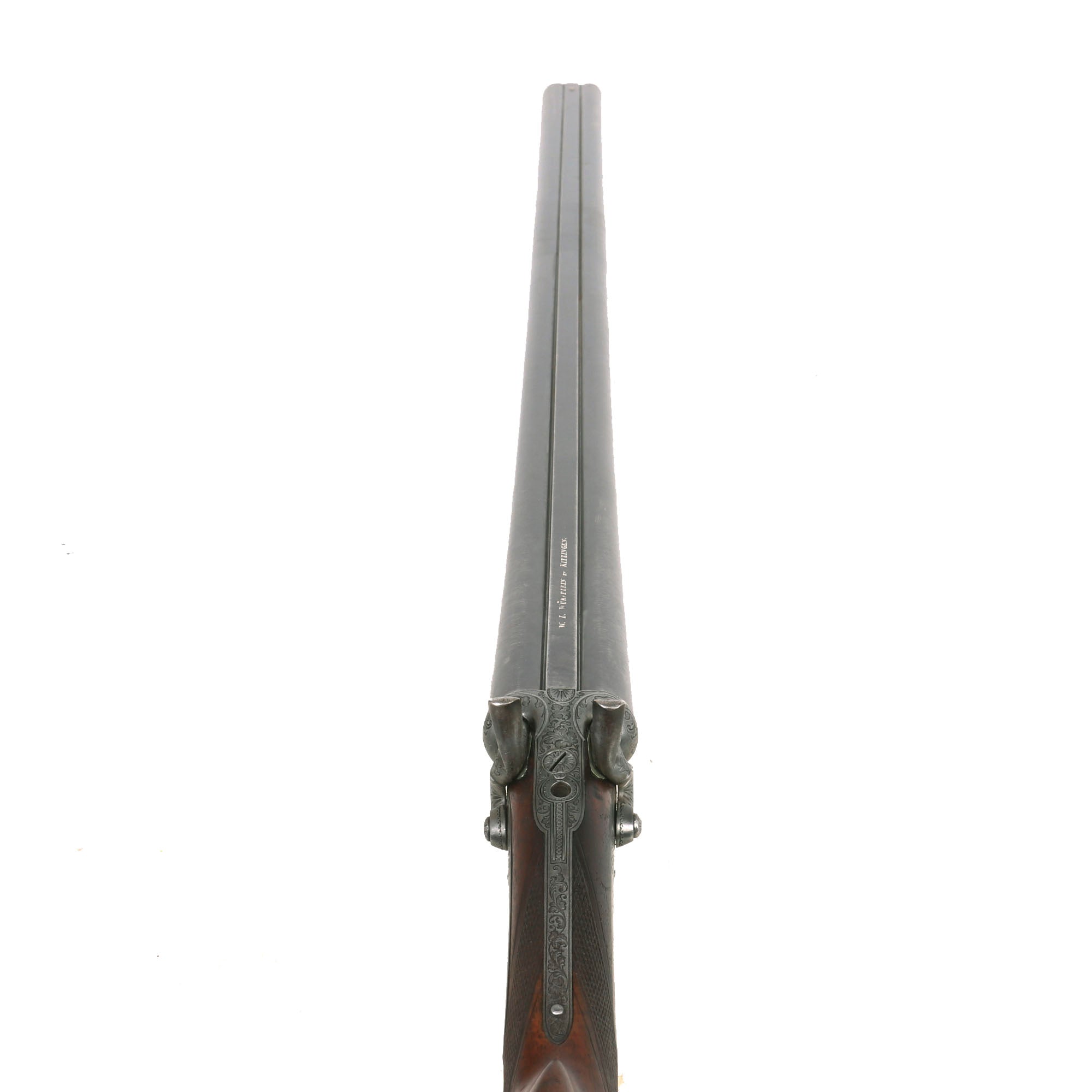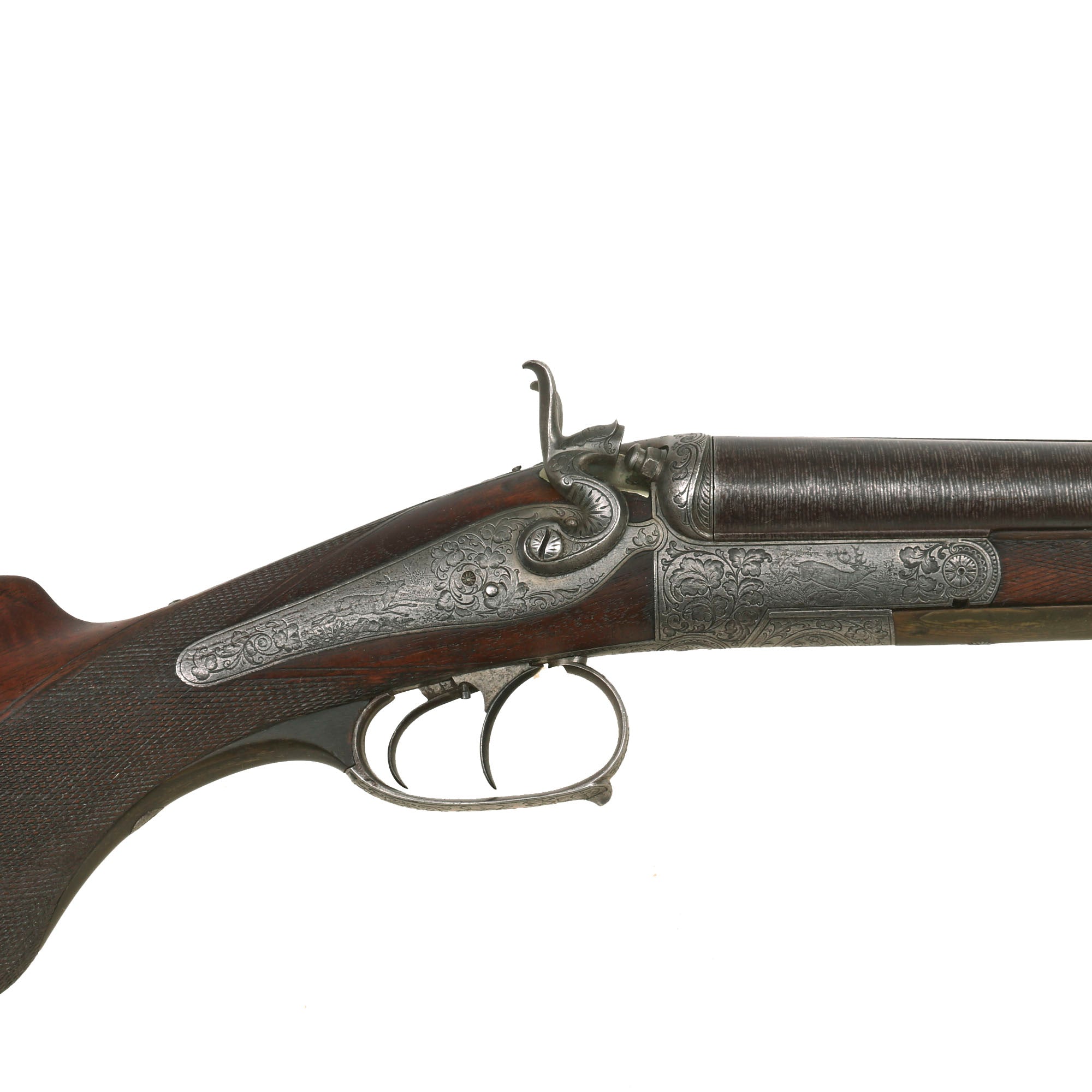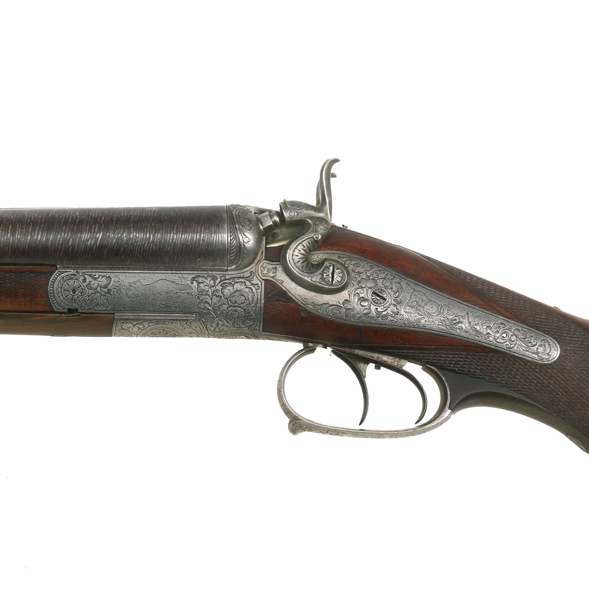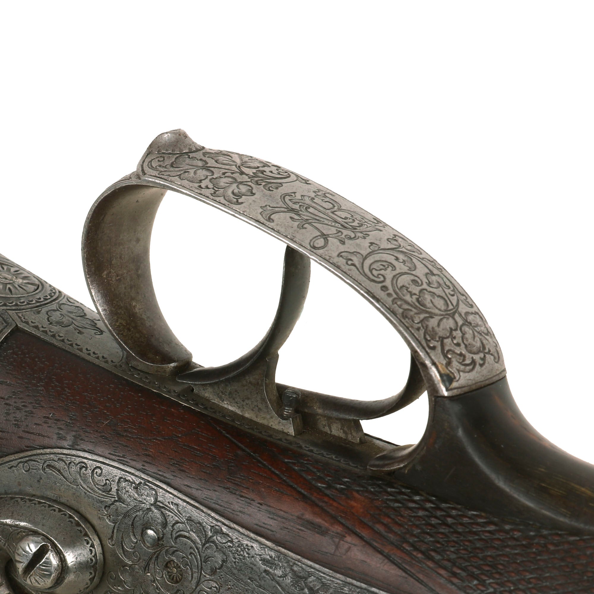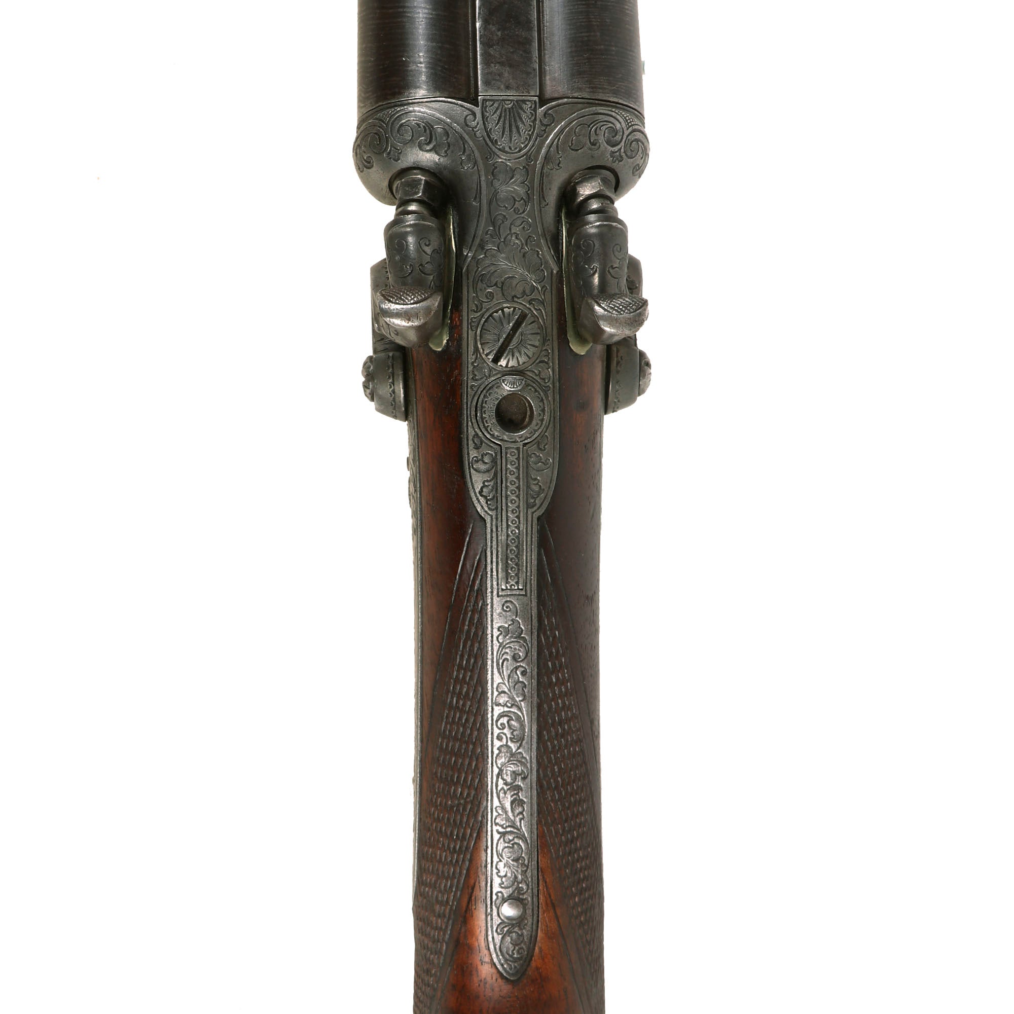 Original Item: Only One Available. Here we have a very upmarket German-made Double Barreled Hammer shotgun manufactured by W.L. Würfflein in Kitzingen, as is inlaid in silver on top of the barrels. It features ornate designs embossed and engraved on virtually the entire frame / receiver area. There is lots of foliate work, with game animals shown on both sides: fowl being eaten by a fox, and another hunted by a dog, and a buck & doe on the right side. The decoration extends onto both the top and bottom of the receiver, with the wood stock given heavy checkering around these areas and on the forestock. The trigger guard is heavily decorated as well, with even the gorgeous retractable sight being given some engraving.