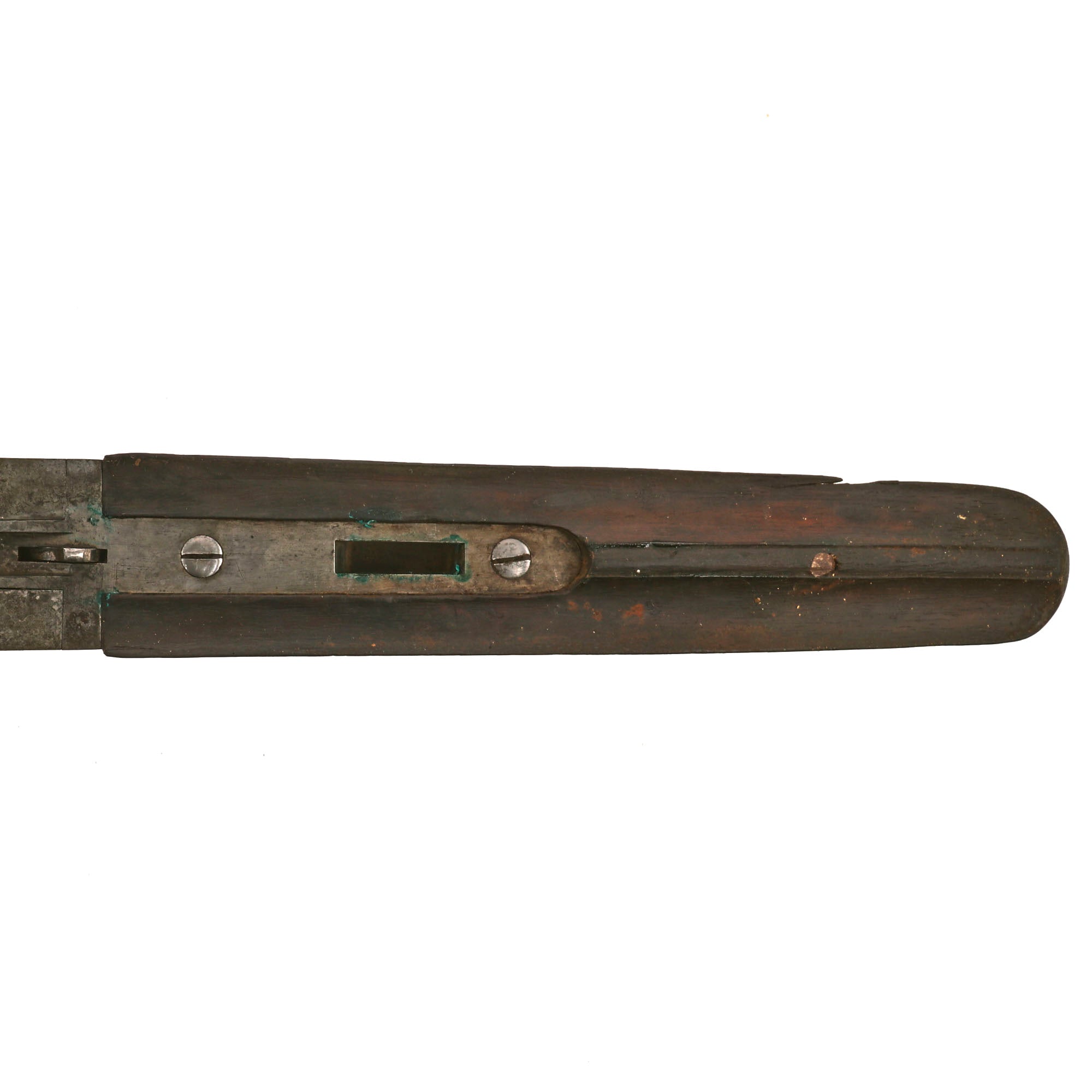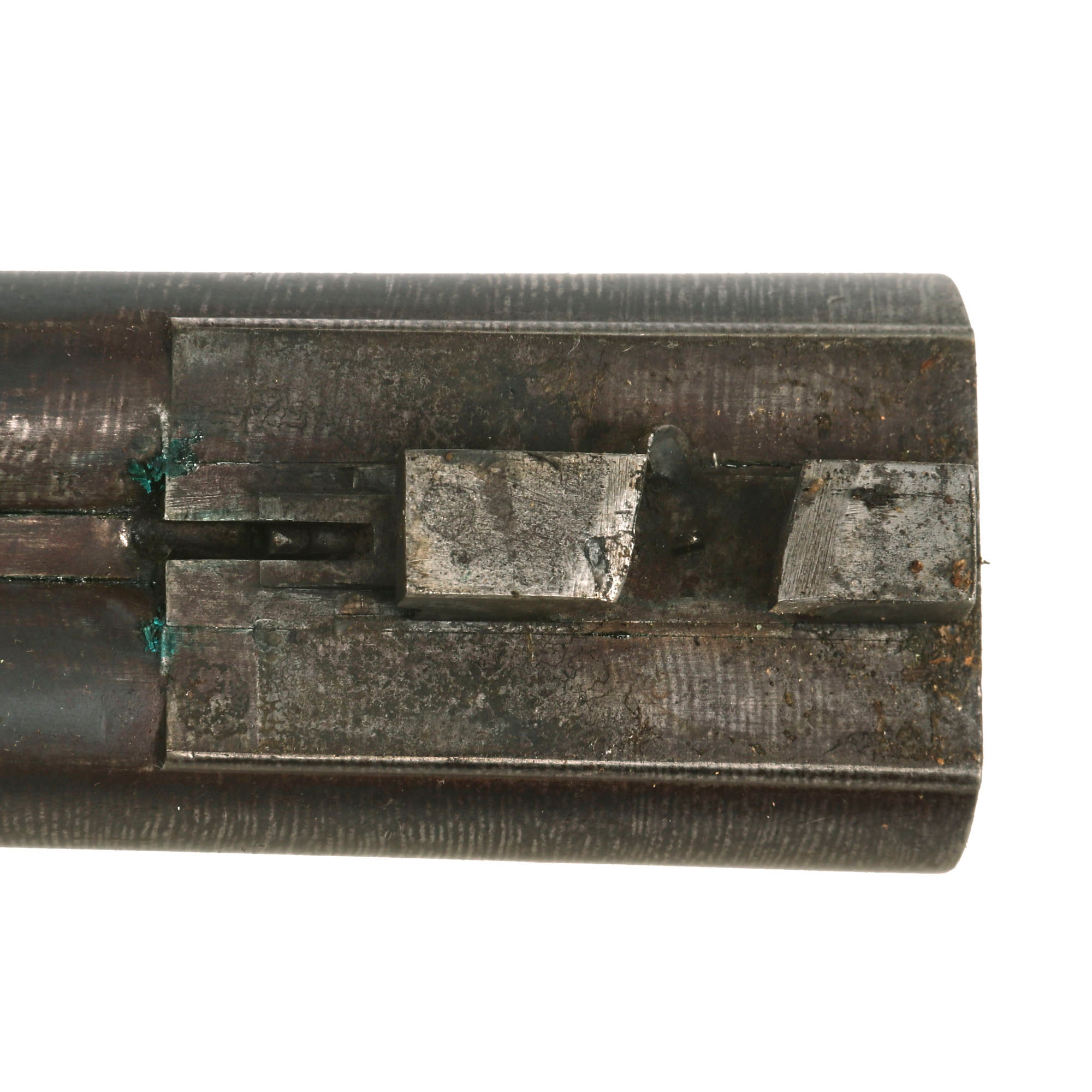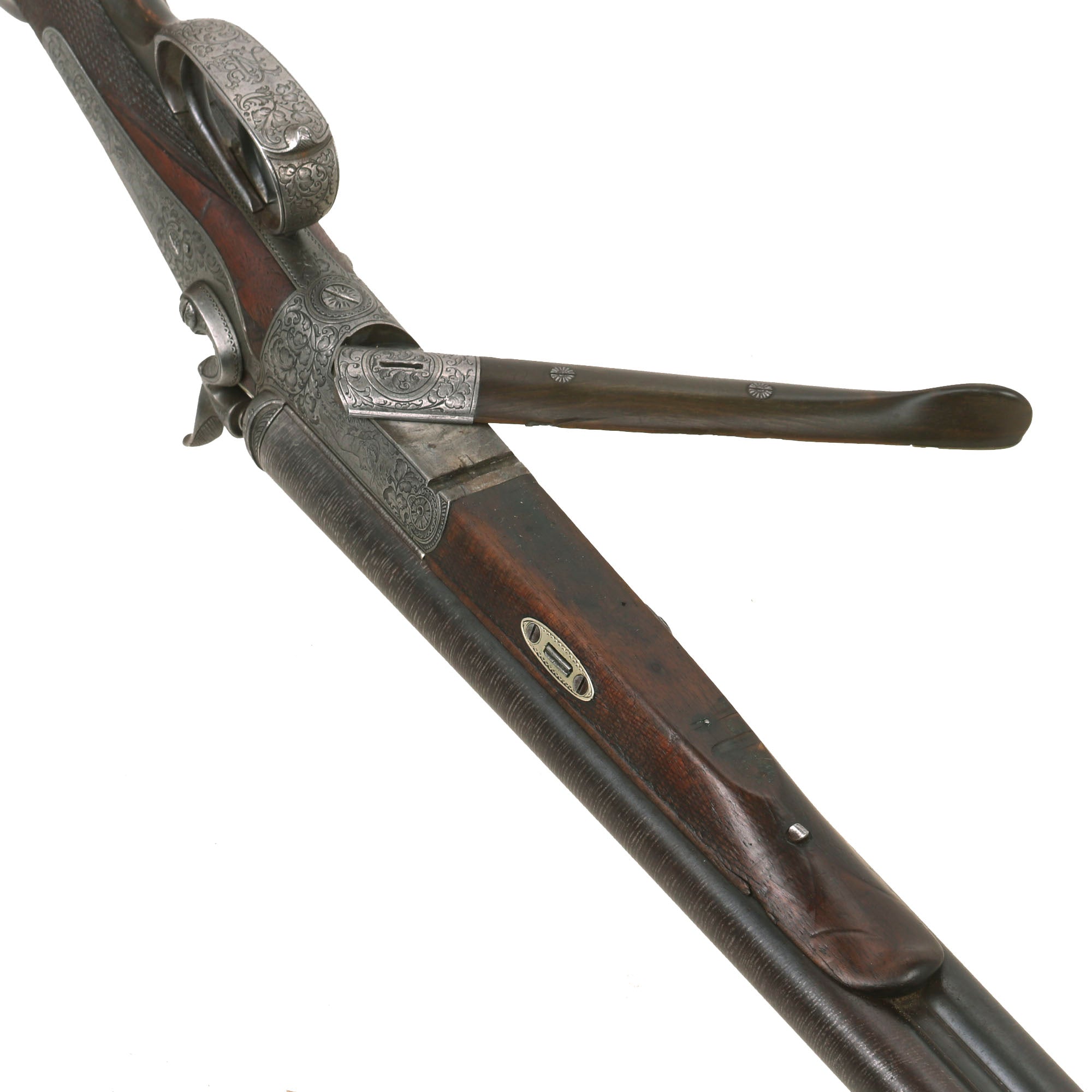 The action still functions correctly, with the breech opening and the ejector presenting, and both firing pin springs are working correctly, though they are a bit weak. The side action locks have strong main springs, and both hammers hold well at half and full cock. The breech is an earlier "bottom lever" design, very common around the world in the late 19th century. We checked the bores of the smoothbore barrels, and they are somewhat oxidized from past use, mostly toward the center.