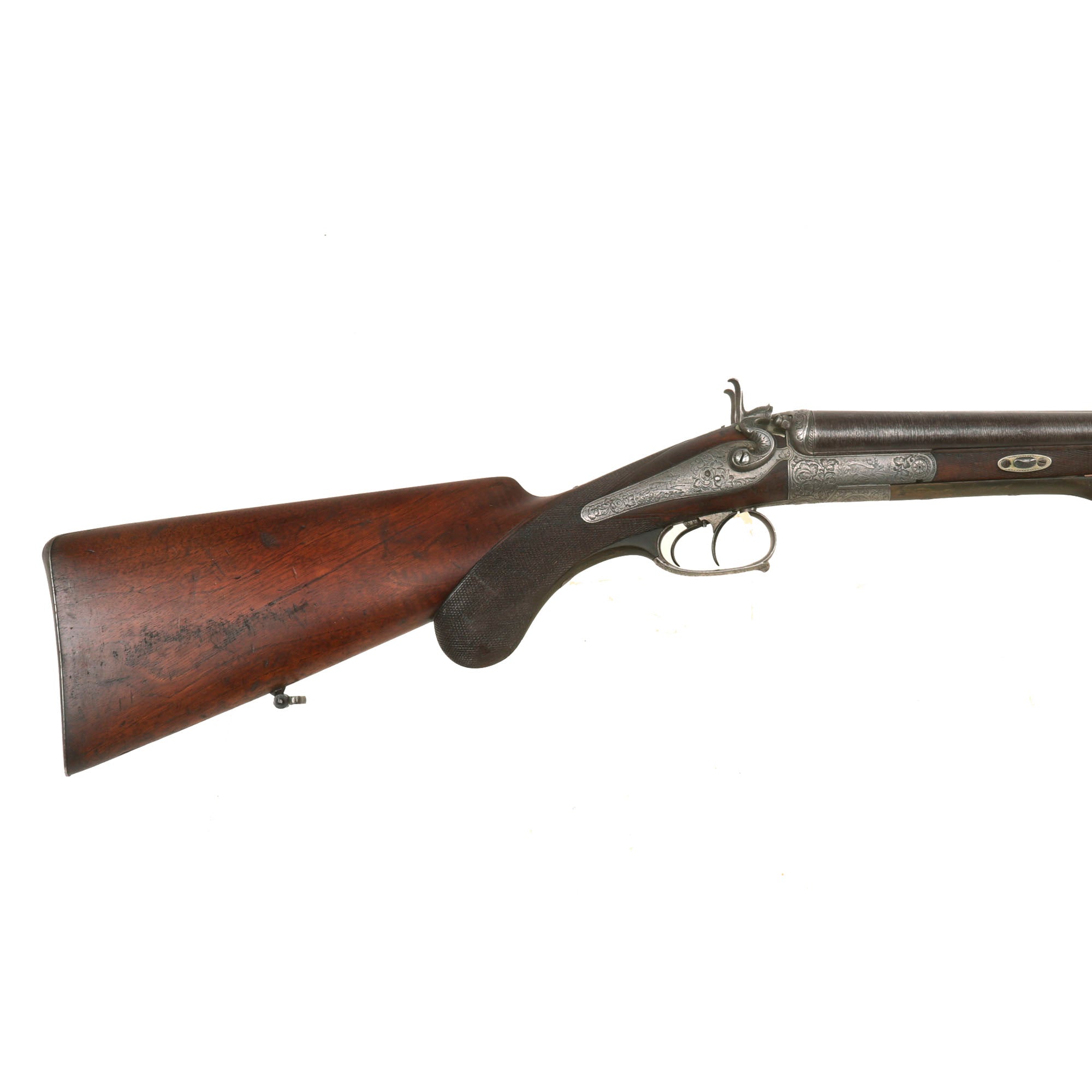 The bores have an actual bore diameter between .662” and .669”, which is correct for a 16 gauge shotgun. This lovely Double Barrel 16 gauge Hammer Shotgun presents very nicely, with a lovely patina of age, showing moderate handling and use. It is all iron mounted, and is highly decorated, as mentioned before. The butt stock has a checkered "pistol grip", with a lovely cheek piece on the left side. The tip-up lever is of horn, and is really quite lovely, showing virtually no damage besides wear. The fore stock has some lovely checkering. Originally intended for hunting and home defense, these saw a lot of use on the Frontier and were supplied to both Stage Coach Lines and Railroads.