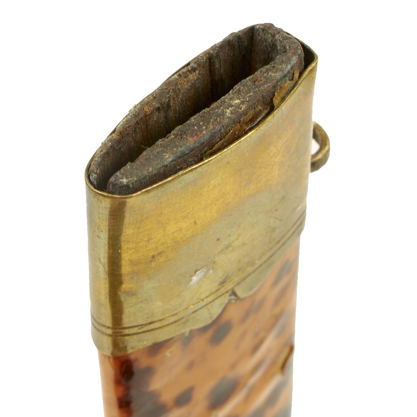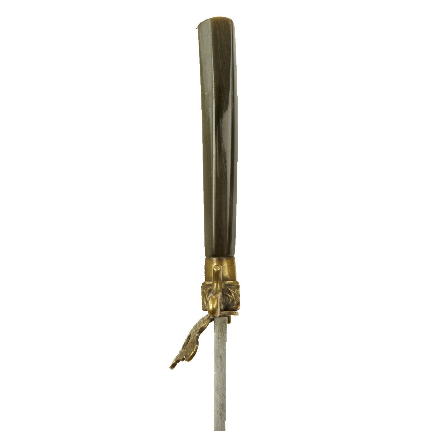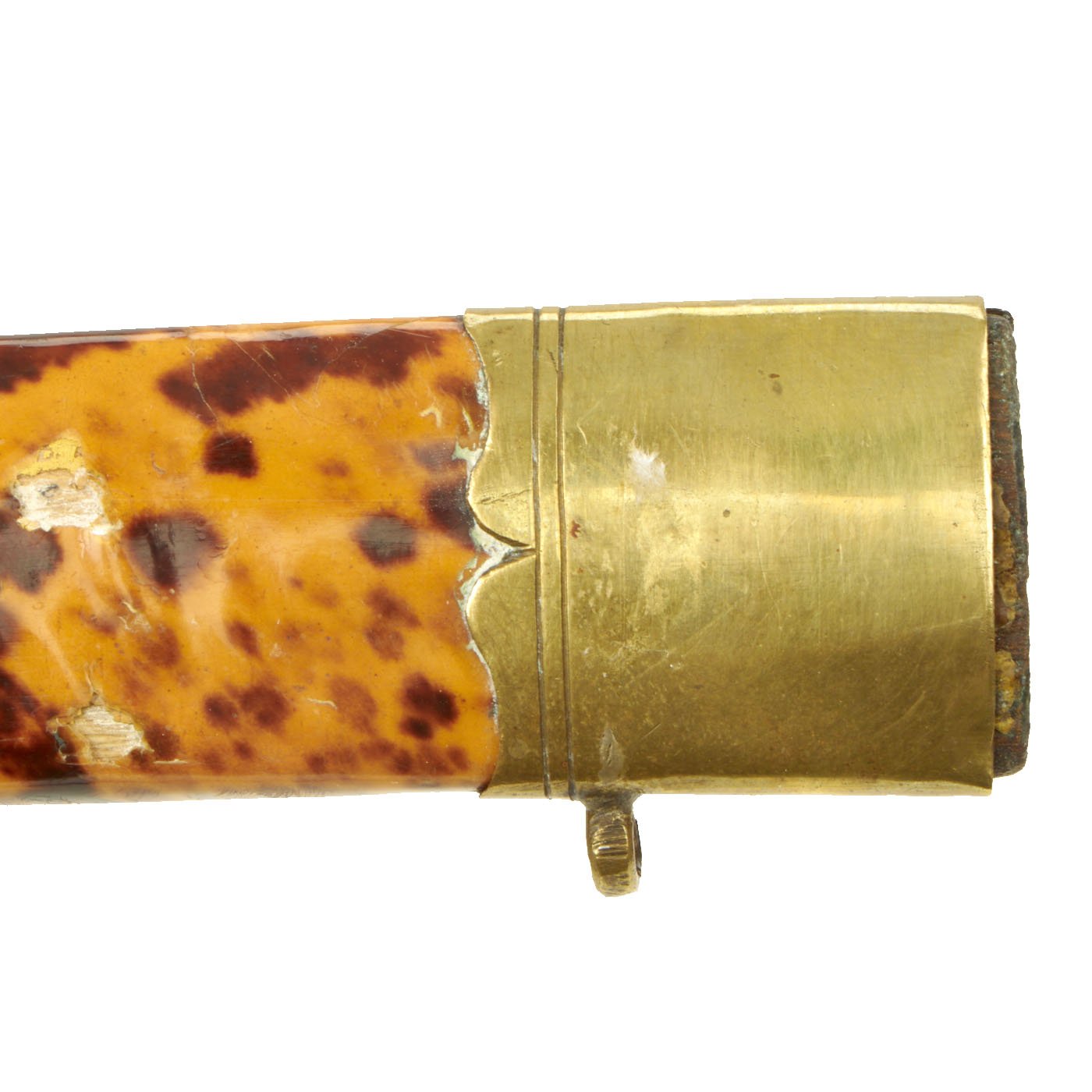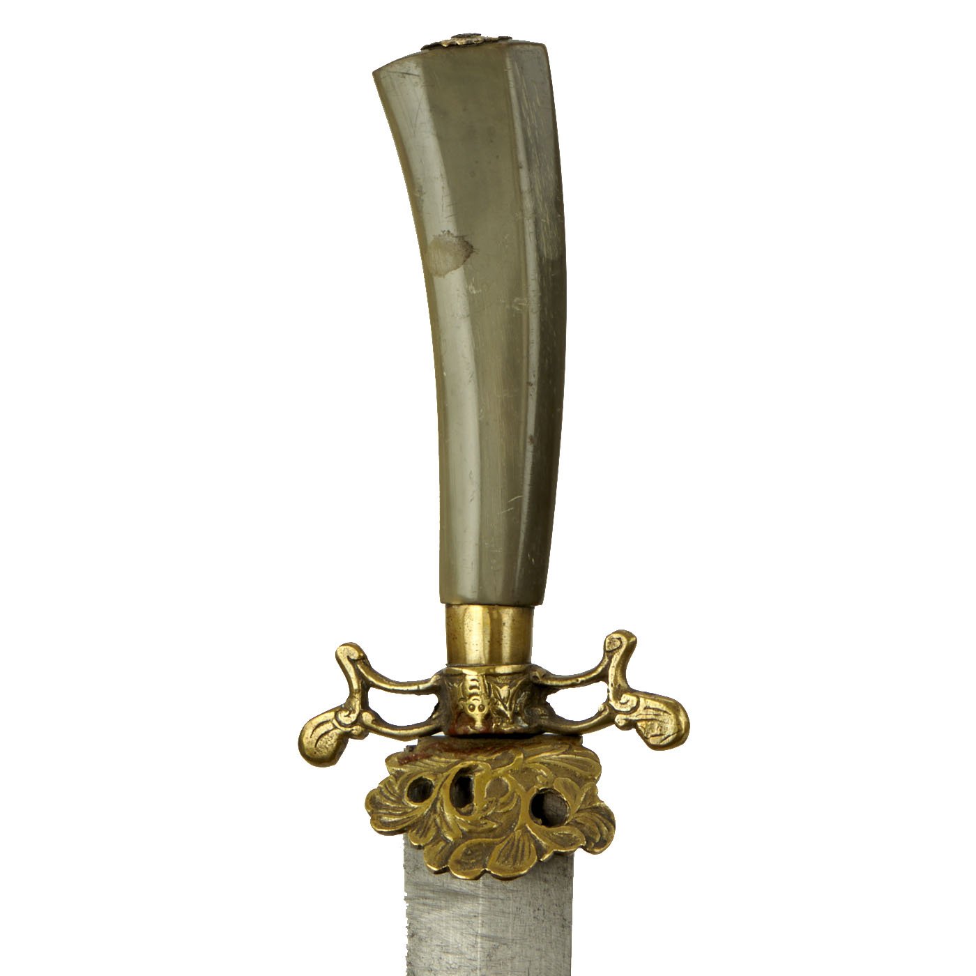 The wood scabbard is brass mounted at the top and bottom, and the body is covered in some sort of resin lacquer that gives the appearance of tortoiseshell or similar. A very elegant Hirschfänger hunting dagger dating very possibly to 1770 to 1800. In great shape and ready to display!