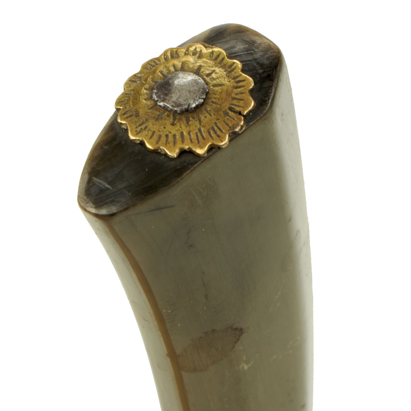 This is a great 18th Century German Hirschfänger, with a lovely decorated scabbard. Definitely an upmarket example for someone of prominence. It features a curved blade of 16", with a very elegant polished horn grip, and measures 20" in overall length. The shell cross guard is made from intricately worked brass, with lovely designs.