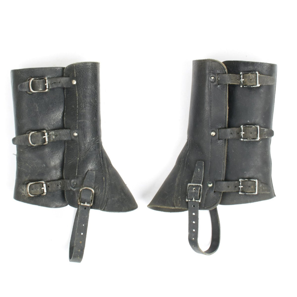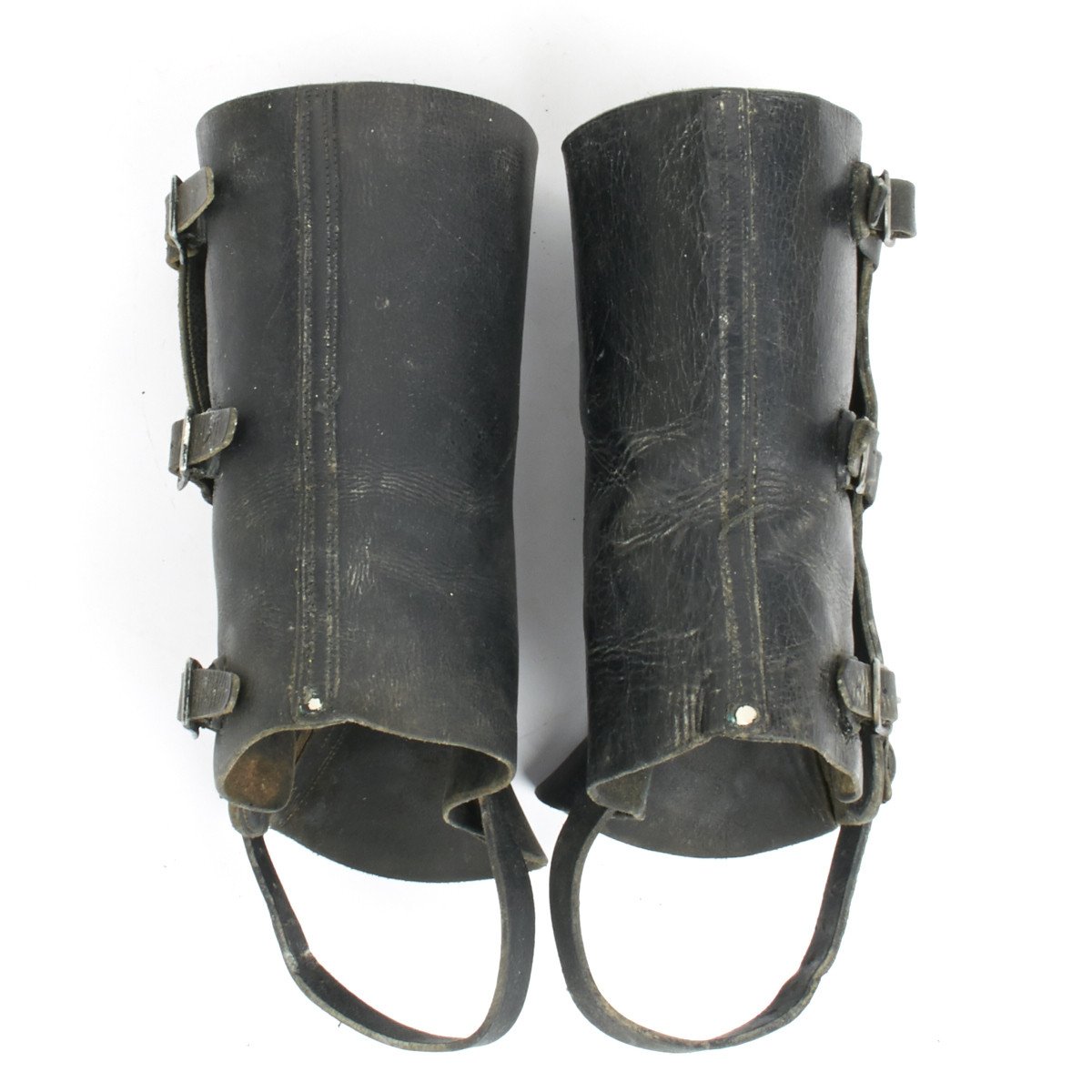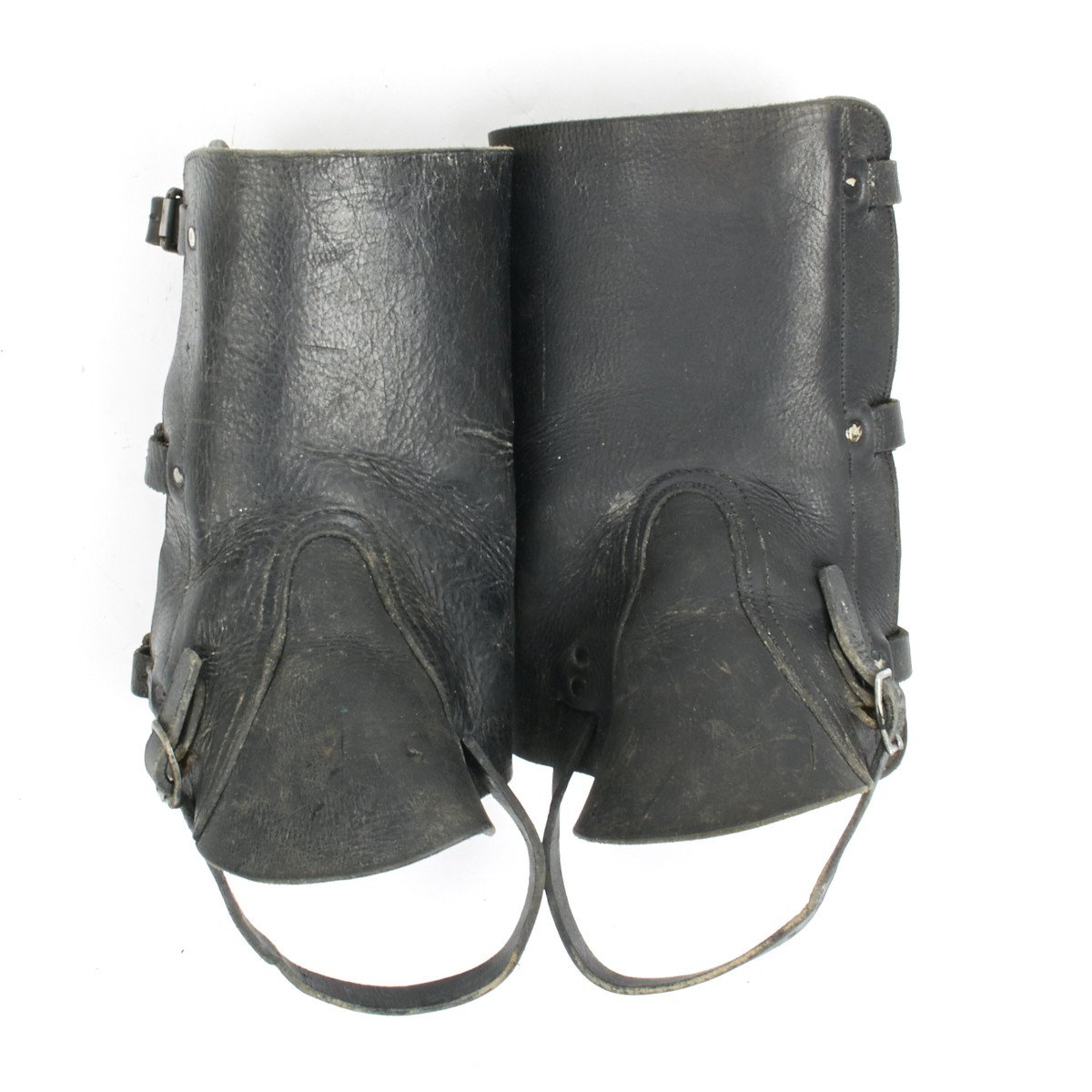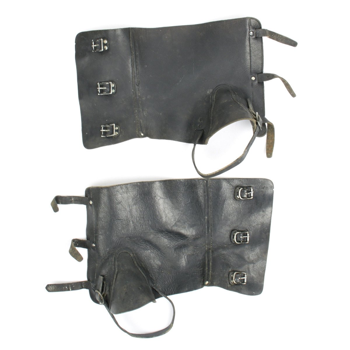 Offered in Pairs complete with all buckles (4) and straps, quality black leather German/Italian/Austrian leggings from the 1930s and used up into WW2. Each bears a manufacture marking and/or code, but markings tend to be quite faint.