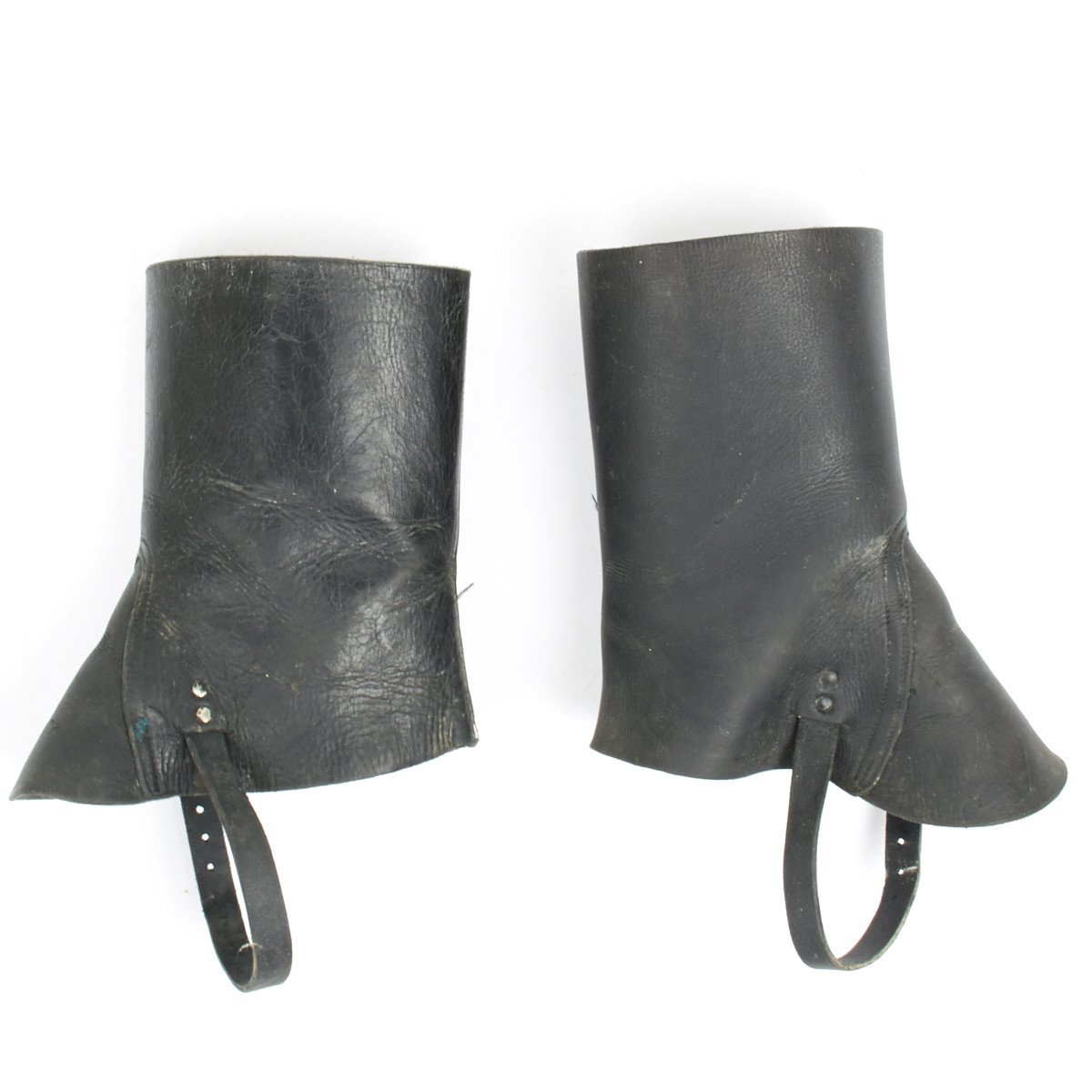 Original Item: In World War One officer's tended to wear leather knee boots while other ranks wore the much cheaper ankle boots. Conditions were such that the lower leg (calf) still needed added protection so the British had introduced "Puttees" which in effect was a large bandage that wrapped from just below the knee to the ankle hence protecting the trousers from mud and wear. Unable to afford knee boots for Other Ranks Germany/Italy/Austrian introduced tall black leather gaiters for "Special Units" that secured under the boot and covered the top of the foot and ascended 8" up the leg secured by three buckles with straps. Nicely made with quality leather and stitching these have the same "dash" as the white equivalent used by Scottish Regimental Pipers.