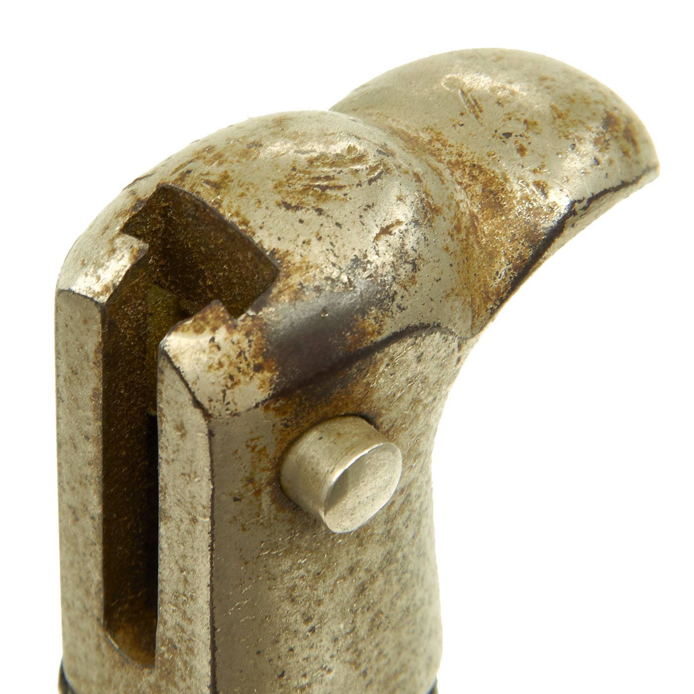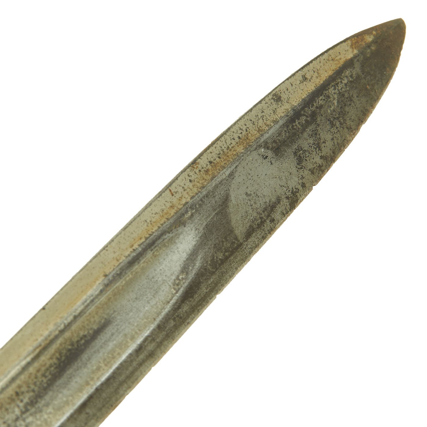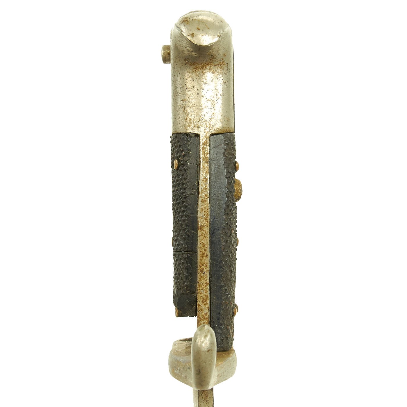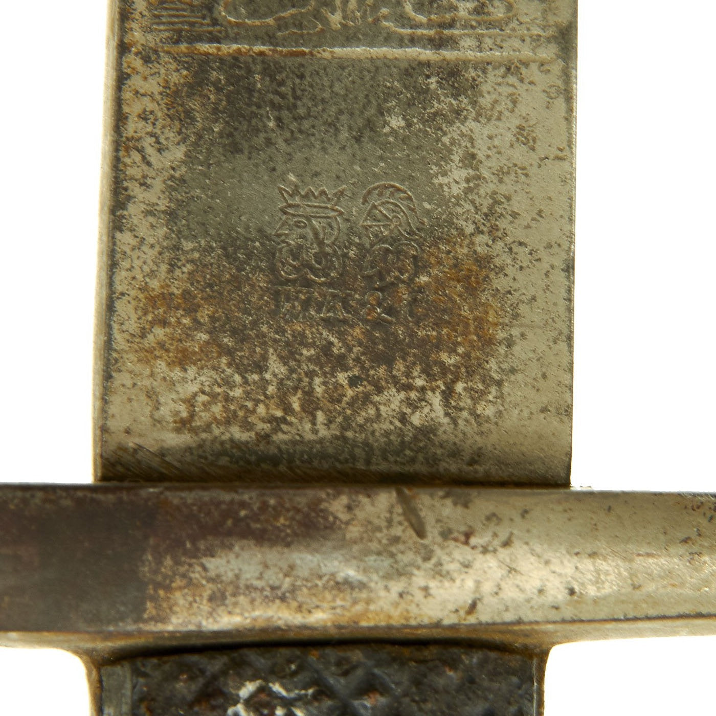 This is complete however it has seen better days and the original bright Nickel finish has worn and oxidized to be very dull. The blade is marked on the ricasso with the double trademark "King's Helmet" (Ritter-helm) alongside a "Kings's Head" (königskopf) logo of legendary German maker Weyersberg Kirschbaum & Cie of Solingen, over the firms initials of W.K & C.. This trademark is used on privately purchased blades in the late 19th and early 20th centuries, and is absolutely correct for this bayonet. For more information please see J. Anthony Carter’s work GERMAN KNIFE AND SWORD MAKERS.
