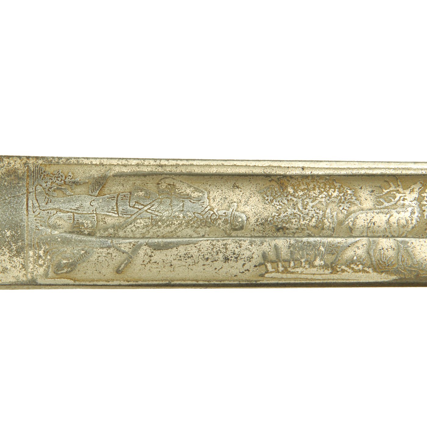 The etching on the blade is still very evident and features Stands of Arms and Hunting scenes. The checkered hard leather black grip is damaged on the front left side only, with about 1/4" missing to the front.