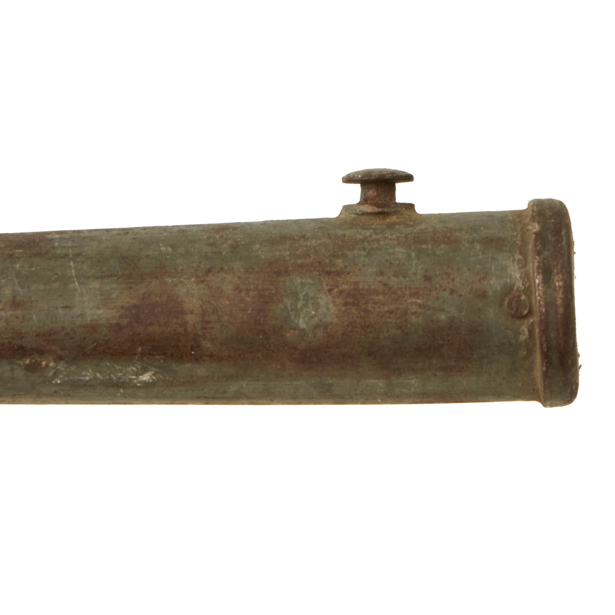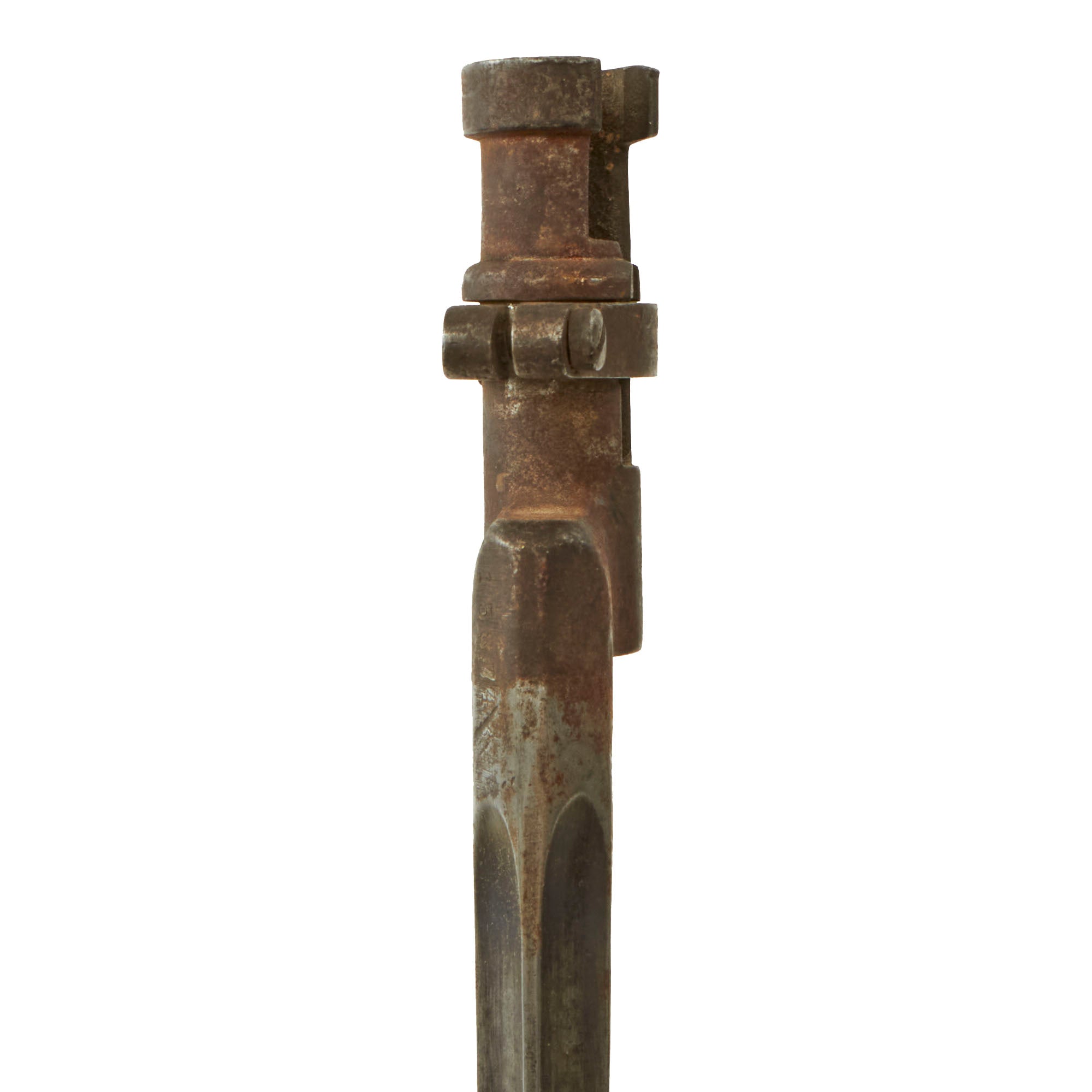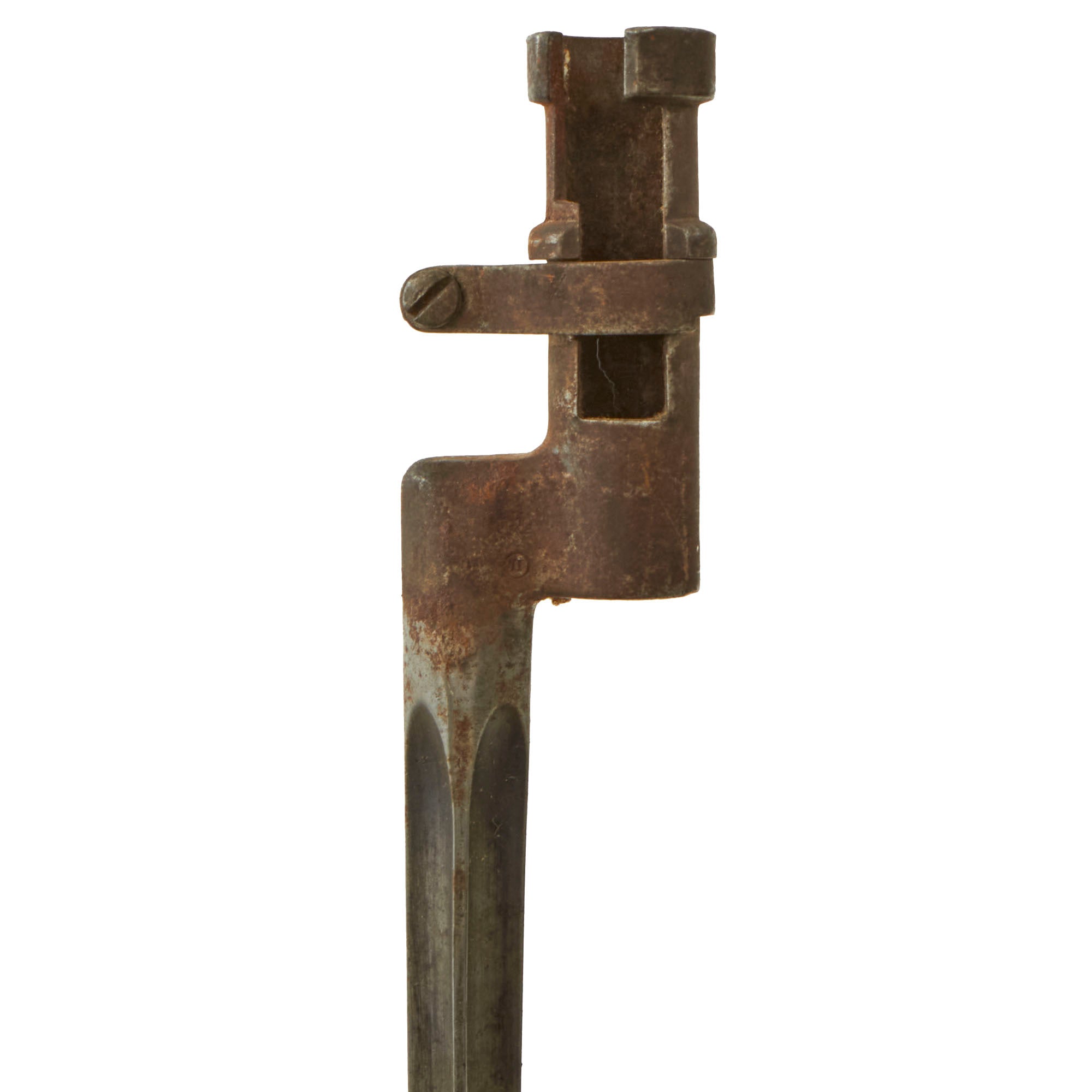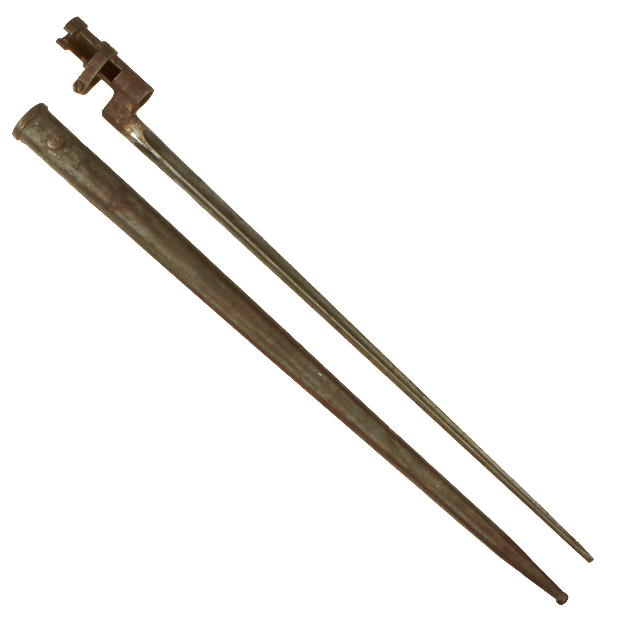 Original Item: Only One Available. This is very unusual, this is a rather decrepit but totally original Imperial Russian 1891 Mosin Nagant socket bayonet complete with its locking ring in frankly little better than barn find condition showing rust and wear contained in a really Nice German WWI Ersatz bayonet scabbard especially made for this model of socket bayonet. The Russian bayonets, M-1891 are rare in their own right, but the German made all steel circular Ersatz socket Scabbard is exceptionally difficult to find.