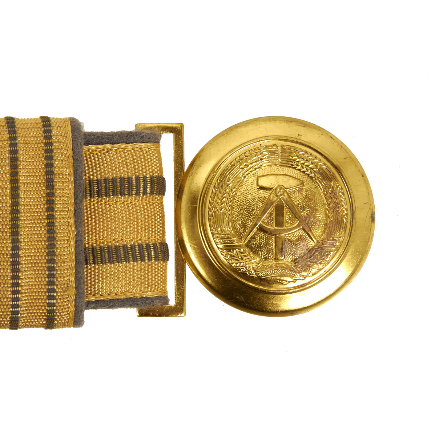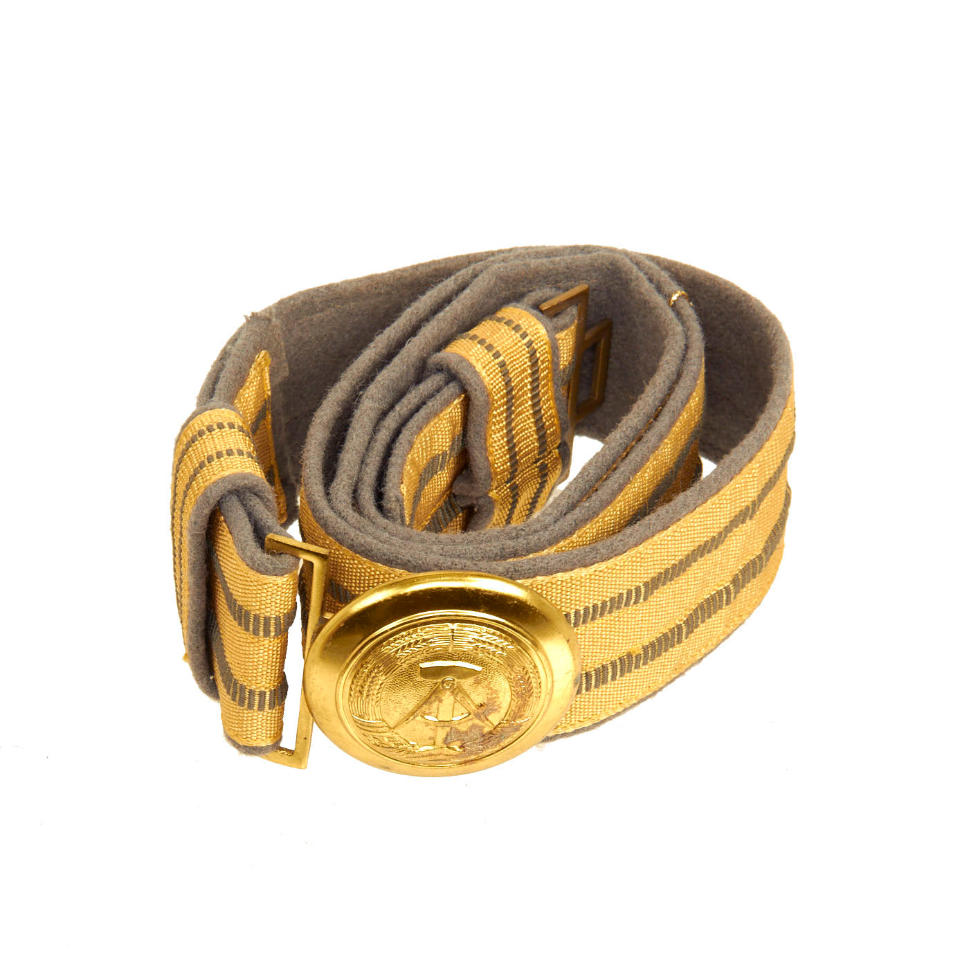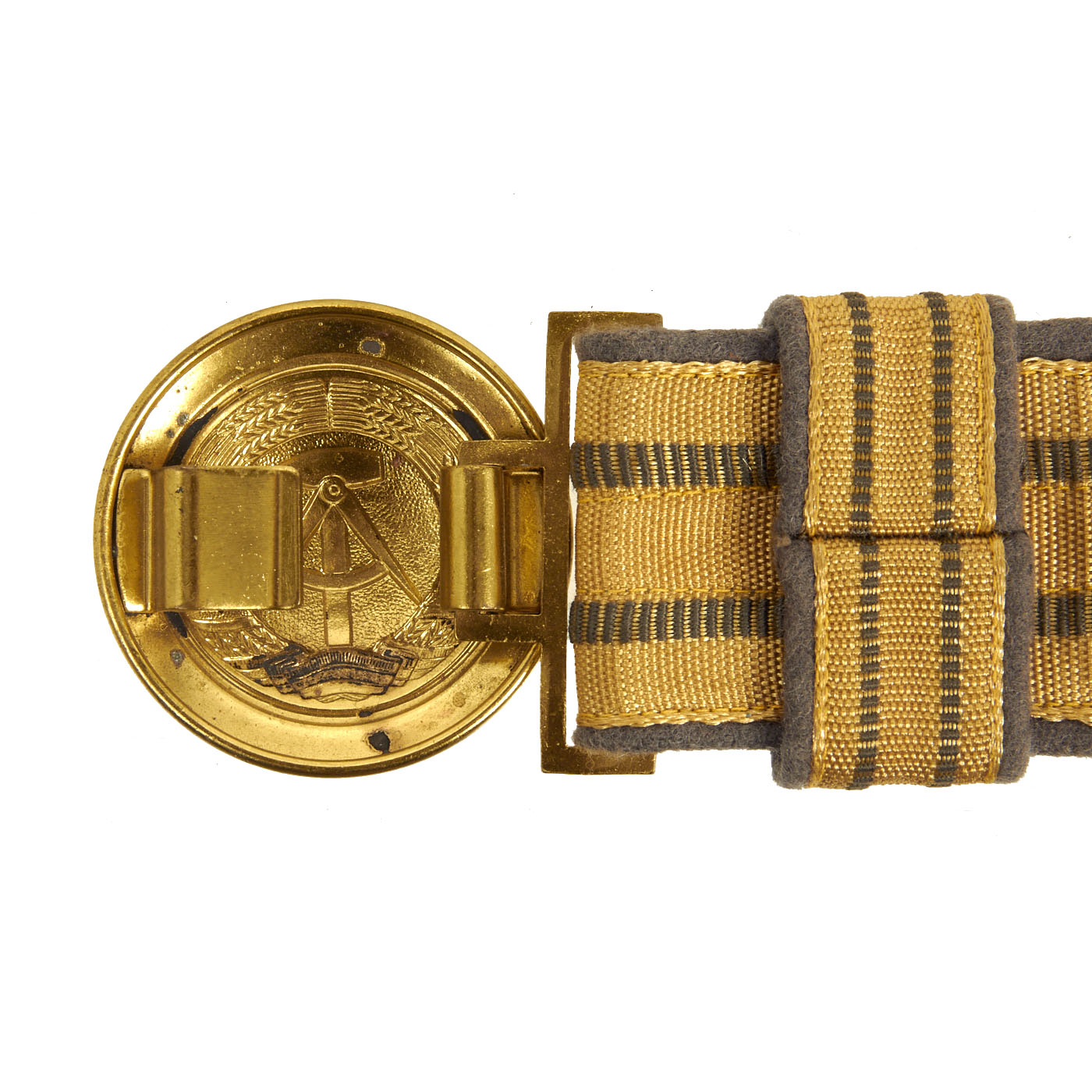 The belt is a die struck/stamped, aluminum alloy based construction that has been gold washed. It depicts the national emblem of East Germany on a pebbled background which features a hammer and a compass, surrounded by a ring of rye. It was an example of what has been called "socialist heraldry". It was the only heraldic device of a European socialist state with a ring of grain which does not contain a red star. The buckle is attached by a double square ring to a long quality woven bright gold and gray construction brocade belt. The belt pattern has two horizontal gray lines, and the two sliding vertical loops have the same pattern.