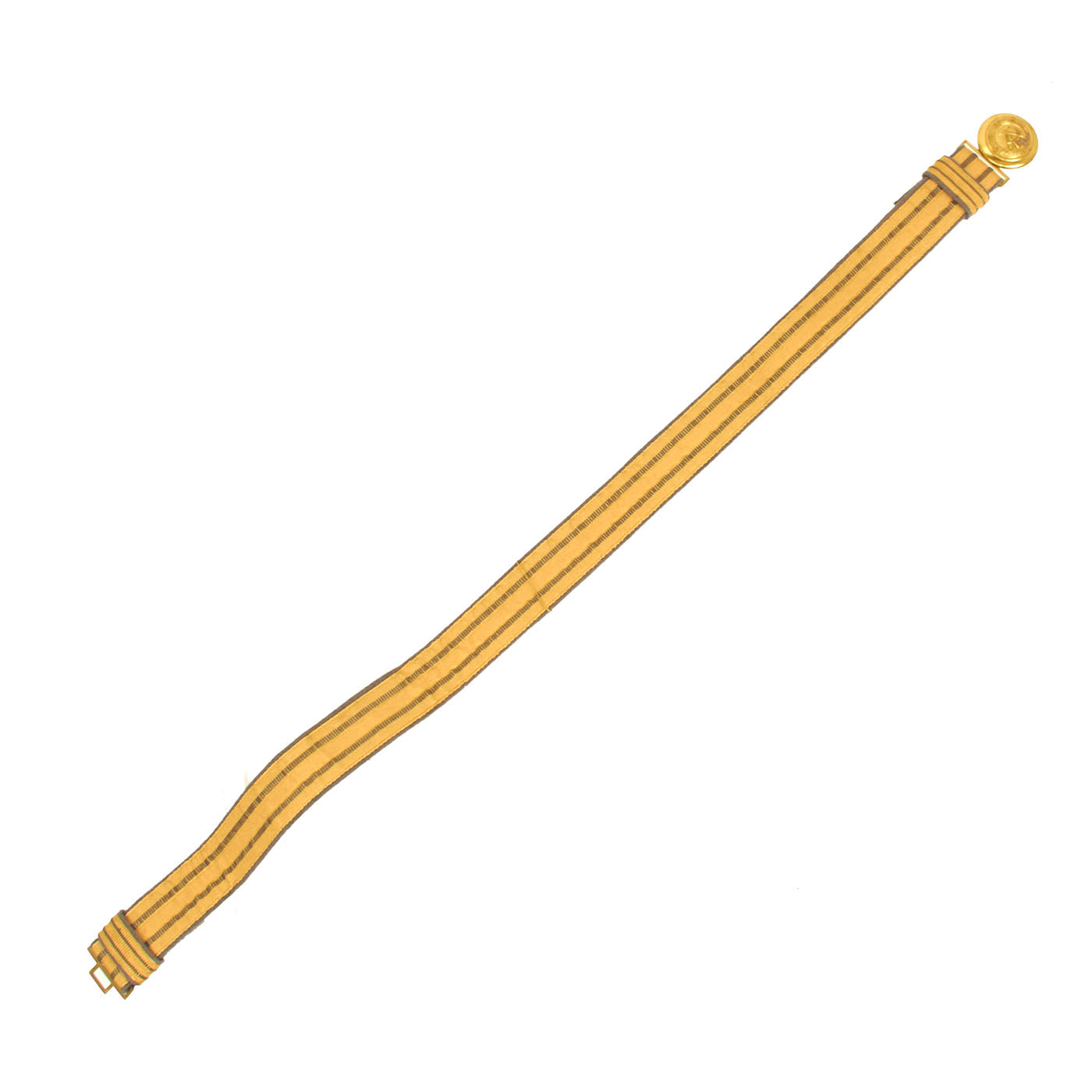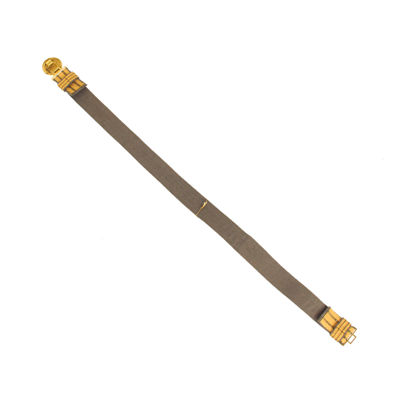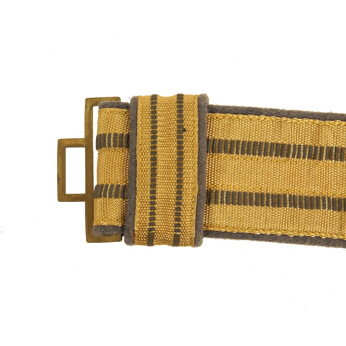 The belt is a die struck/stamped, aluminum alloy based construction that has been gold washed. It depicts the national emblem of East Germany on a pebbled background which features a hammer and a compass, surrounded by a ring of rye. It was an example of what has been called "socialist heraldry". It was the only heraldic device of a European socialist state with a ring of grain which does not contain a red star. The buckle is attached by a double square ring to a long quality woven bright gold and gray construction brocade belt. The belt pattern has two horizontal gray lines, and the two sliding vertical loops have the same pattern.