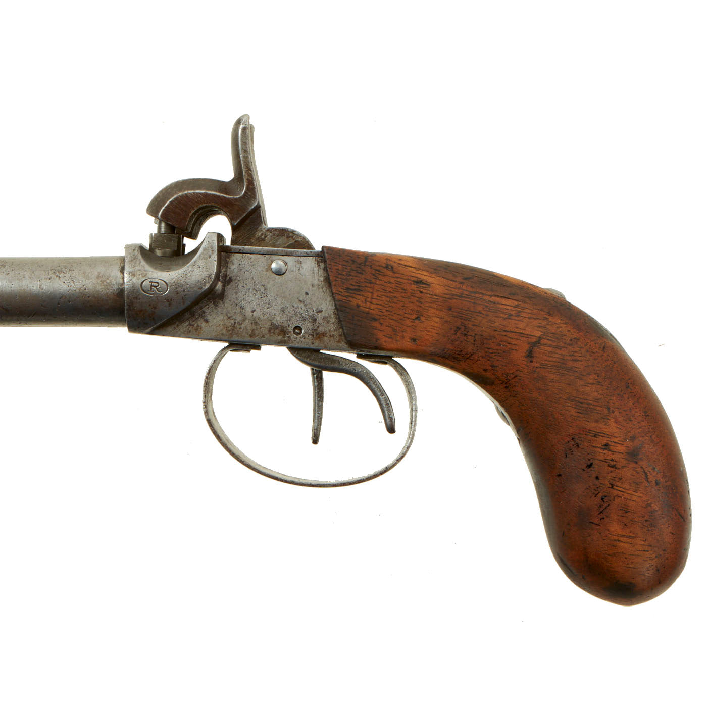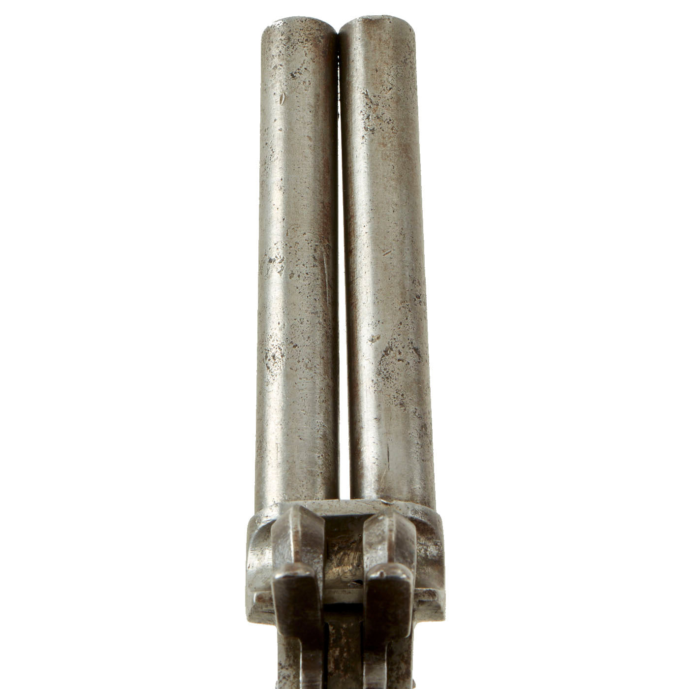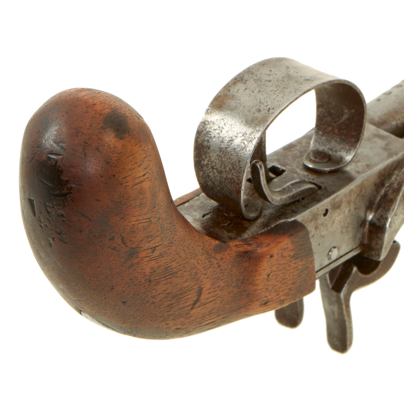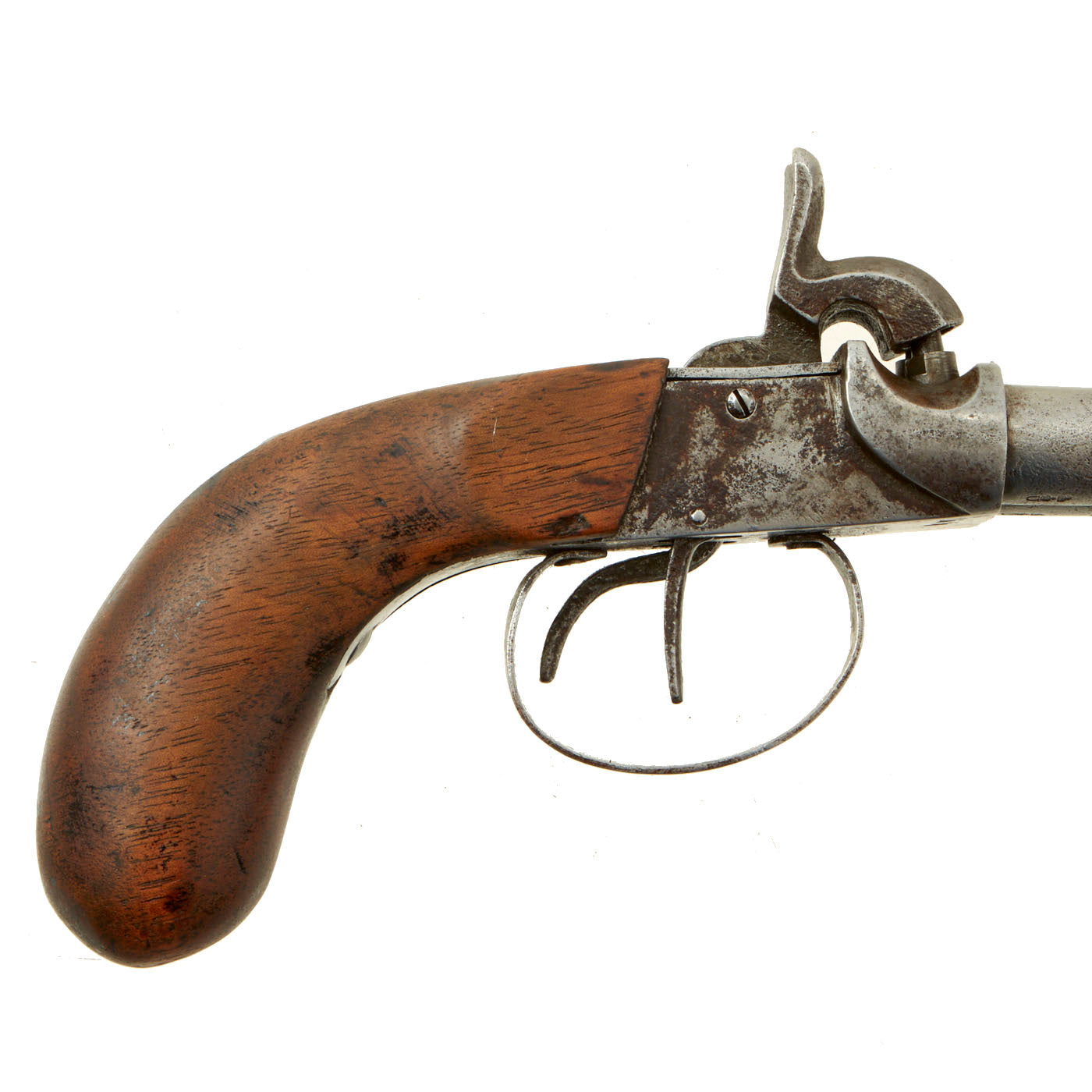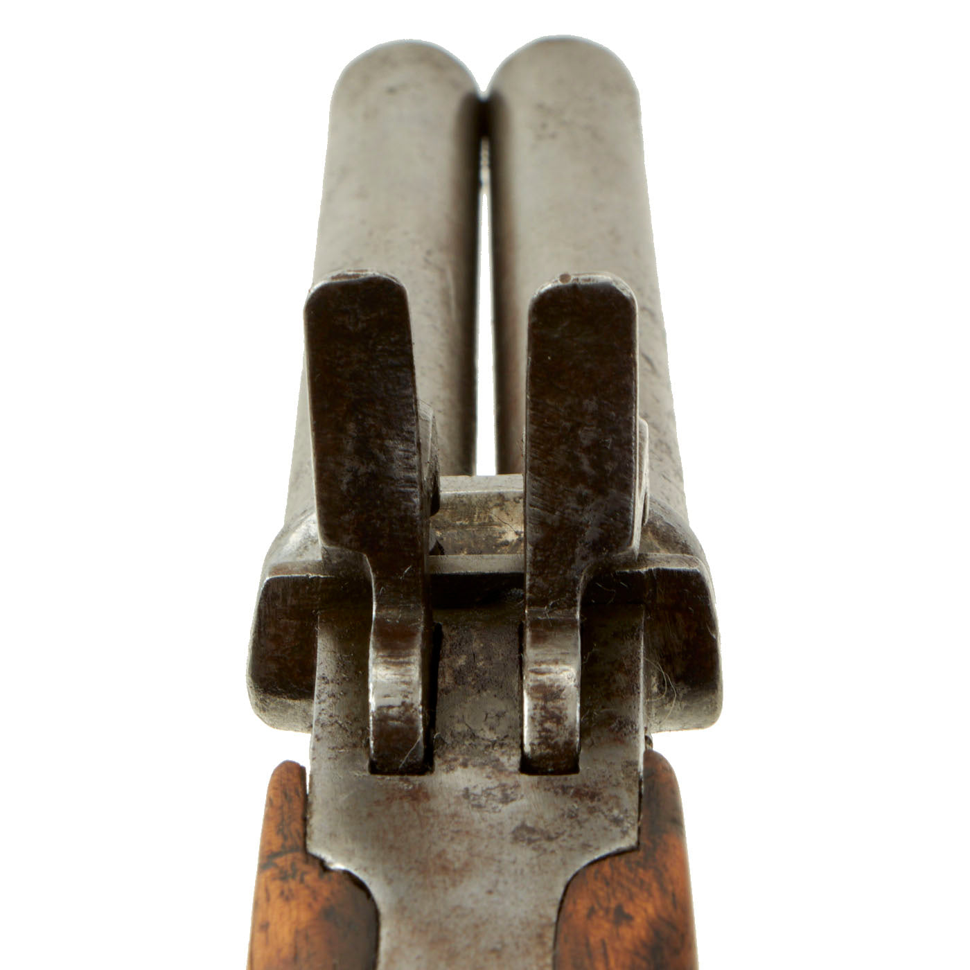 Original Item: Only One Available. Here we have a very nice German made unmarked Double Barreled percussion pistol in approximately .43" caliber. It features twin smoothbore barrels of 4" in length with an overall measurement of 8". It is built around a box lock with two exposed percussion hammers and two triggers protected by an iron trigger guard. The left trigger is bent backwards so that the two barrels can easily be independently fired.