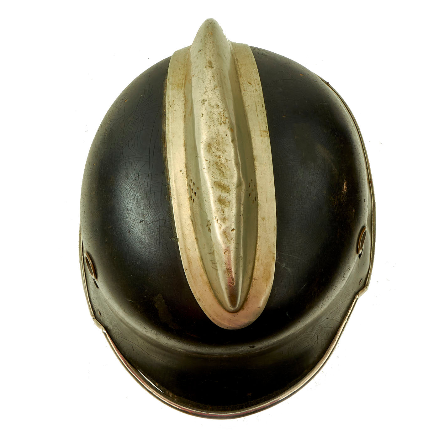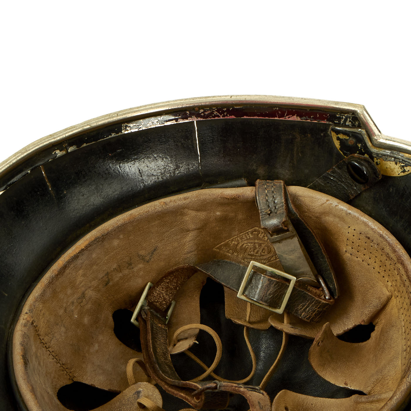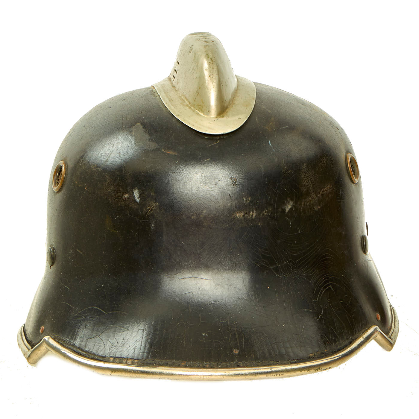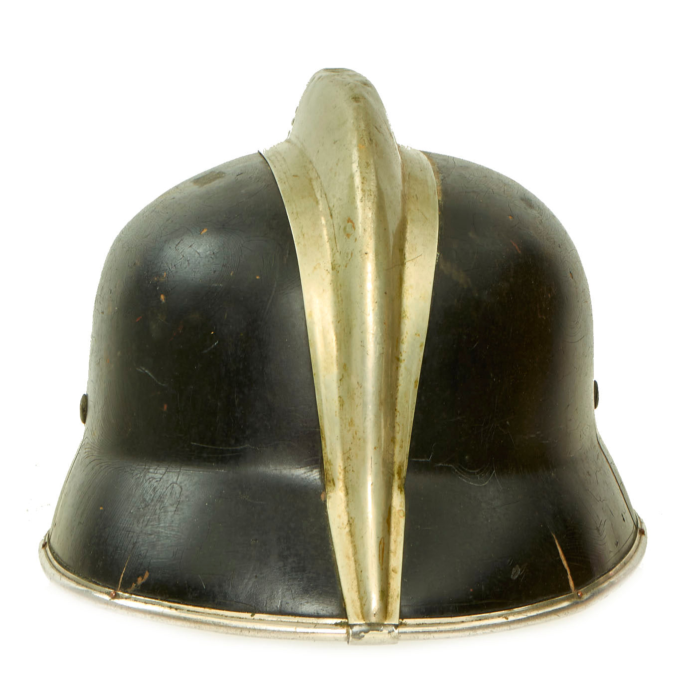 This is a rare example that has survived the decades without being severely damaged or destroyed, and it also definitely looks to be an upmarket version, with a "German Silver" top comb, as well as trim around the entire bottom. We assume this would be for an officer or higher ranker member of the fire brigade. There are no insignia that we can see to indicate where it was put into service.