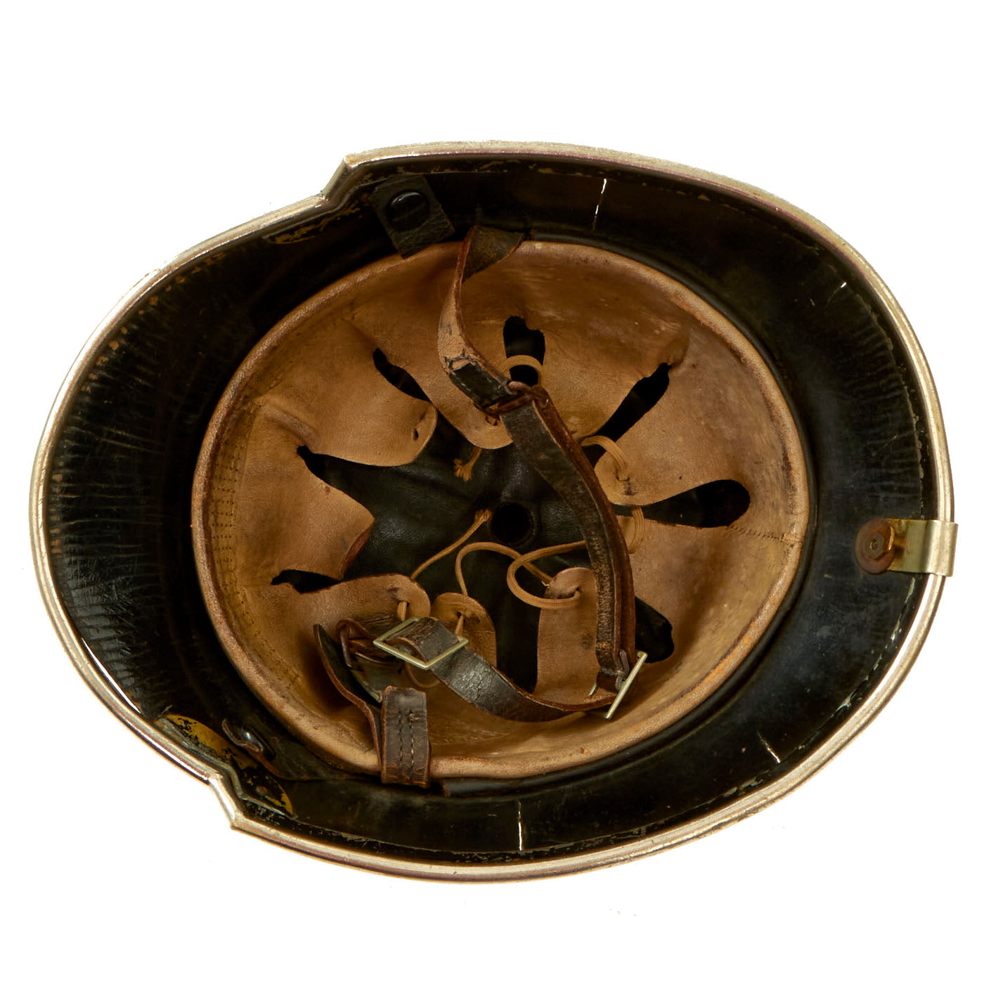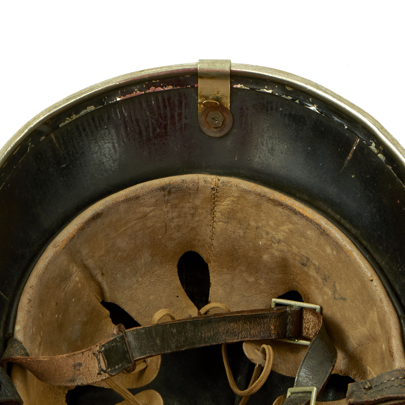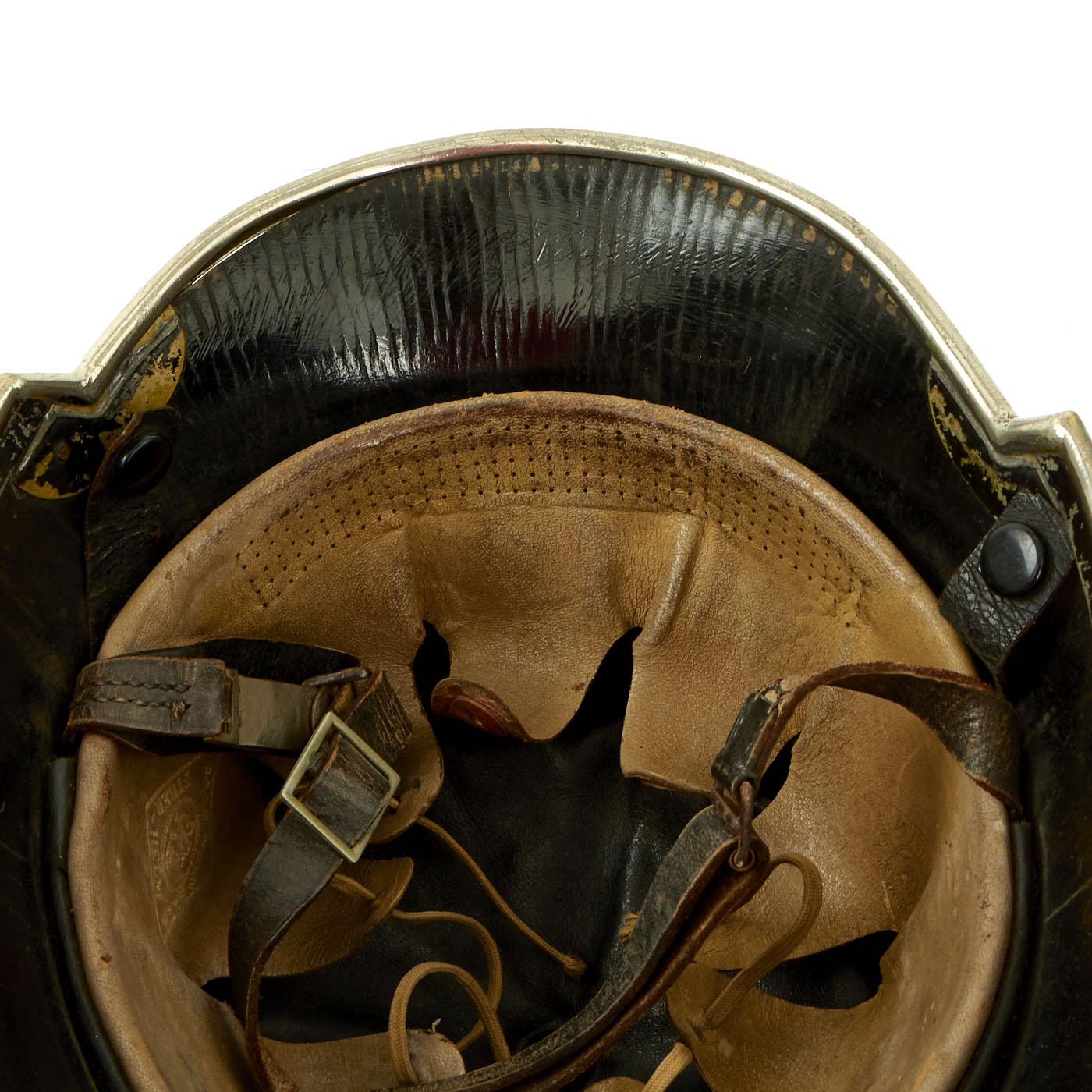 The interior still retains a complete leather liner, with an intact leather top pad and top securing string. It has the correct 5 rows of vent holes on the front, and is secured in place by 5 rivet pins around the circumference of the helmet. The leather chinstrap is still present and in very good condition, with a functional clip hook, and there are also the two straps with snaps in front for attachment of a leather neck shield. The rear of the shield would attach to the small fitting on the inside rear skirt of the helmet.