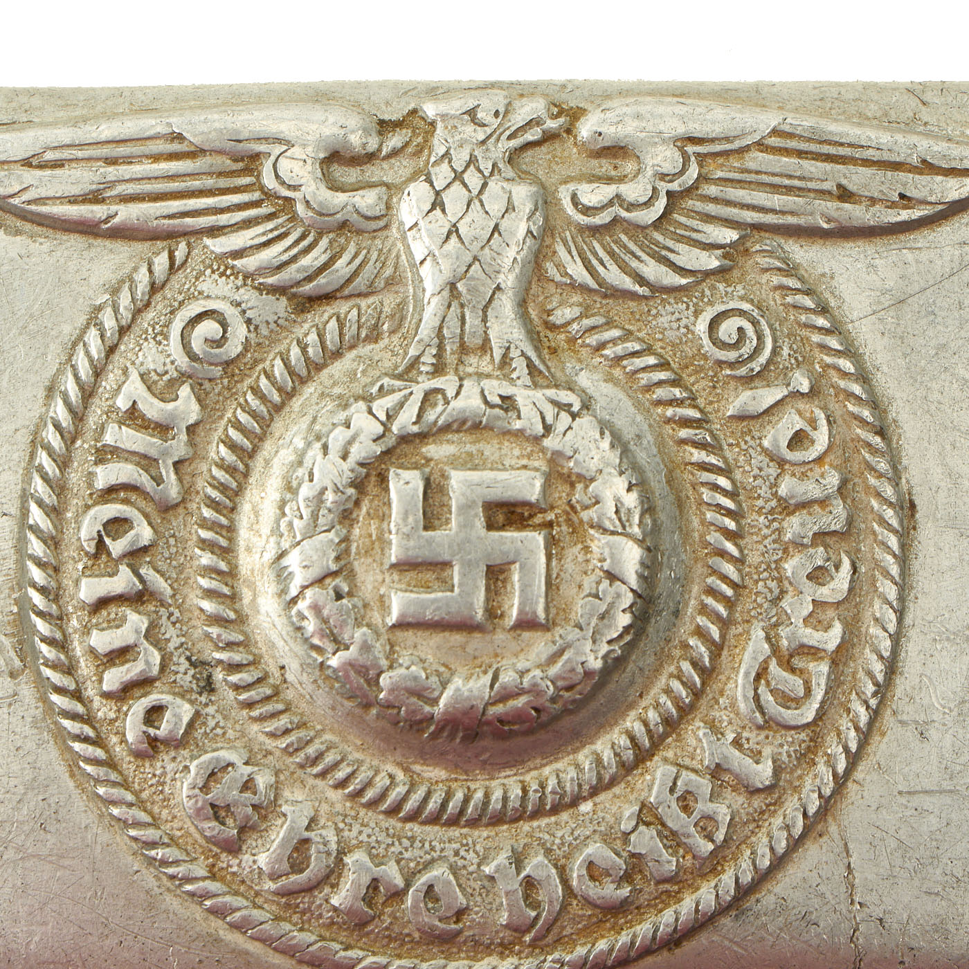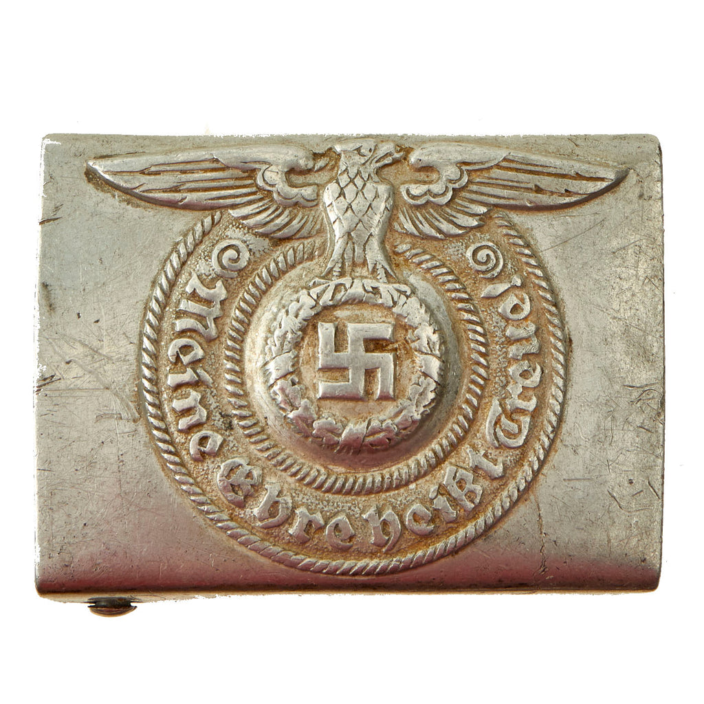 Box belt buckle features a smooth, outer field with a high relief, embossed, central motif pattern consisting of an SS style national eagle with out-stretched wings, clutching a wreath, encompassing a static swas. The swas and wreath are in turn encompassed by a circular, simulated, twisted rope border with the Gothic script motto, Meine Ehre heißt Treue!, (My Honor is Loyalty!). The script is situated on a subtly textured background field and is encircled by the inner and the outer simulated twisted rope borders. The reverse of the buckle is a mirror image of the obverse and the cast buckle catch, prong bar and prongs are all intact. We have checked it with a magnet, and no part of this buckle is magnetic.
