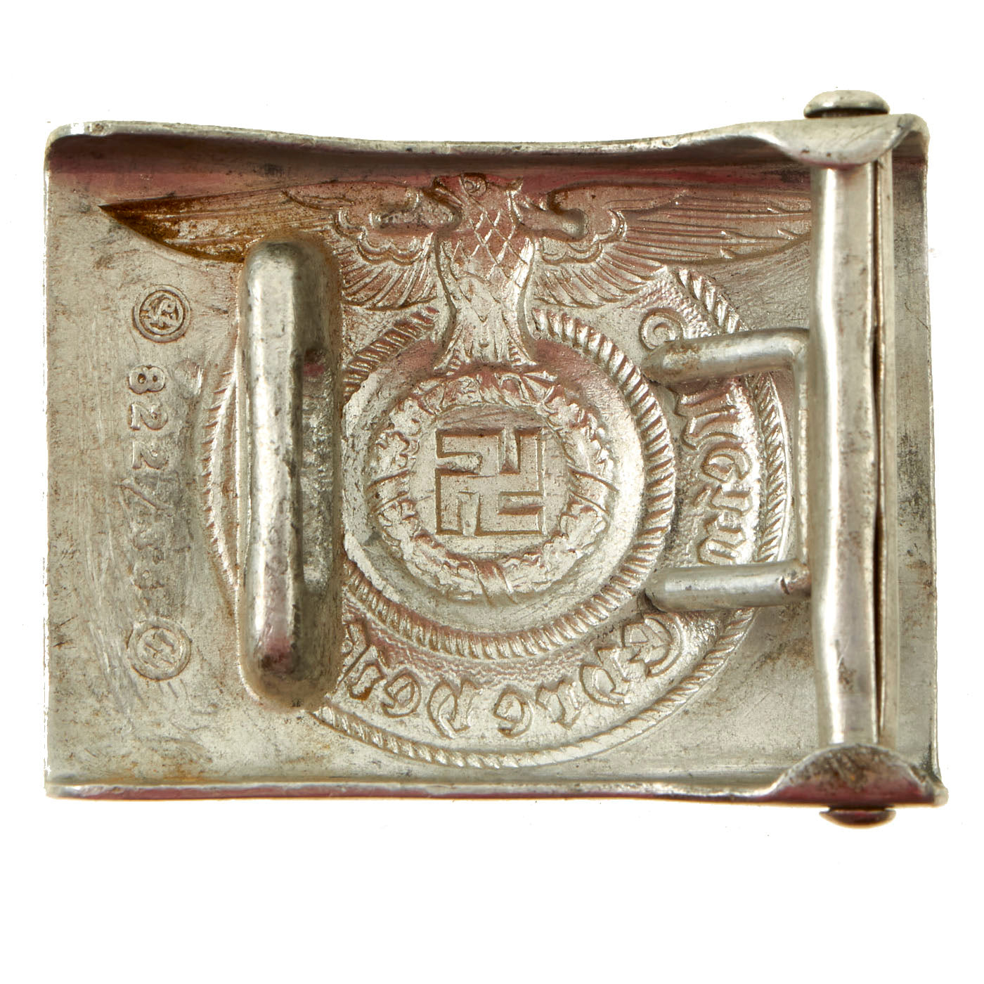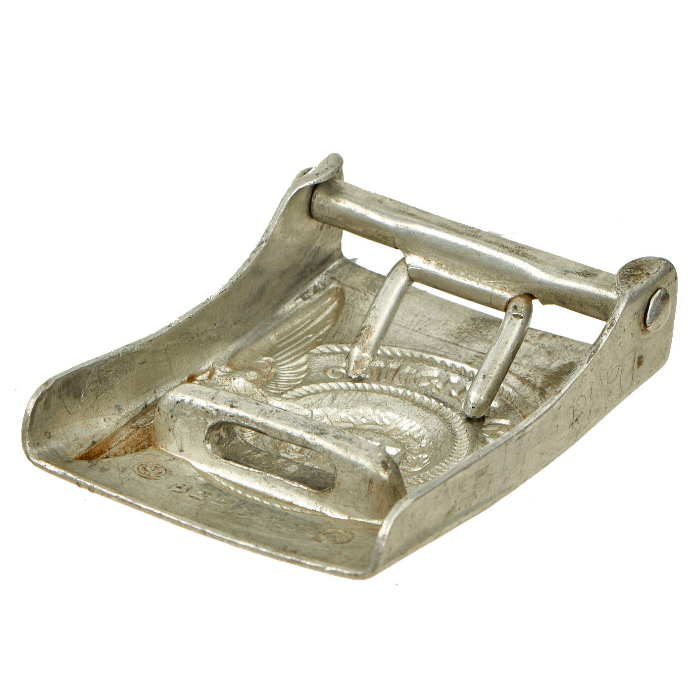 This Aluminum SS buckle (Koppelschloß) is offered in very good condition, with moderate wear from service. The reverse of the buckle is marked (RZM) 822/38 (ᛋᛋ). indicating 1938 manufacture. There is a bit of wear on the markings from the attachment clip on the other end of the belt. There are unfortunately no accurate records of the SS RZM contractors, but some suggest that 822 is Richard Sieper & Söhne of Ludenscheid.