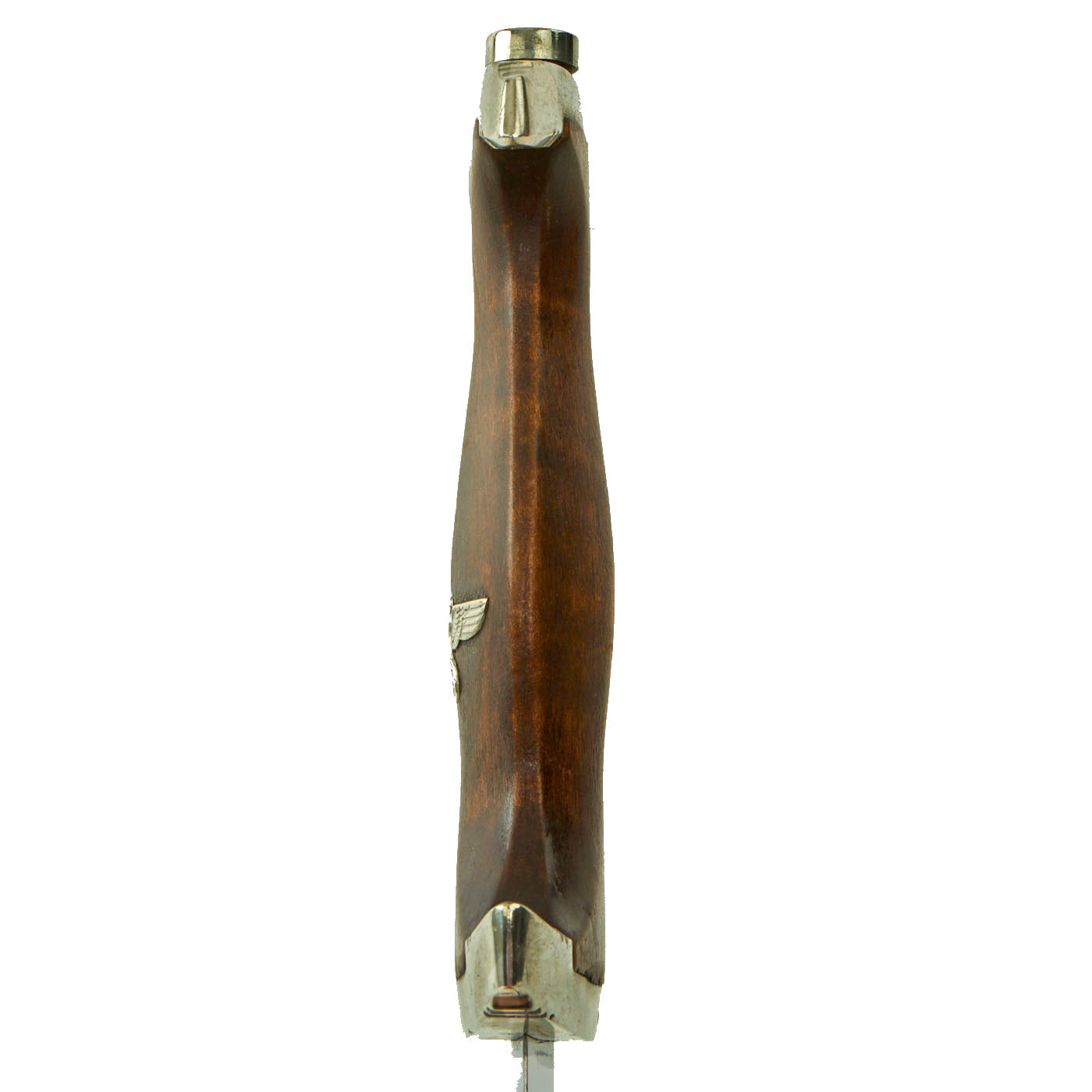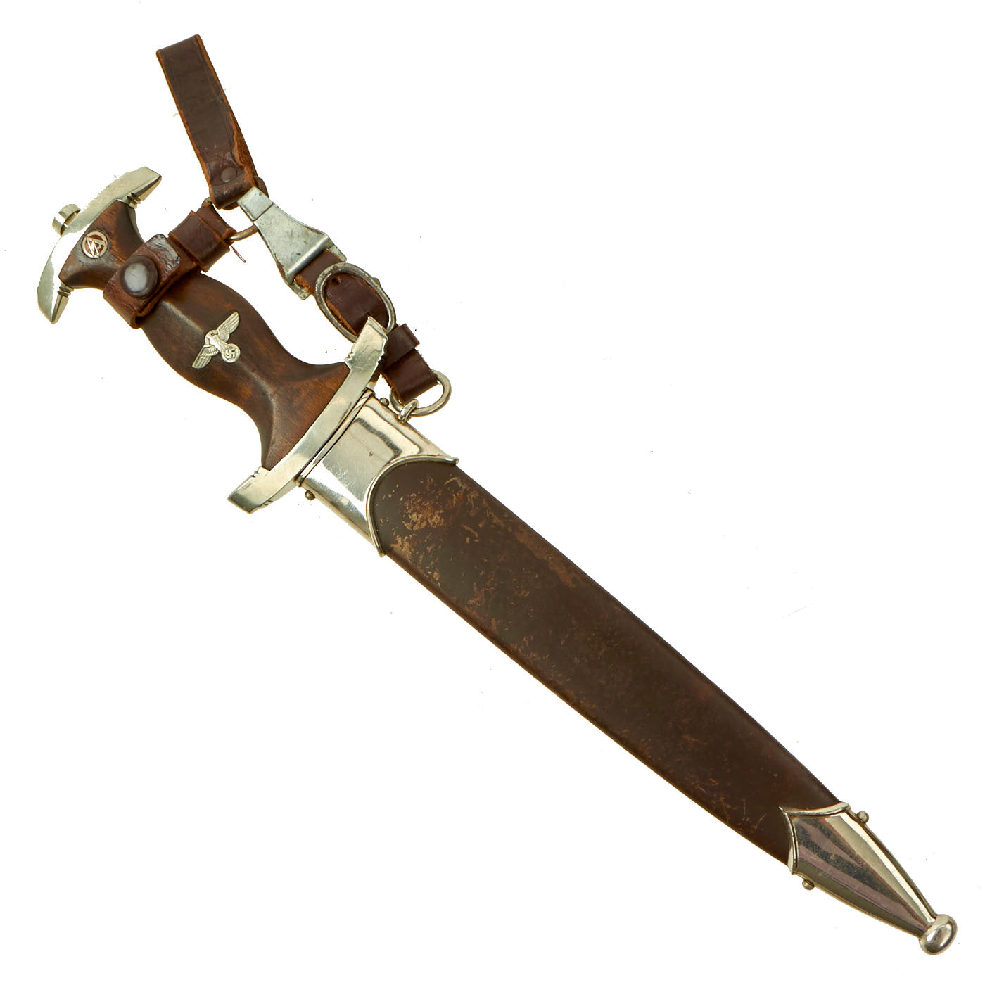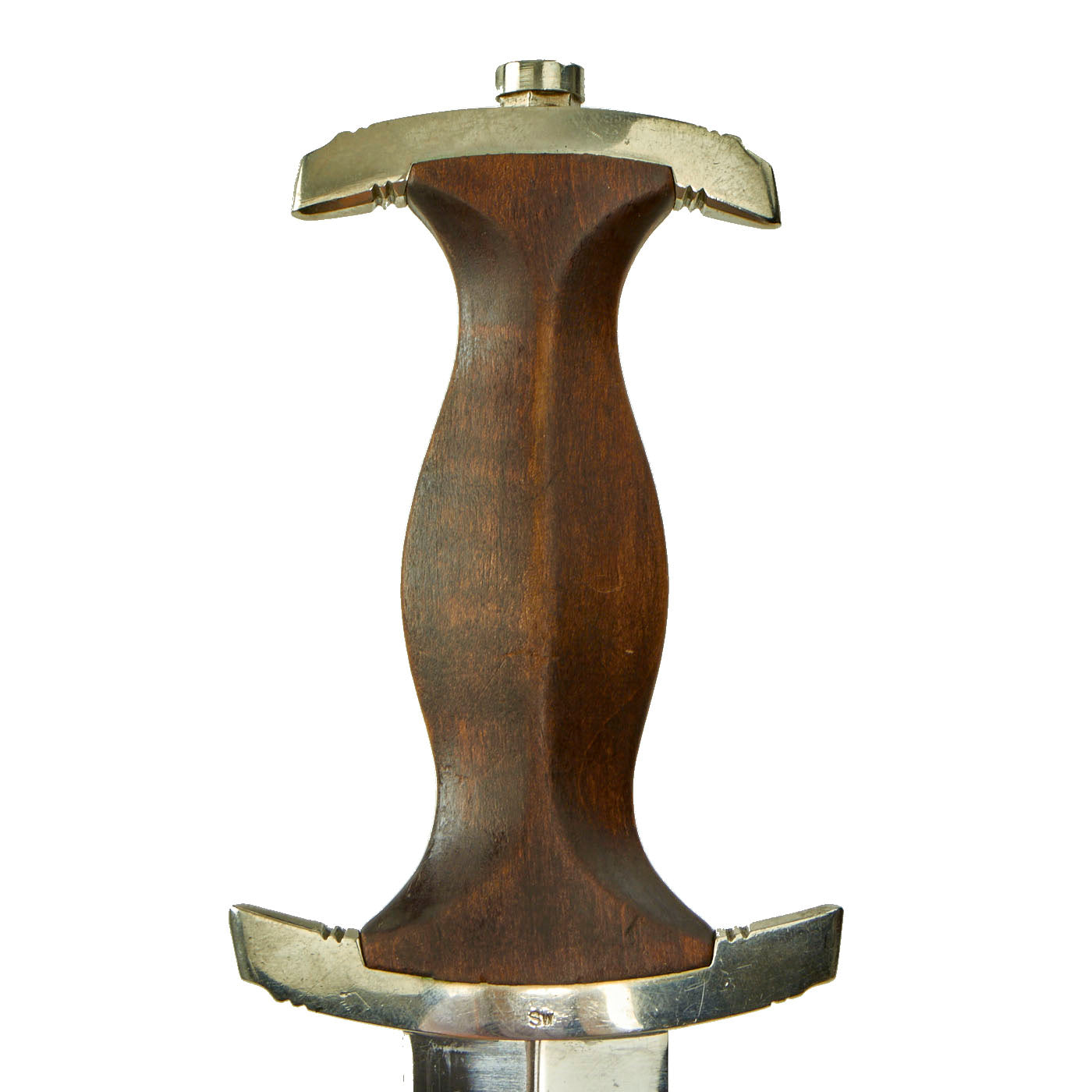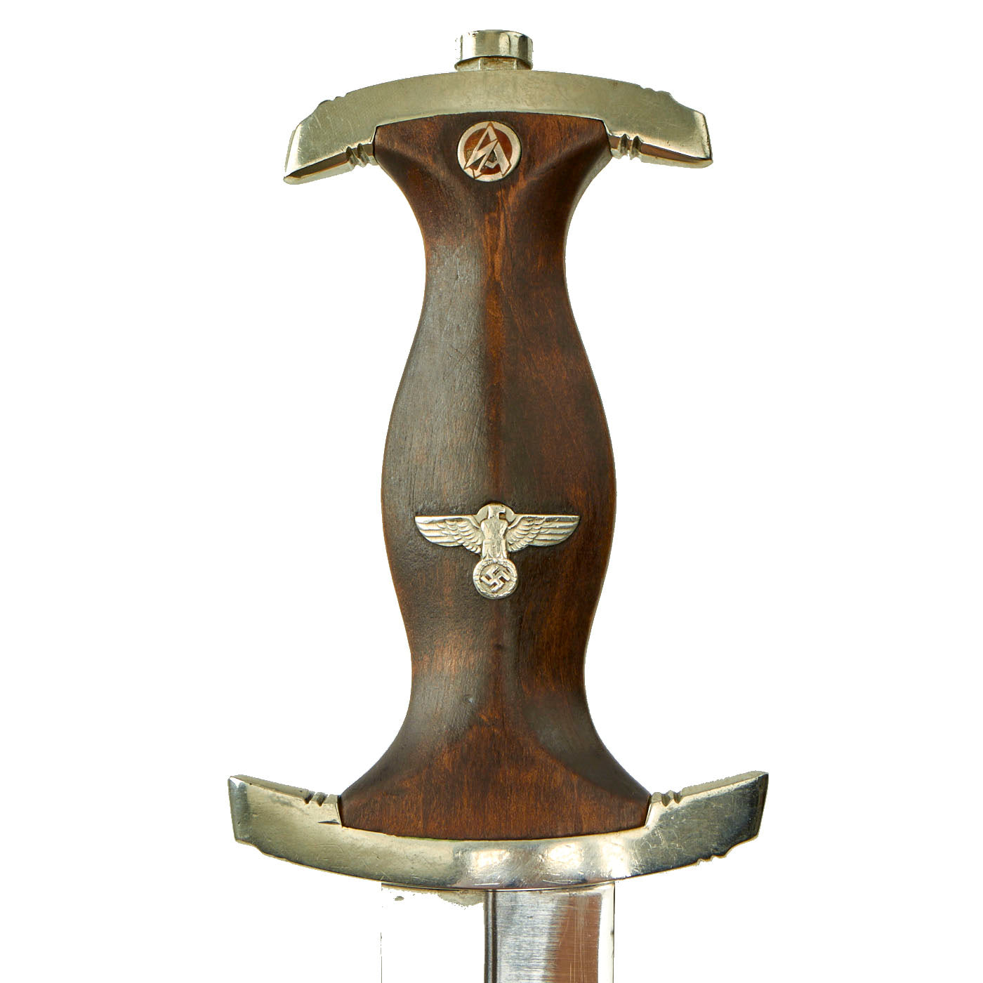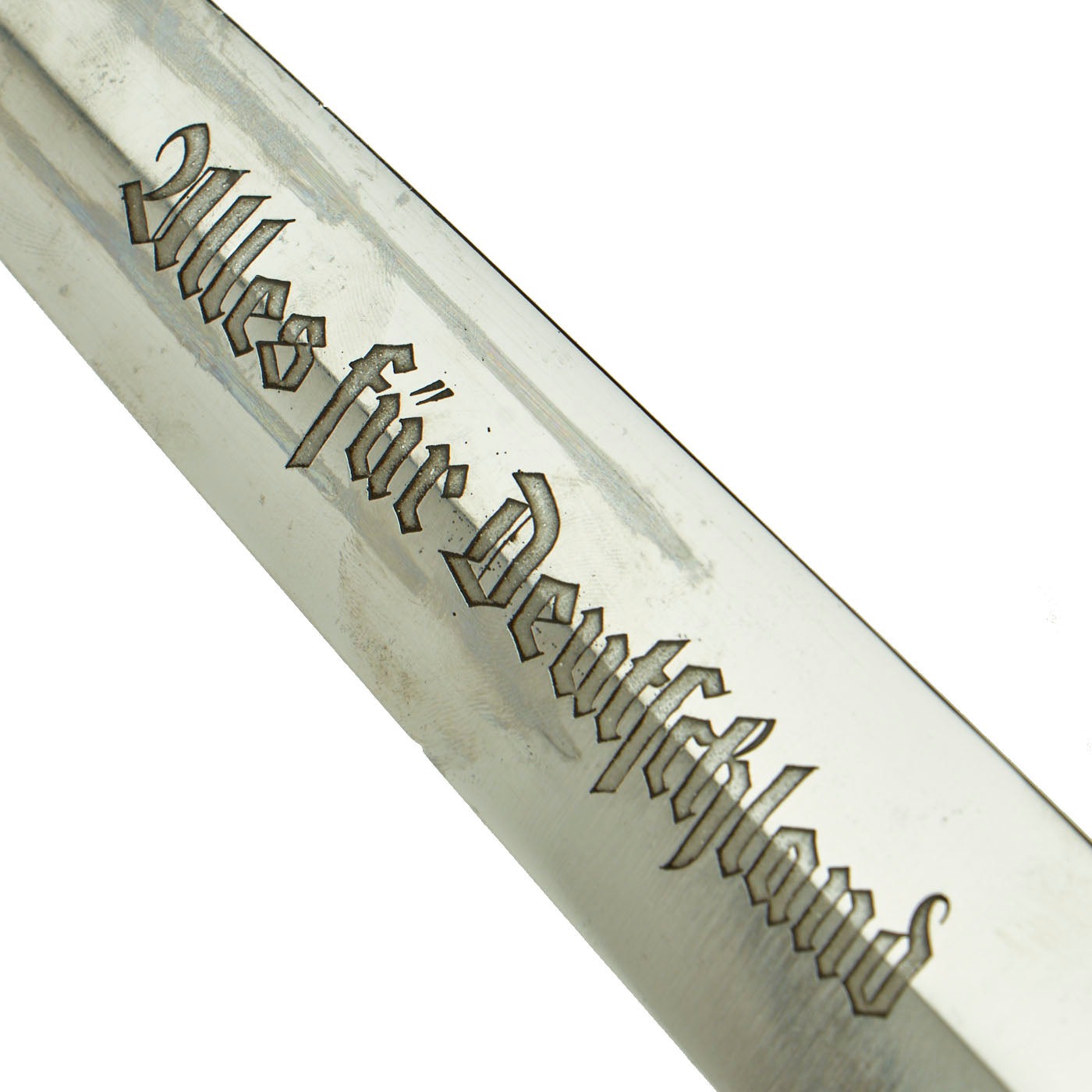The blade was etched with the SA motto, Alles für Deutschland. Examples produced prior to 1935 were stamped with the German sector of the SA group on reverse lower crossguard. Later examples underwent standardization through the RZM ministry. These pieces were produced of cheaper plated zinc-base fittings and scabbards were simply painted brown.