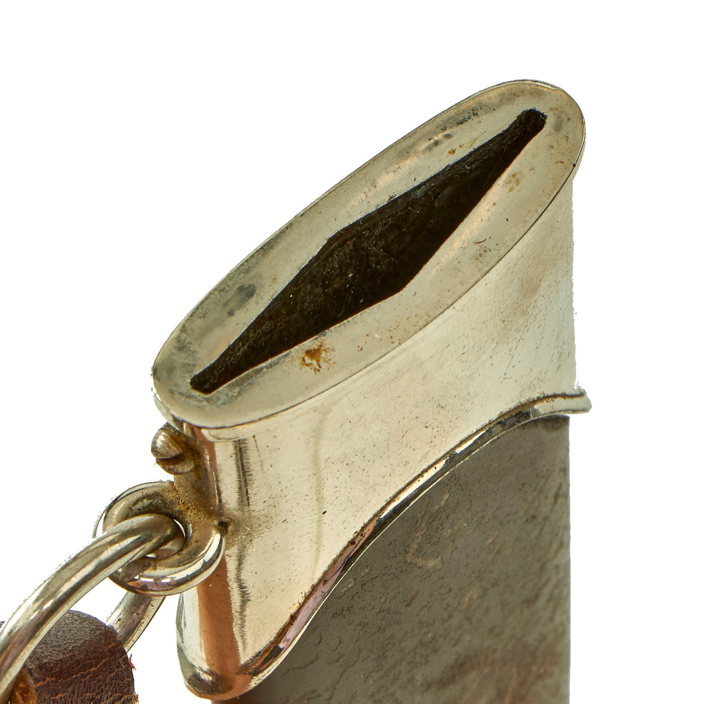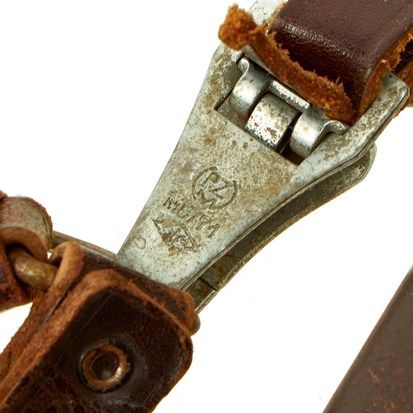 The attached three piece belt hanger is in good condition, though the leather is somewhat shrunken and worn. There is also some cracking of the brown finish, though overall the leather is still supple, with no major tears, and overall in solid condition. The plated steel spring clip is (RZM) marked M5/71 over olc in a diamond, for Overhoff & Cie. of Lüdenscheid, who produced numerous clothing accessories.