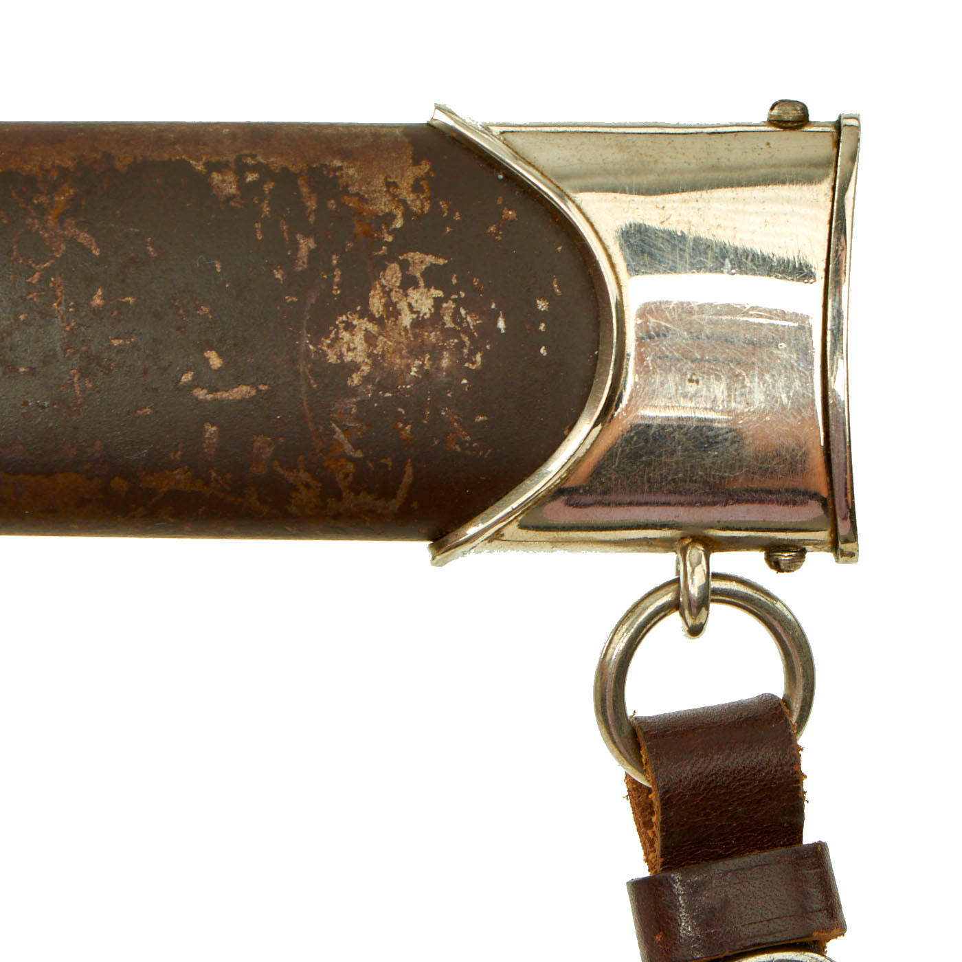 The scabbard on this example has been replaced with a mid-late war pattern example, probably when the original was lost or damaged. The steel shell is straight throughout and still has a lot of the original paint present, though it is definitely worn and checked from use and age. There is some paint chipping, with the scabbard body now oxidized where the paint is missing. The scabbard shell is fitted with fine nickel-plated steel mounts, which show only minor oxidation and wear. They nicely match the crossguards and are complete with all four dome head screws.