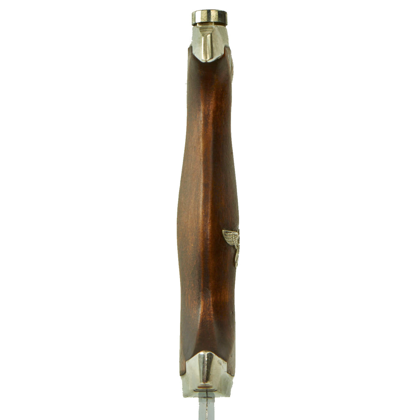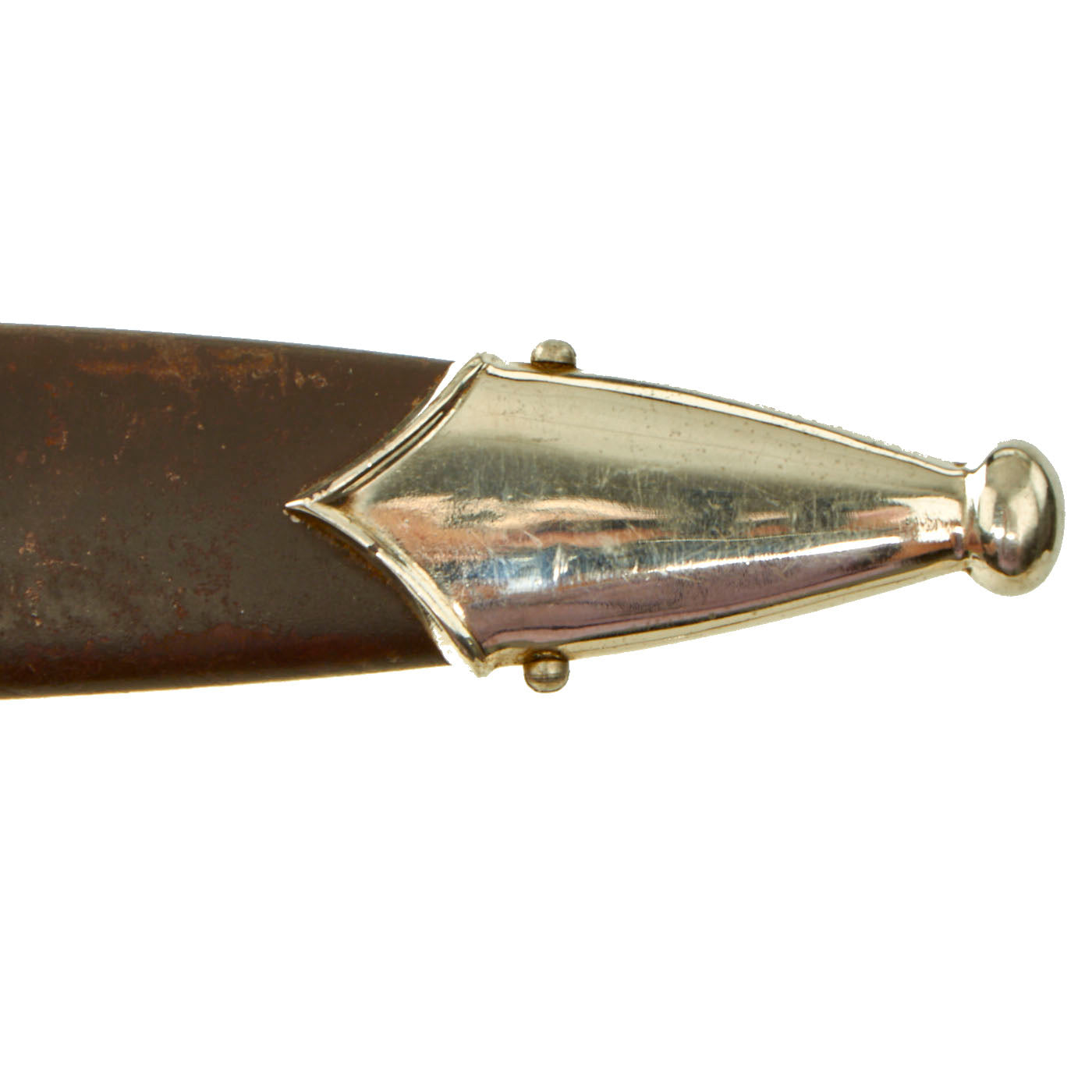 The dagger has solid nickel silver fittings throughout, and is a really nice example. The cross guards and tang nut are in very good condition throughout with all fittings having a nice aged patina. The lower reverse guard is Gruppe/Gau marked Sw ,for Sudwest (South West) a district in far South West Germany, with the principal city being Stuttgart. This feature was only seen on daggers produced 1935 and prior.