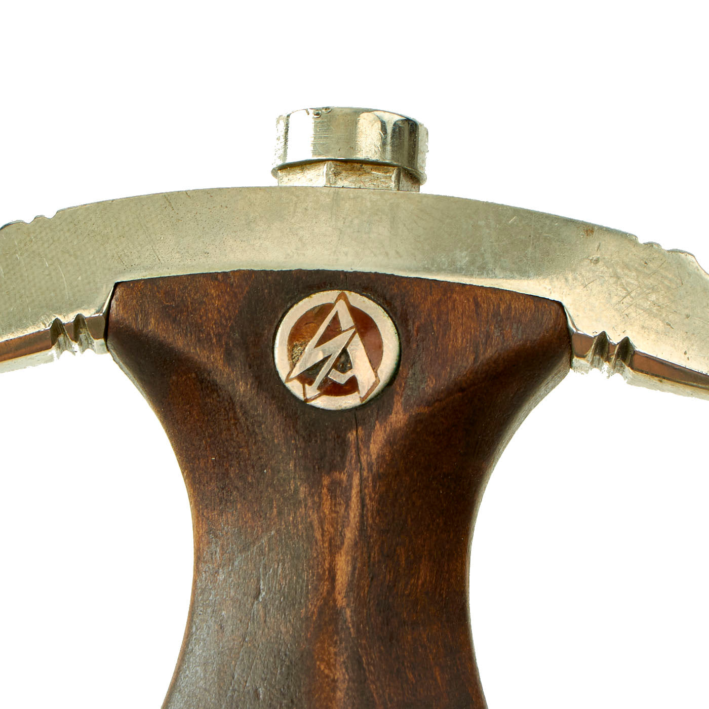 Original Item: Only One Available. This is a great early pattern SA Dagger, made by the rare maker Aesculap-Werke AG of Tuttlingen, a company much more known for their surgical instruments than their blades. They only made these daggers for a short period of time, as the company was much more needed for its ability to make surgical instruments during the war, a business they continue to excel in. The dagger complete with an original later war scabbard, as well as a complete three piece leather belt hanger, which are quite rare to find. These have both the belt loop and a securing loop for the handle, which allows the dagger to hang vertically. We have only had a few of these previously.